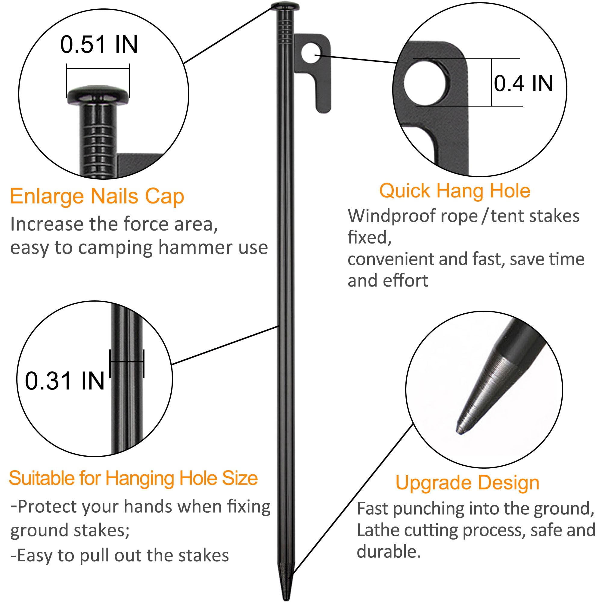 Upgraded Heavy Duty Camping Stakes: Made of high-quality forged S45C steel, completely get rid of the snapping and bending, more durability, they are corrosion resistance
