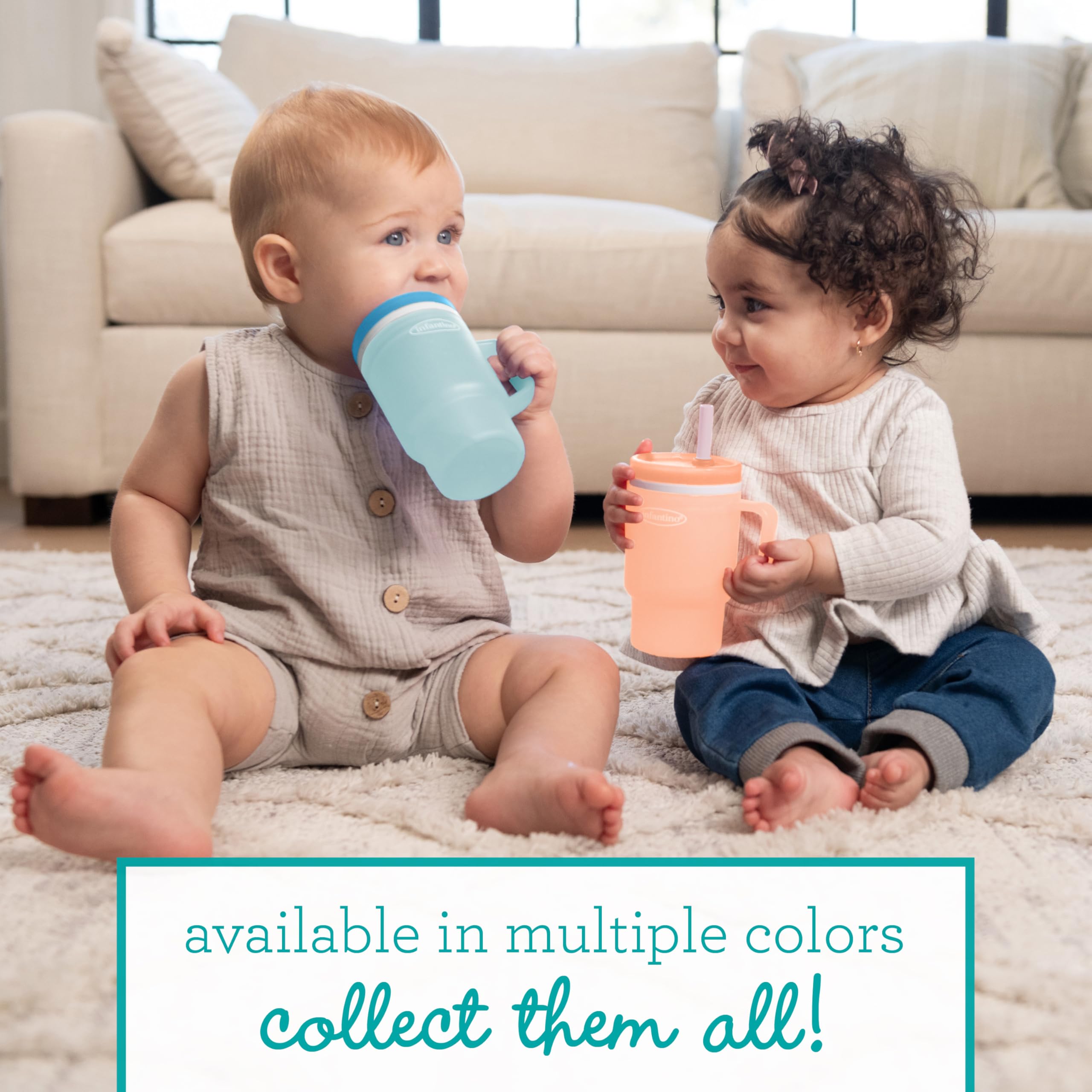 The Infantino My 1st Tumbler is a baby-friendly durable plastic sippy cup that looks just like Mom’s favorite tumbler – only perfectly sized for little hands. With a soft, flexible design and 10oz capacity, it’s made to help babies build sipping skills while feeling just like the grown-ups. Crafted from 100% food-grade, BPA-free plastic, this tumbler features a sturdy handle and a soft straw with an internal valve that allows smooth sipping and helps prevent spills – even when turned upside down. The no-pull-out straw stays secure for baby but comes apart easily for parents to clean. Perfect for water, milk, or juice, this baby tumbler fits most stroller and car seat cup holders and packs easily into a diaper bag. Dishwasher safe and made for everyday use, it’s a stylish, smart essential for keeping little ones hydrated wherever the day takes you.