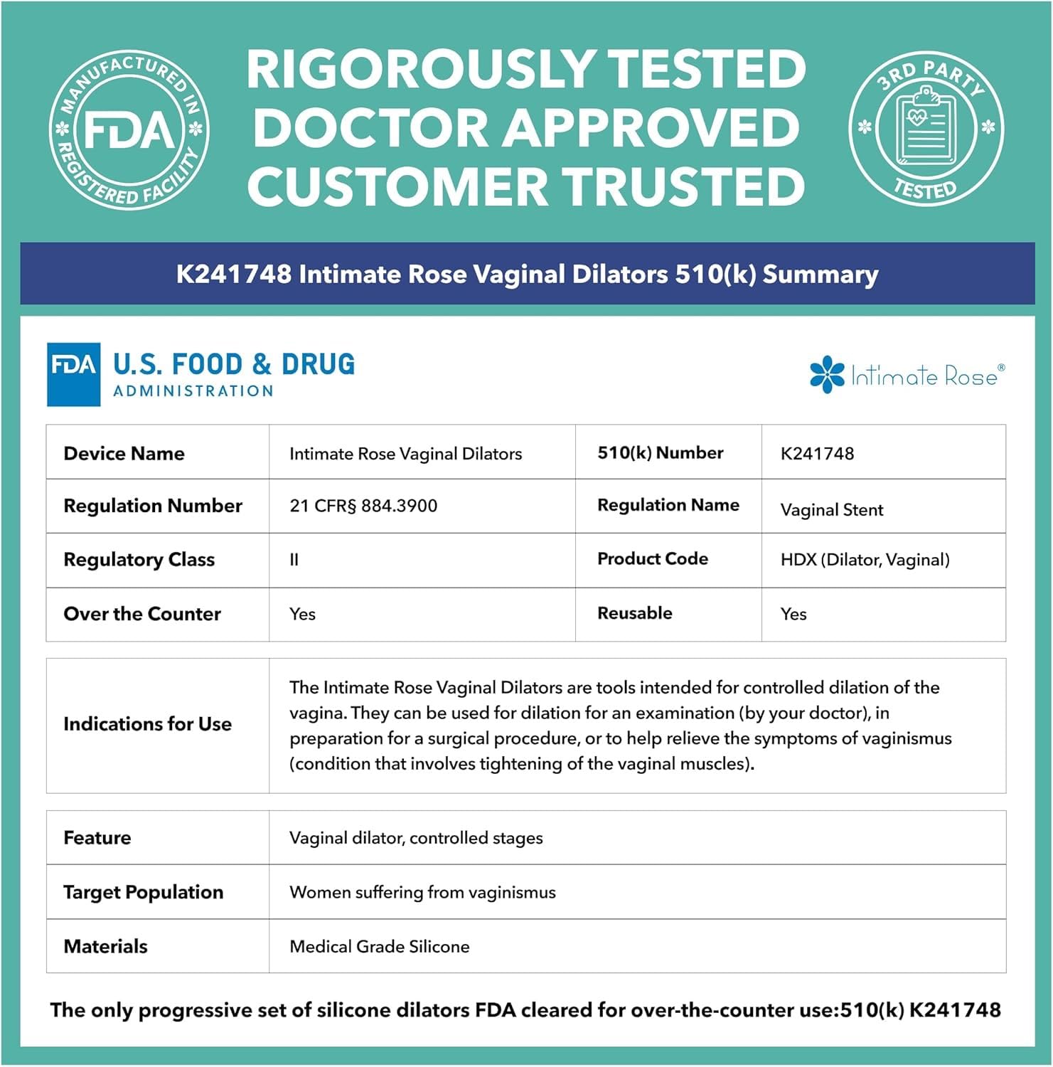 FDA-Cleared for Safe, At-Home Use: The only silicone vaginal dilators on Amazon with 510(k) OTC clearance (K241748). Trusted by clinicians for safe, effective vaginismus and pelvic floor therapy from the privacy of your home.