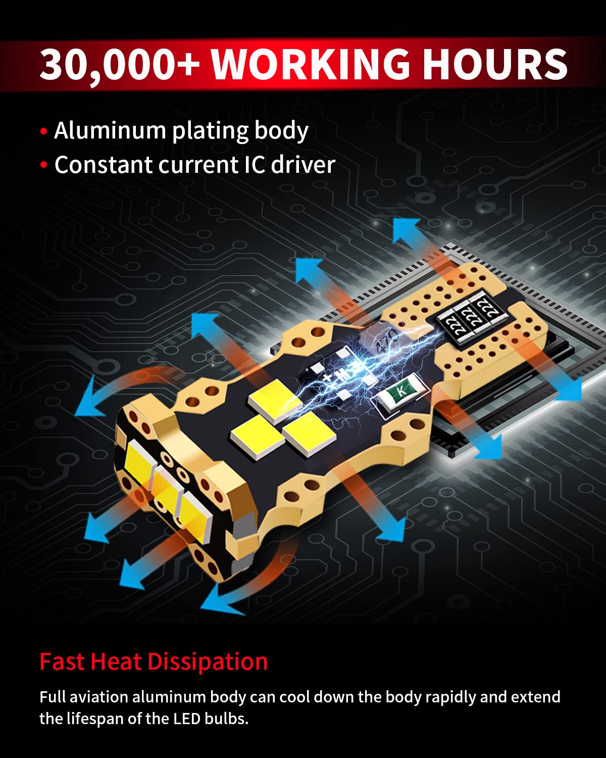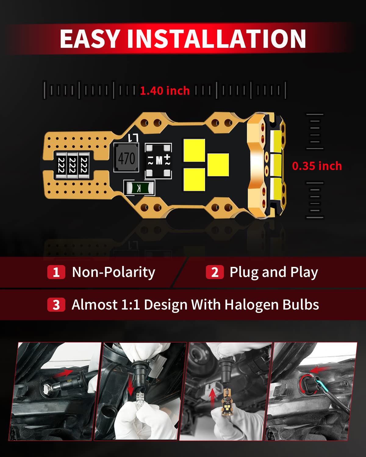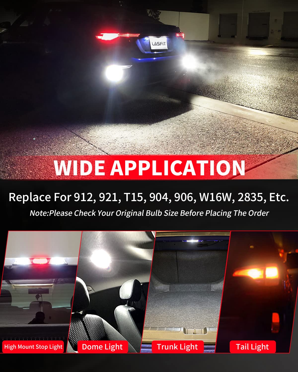【Easy to Install】Designed to replace halogen bulbs, this LED is a perfect 1:1 fit. It's non-polarity, meaning no need to worry about positive or negative connections—just plug it in and you're good to go. It fits a wide range of sockets like 921, 912, T15, 906, 904, 902, 922, W16W, and more. It's ideal for reversing lights, backup lights, and truck cargo lights. The bulb size is 0.35" x 1.4".