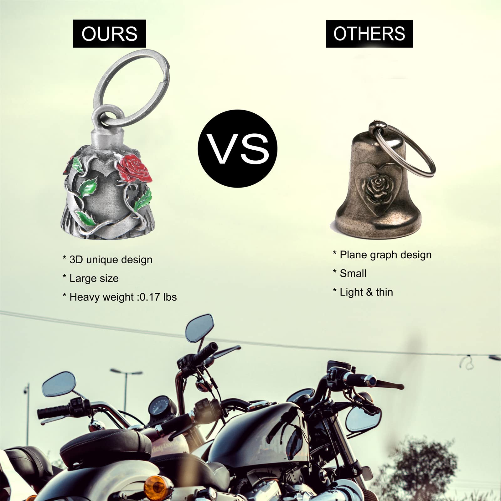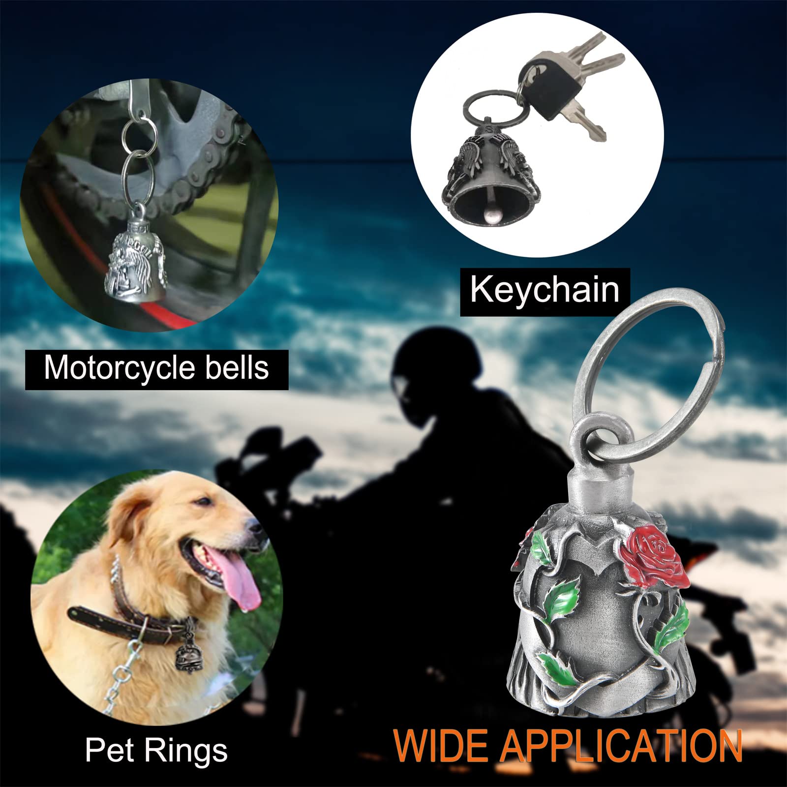 Multi use:This biker bells are multi usage, it could be hang on motorcycle for safe and lucky, can hang on pet lease ,and can be a keychain for luck.