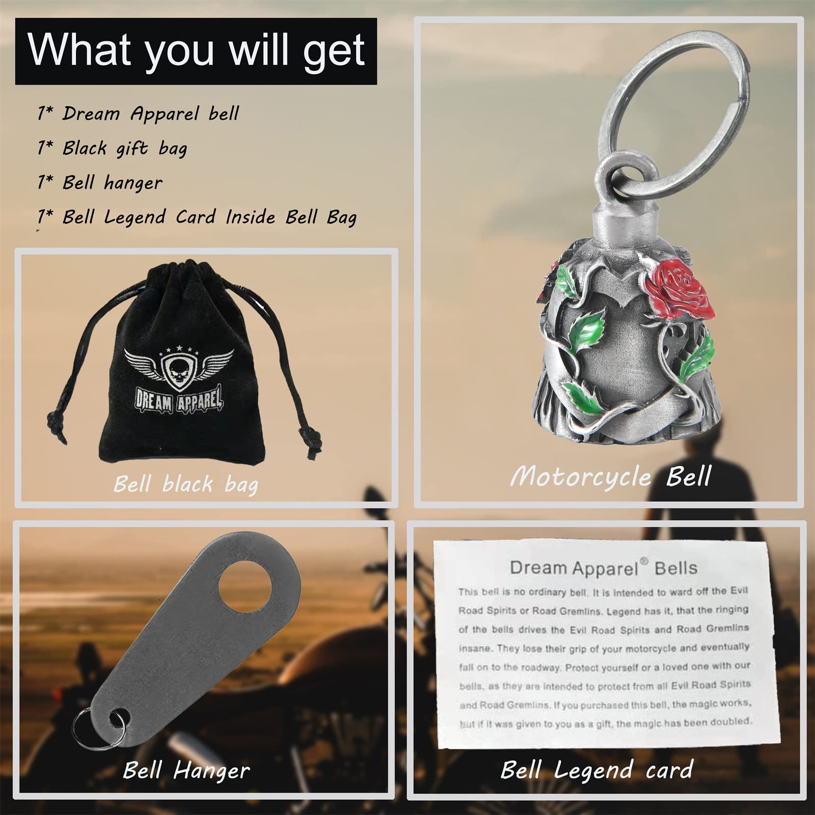 Large & Heavy:Each luck bell comes with 1 hanger+1 black gift bag+1 Legend of the Dream Apparel Bell story card,Measures: 2.75" tall ring include, 1.18"bottom wide. and weight 0.17lbs,heavy motorcycle bell keeps more sturdy while riding.
