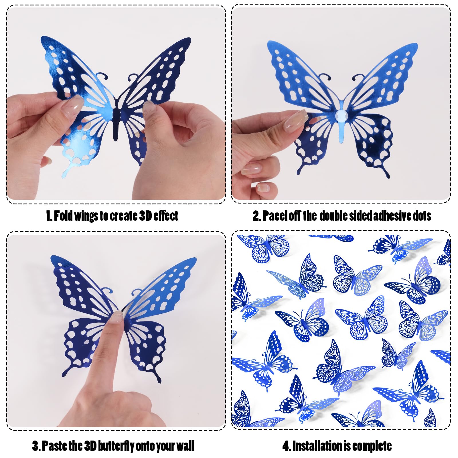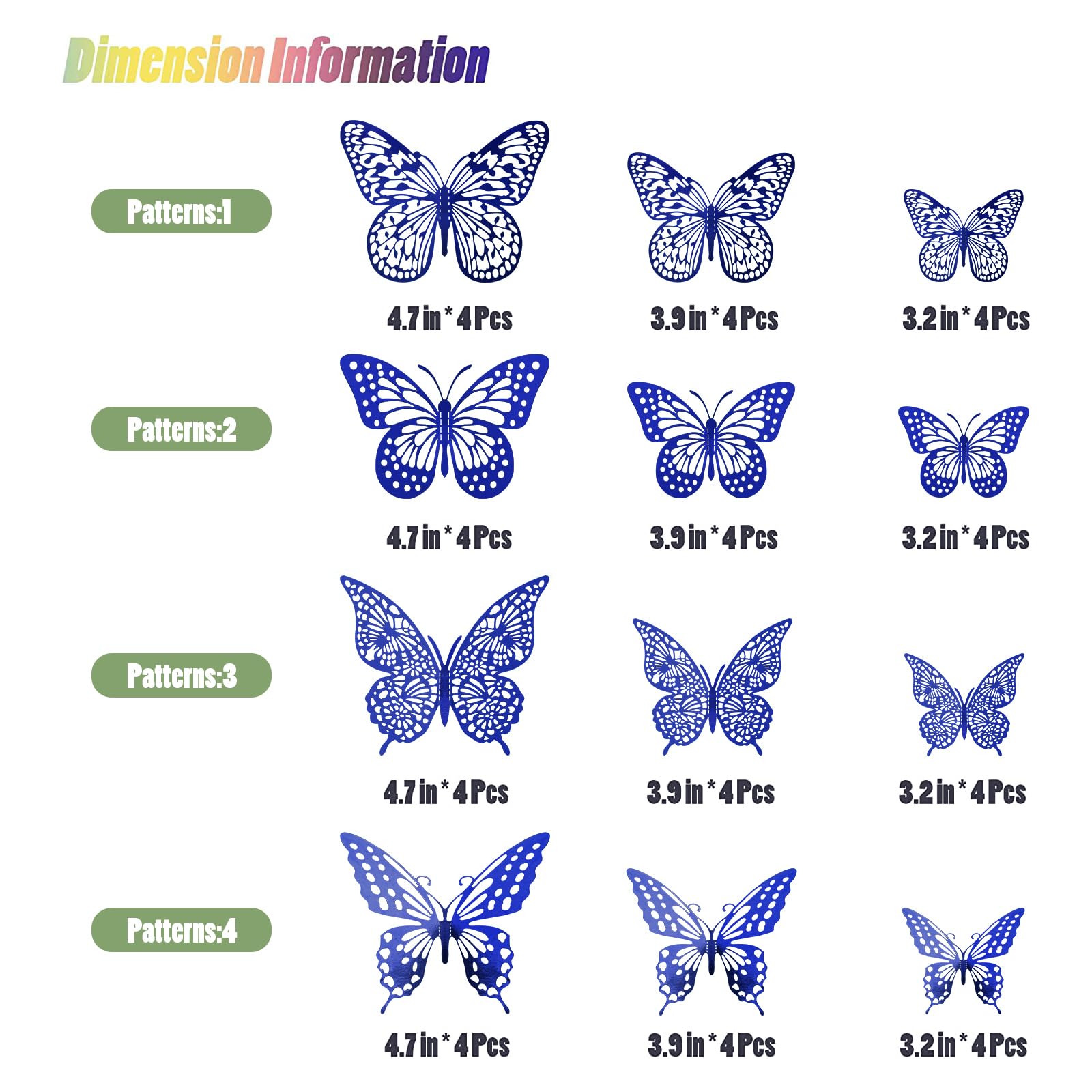 【Package Included】48 pcs butterflies: 12 pcs Style 1, 12 pcs Style 2, 12 pcs Style 3, 12 pcs Style 4, each style has 3 sizes(3", 4", 5"). Coming with 48 pcs double sided adhesive dots.