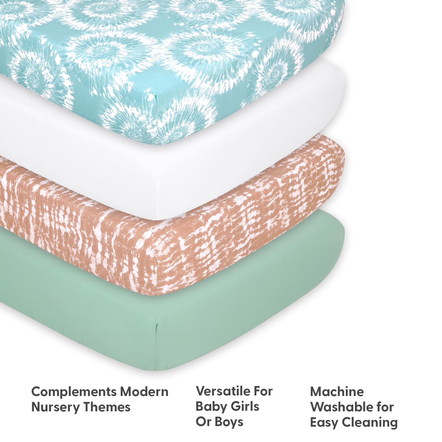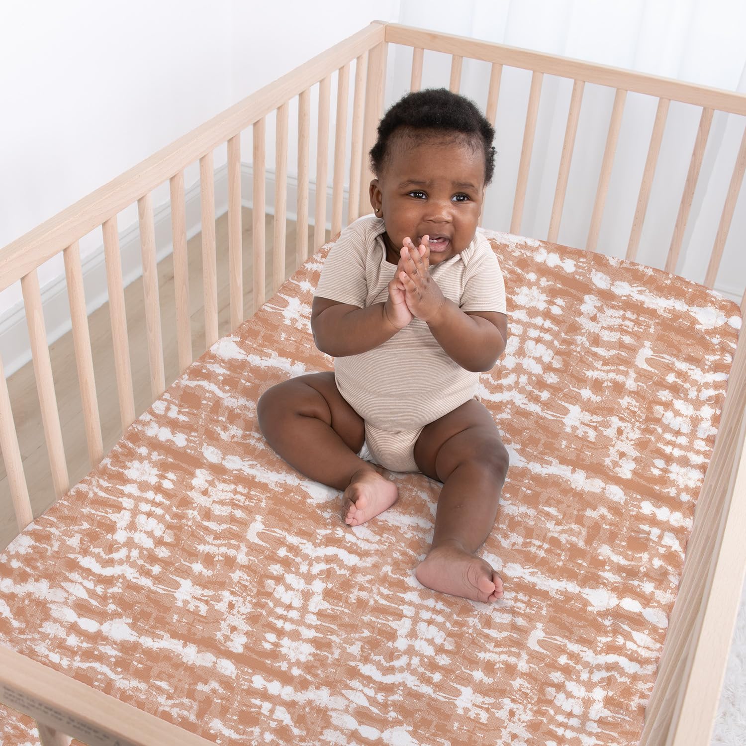 Boho Tie-Dye Crib: Featuring soothing teal and earthy brown tie-dye prints with soft white and sage accents, these crib sheets add playful charm and style to any nursery, making them optimal for both boys and girls and an ideal baby shower gift.