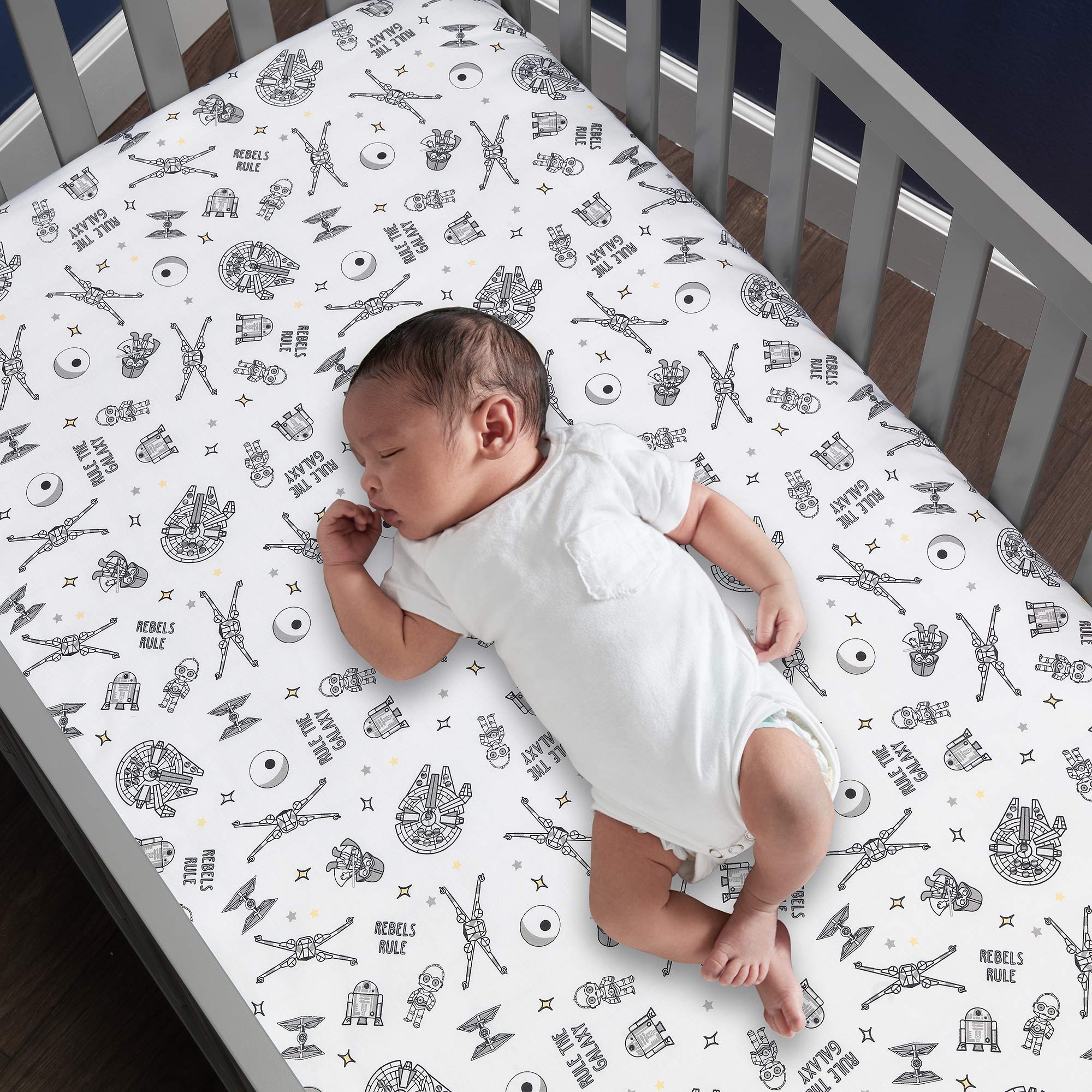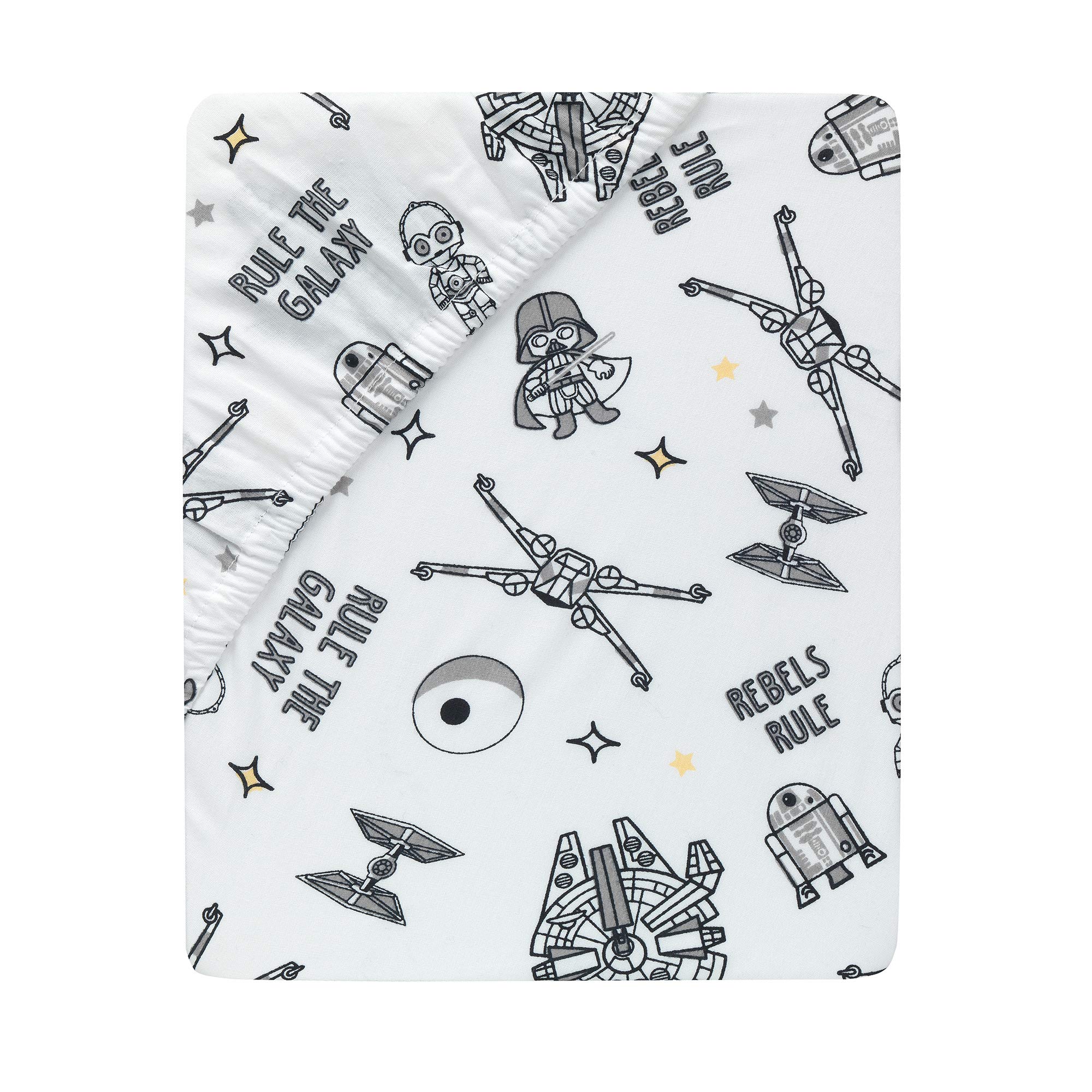 Your little padawan (Jedi in training) will love having this breathable 100% cotton fitted crib/toddler sheet. This intergalactic design features Darth Vader, R2D2, the Death Star, X-wings, Tie Fighters, stars, and the verbiage Rule the Galaxy and Rebels Rule. An officially licensed iconic Star Wars style printed sheet with everyoneβs favorite characters from across the galaxy. There is elastic all the way around ensuring a safe and secure fit on a standard size crib/toddler mattress measuring 28β x 52β. Machine washable for easy care.