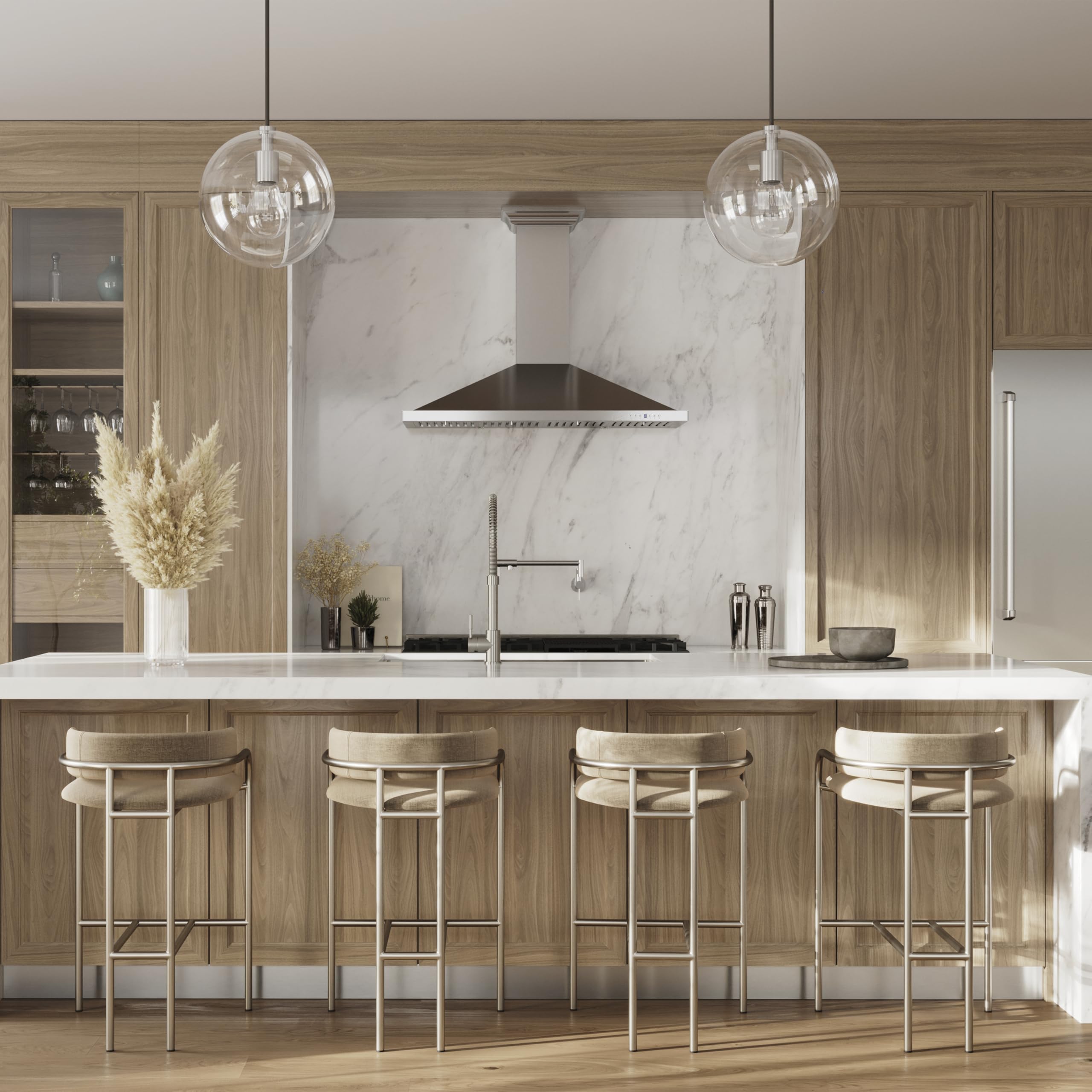 ZLINE 48 in. Wall Mounted Range Hood in Stainless Steel with Crown Molding. This wall mounted range hood is one of the best-selling of the 30 in. models. This beautifully hood with elegantly designed crown molding comes enhanced with a completely installed blower and fan, dishwasher-safe stainless steel baffle filters and a 4-speed push button control panel with an LCD display. Up to 760 CFM ventilation quietly, yet efficiently moves large volumes of air away from your cook-stove area. Short kits and extensions are available for shorter or taller ceilings (outside the standard 8 ft. to 9 ft. range). Contains everything you need for easy installation and factory-tested assurance of performance along with a 3-year parts gives you the confidence that you will enjoy this range hood for years to come. Includes a free LED light upgrade.
