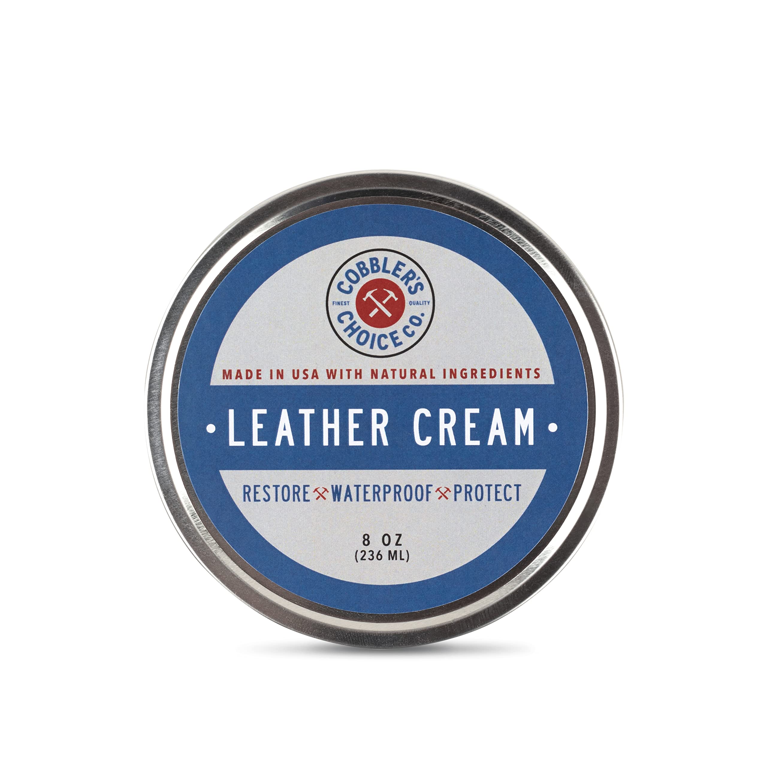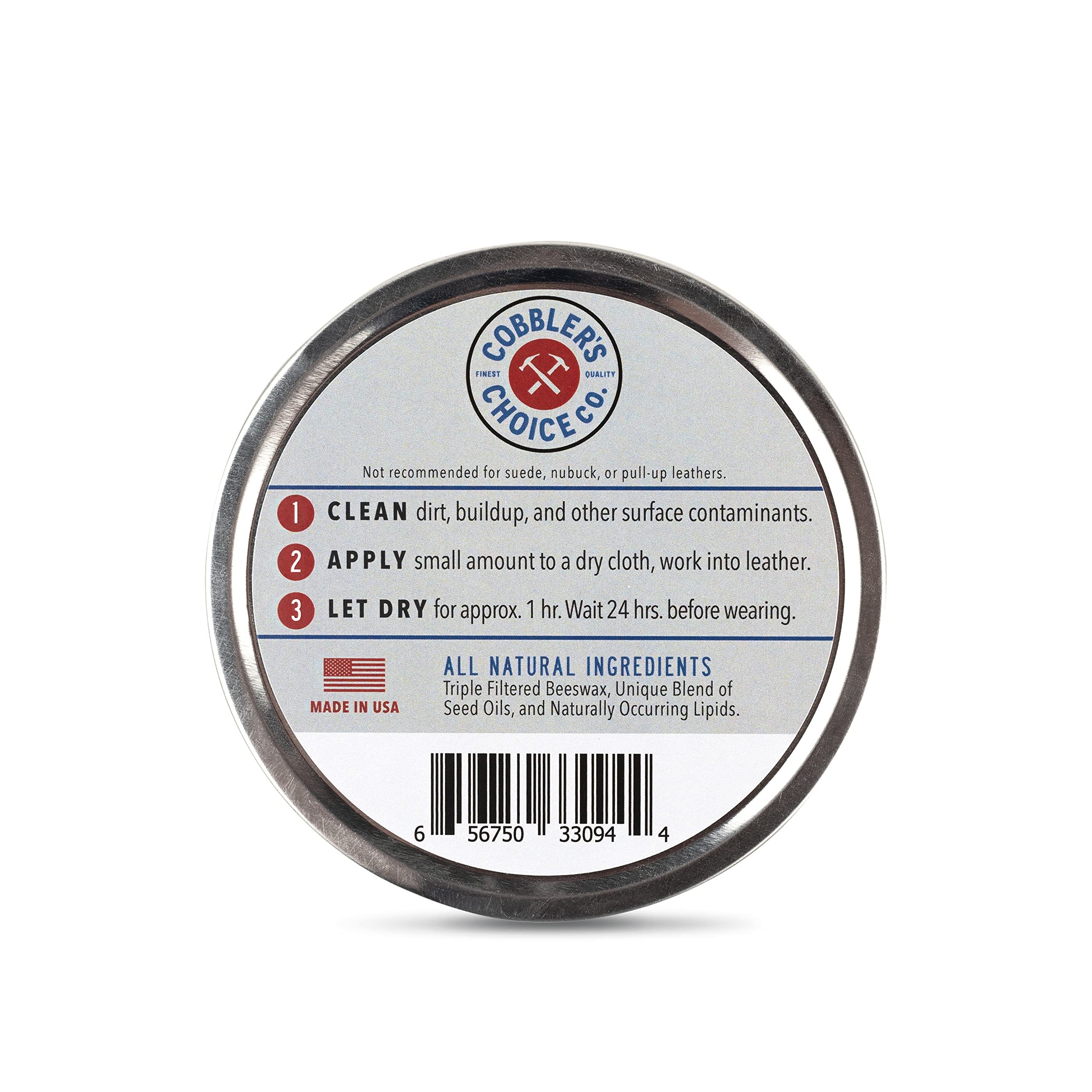 Description The Cobbler's Choice Leather Cream is made with 100% All-Natural Ingredients including triple filtered beeswax, a unique blend of seed oils, and naturally occuring lipids. The Triple Filtered Beeswax restores dry and cracked leather while applying a safe protective layer over the leather to protect it from the elements. The unique blend of seed oils and naturally occuring lipids provide a deep condition to the leather helping restore any dry, cracked, and scratched parts of the leather. Easy application, Directions on back of label. Keep your footwear looking good for years to come with the Cobbler's Choice Leather Cream.