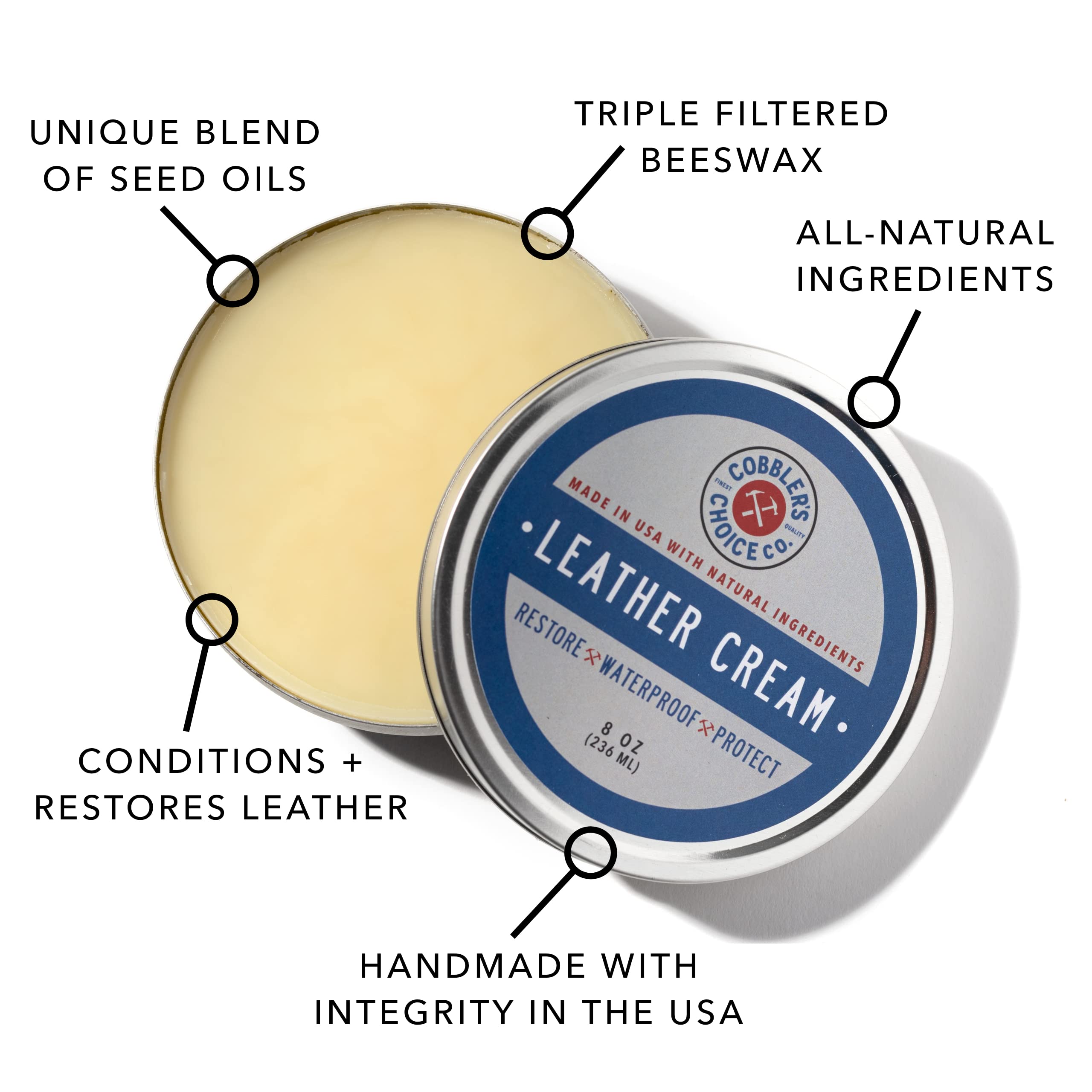 Formulated with All Natural Ingredients -- We pride in our All-Natural Leather Cream. Made with ingredients that are safe for both you and your leather -- Cobbler's Choice is the brand trusted by experts for unbeatable quality and clean ingredients.