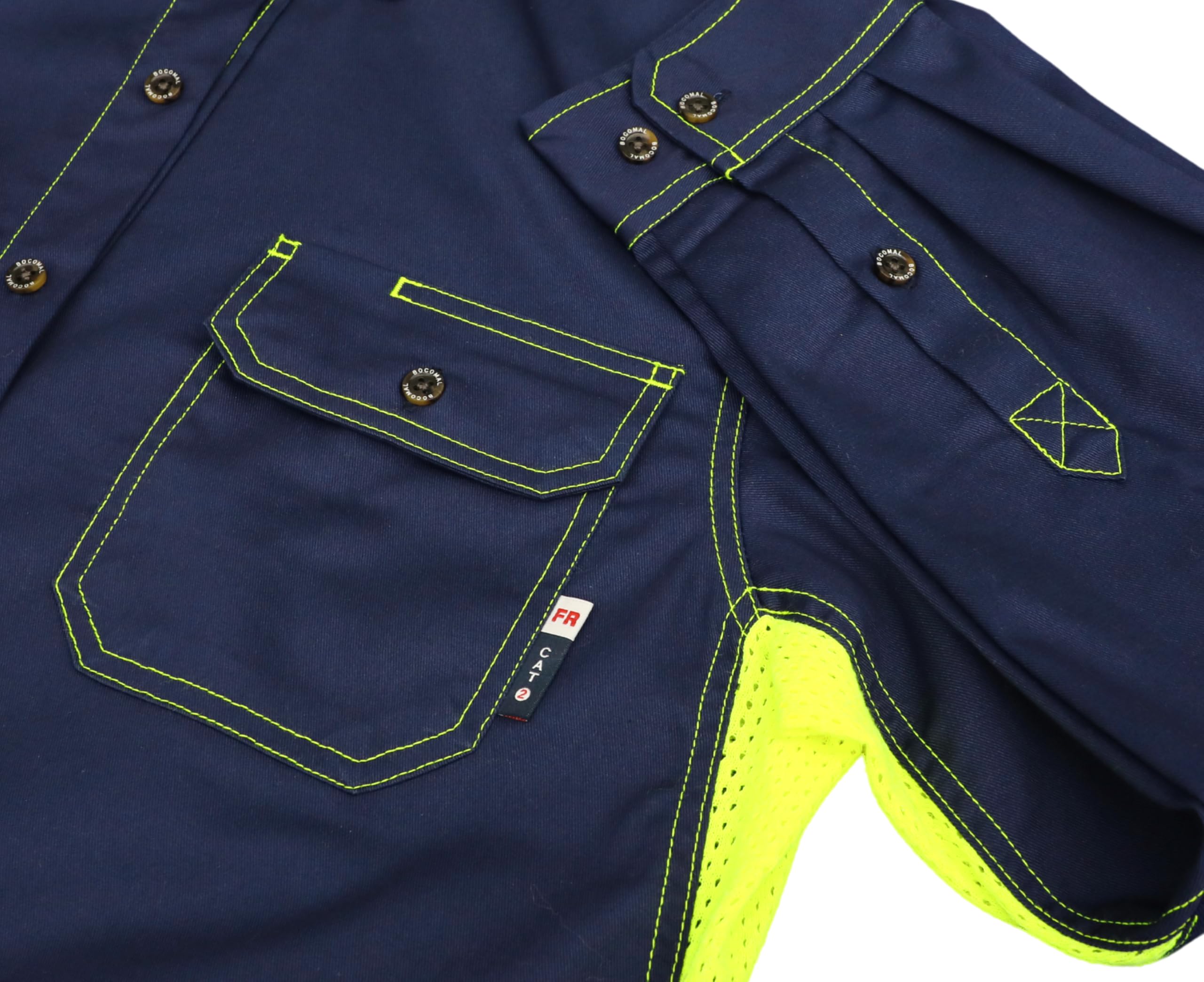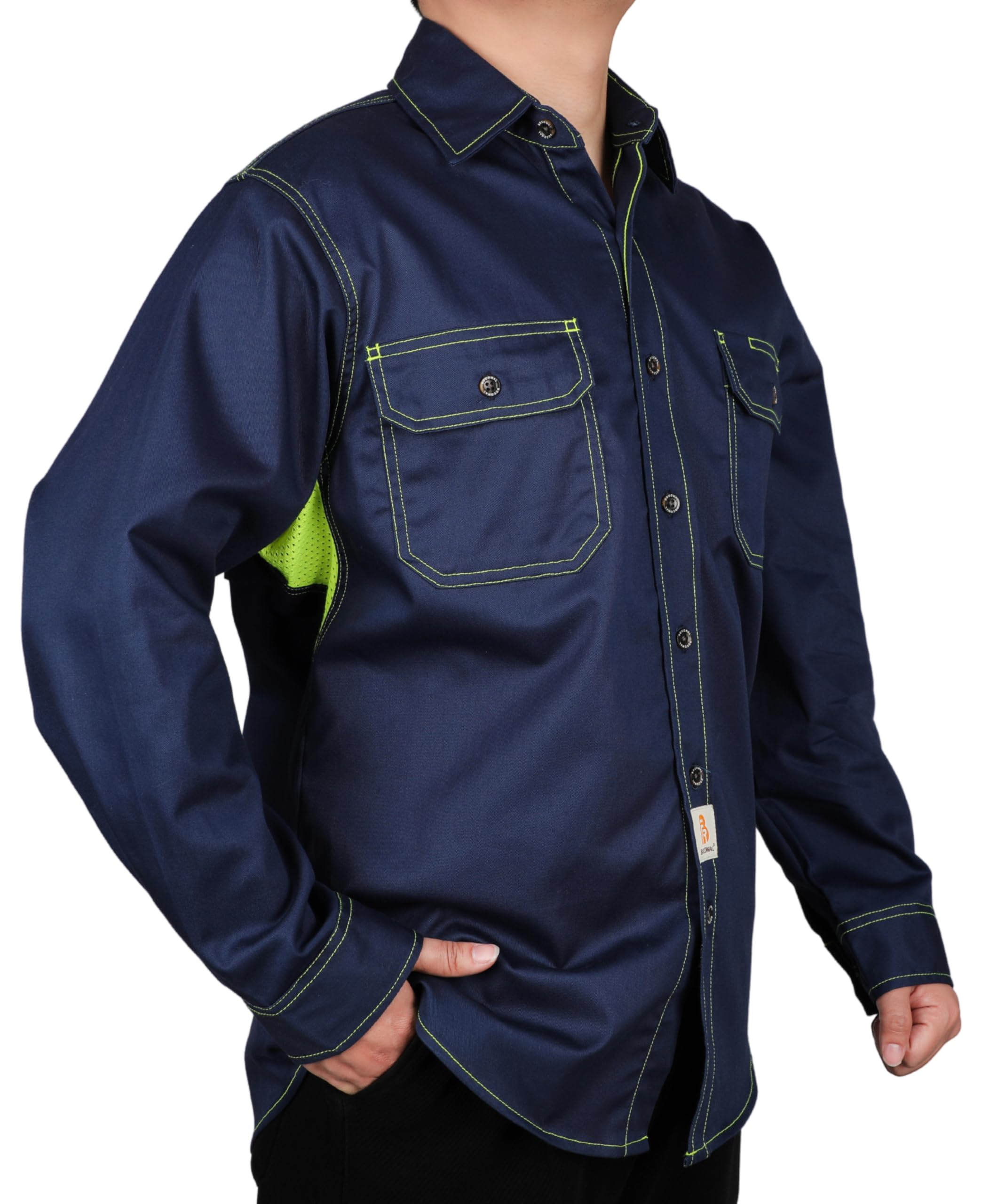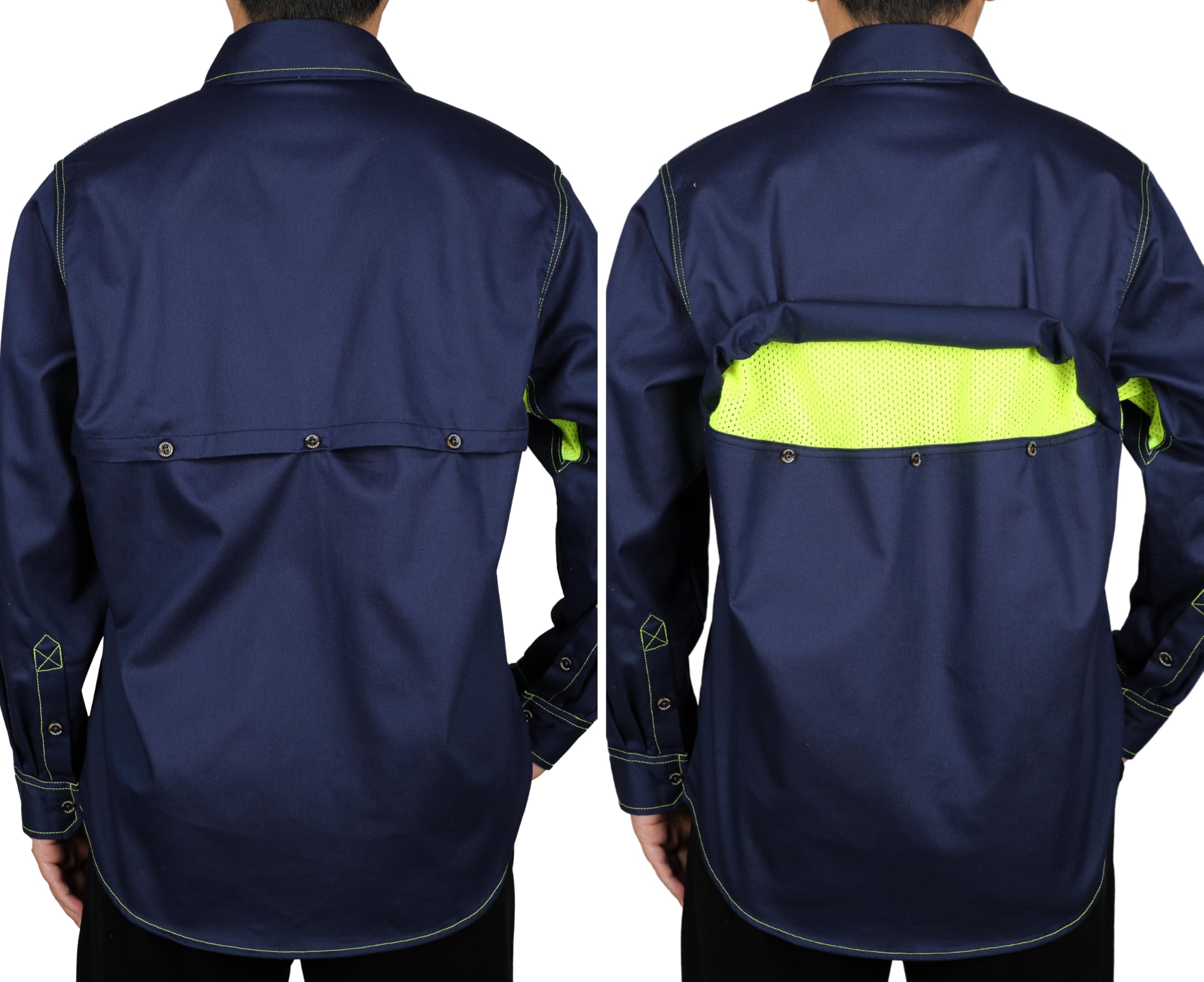 This Men's Flame-Resistant summer work whirt is built for safety and comfort on the job.Designed with breathable Vented mesh panels under the arms and back(button clousure) for better airflow, it keeps you cool during tough tasks in summer hot days.Made from lighgtweight 6.5 oz 100% cotton fabric,Modacrylic/Cotton Blend mesh,it offers reliable flame-resistant protection.The high-visibility yellow contrast mesh and stitching provide added safety in low-light conditions.