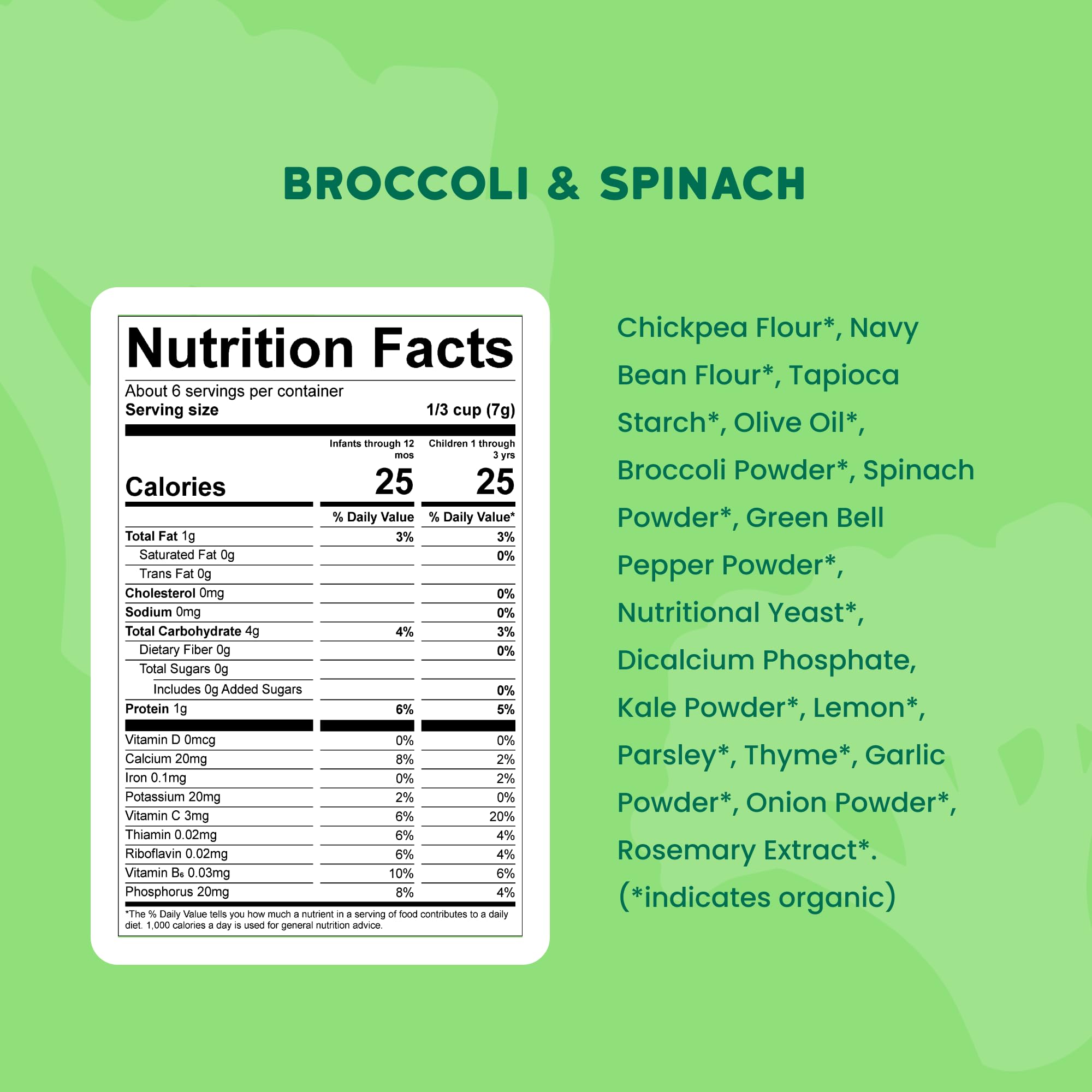 Fun and Flavor Fusion: Let your toddler explore the vibrant flavors of broccoli and spinach with each bite. These organic baby snacks are a delightful way to develop their palate without turning to sugary options