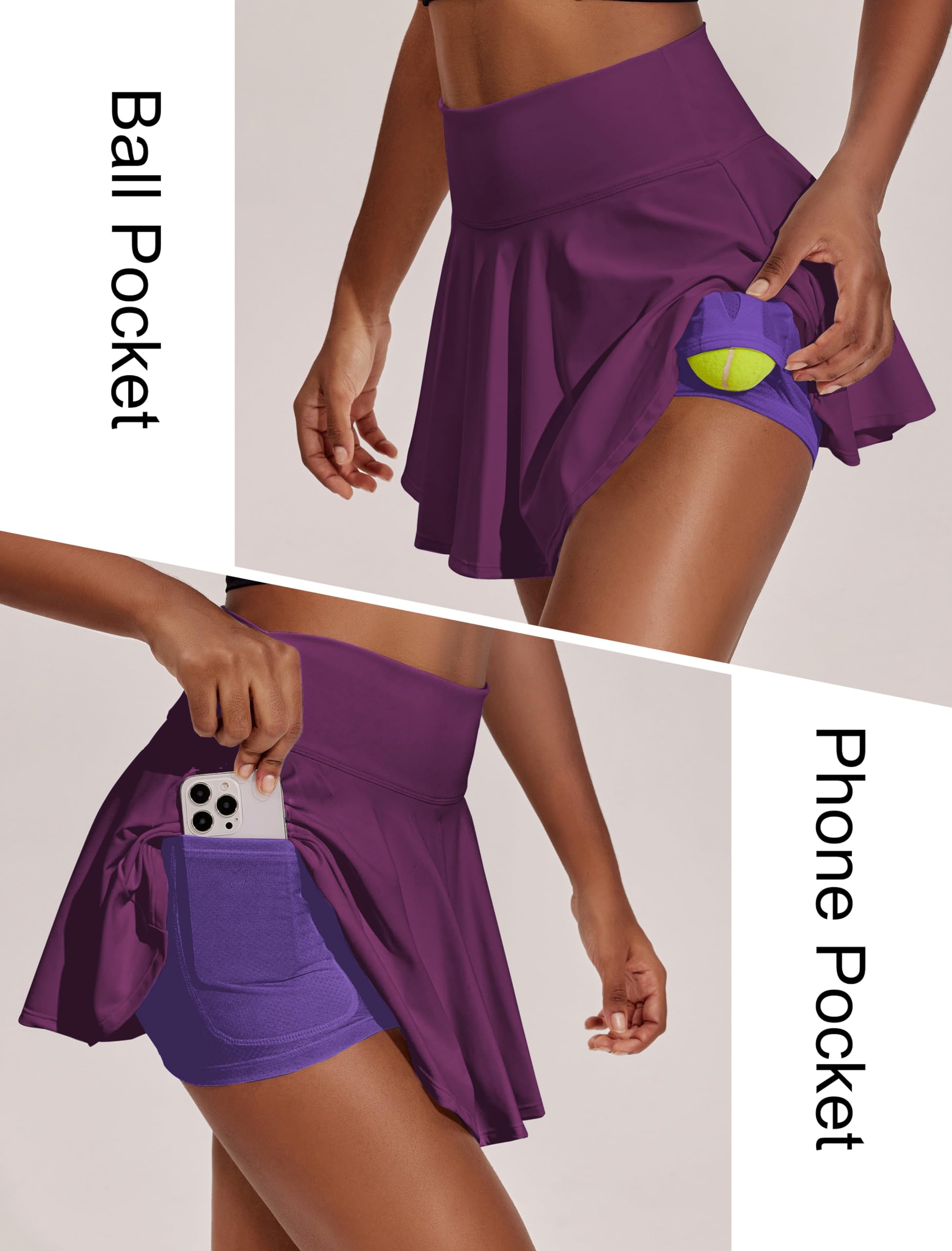 2 Pockets on Inner Shorts: The athletic skort features a built-in shorts liner with a left upside down pocket and a right phone pocket.