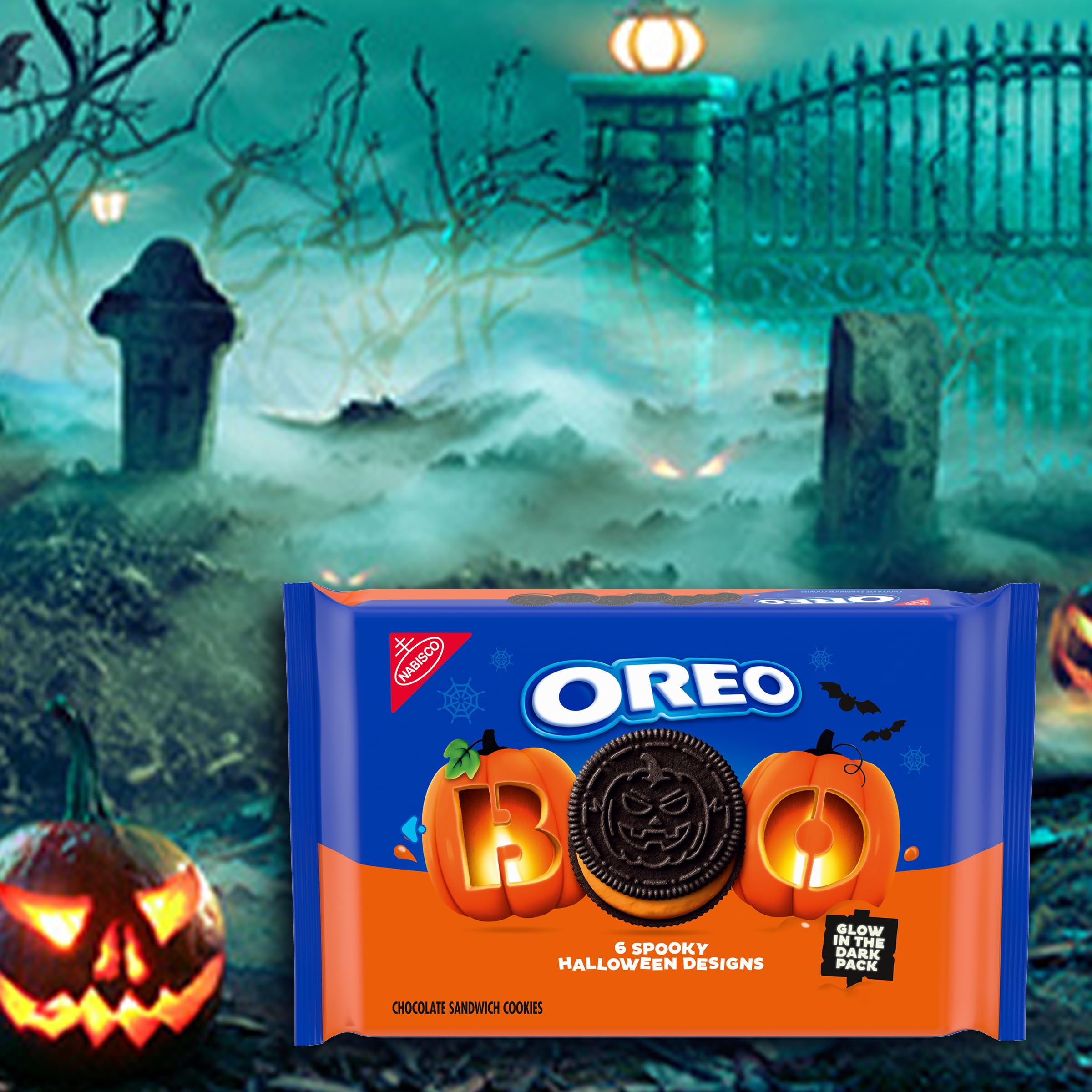 Certified kosher OREO cookies featuring random assortment of six spooky Halloween designs