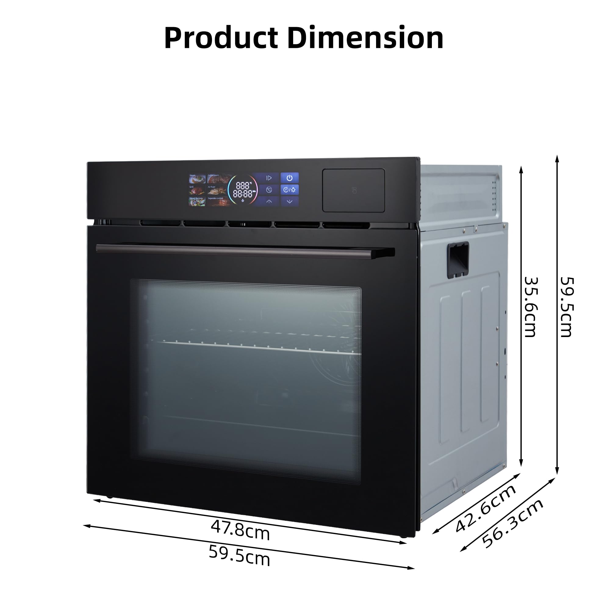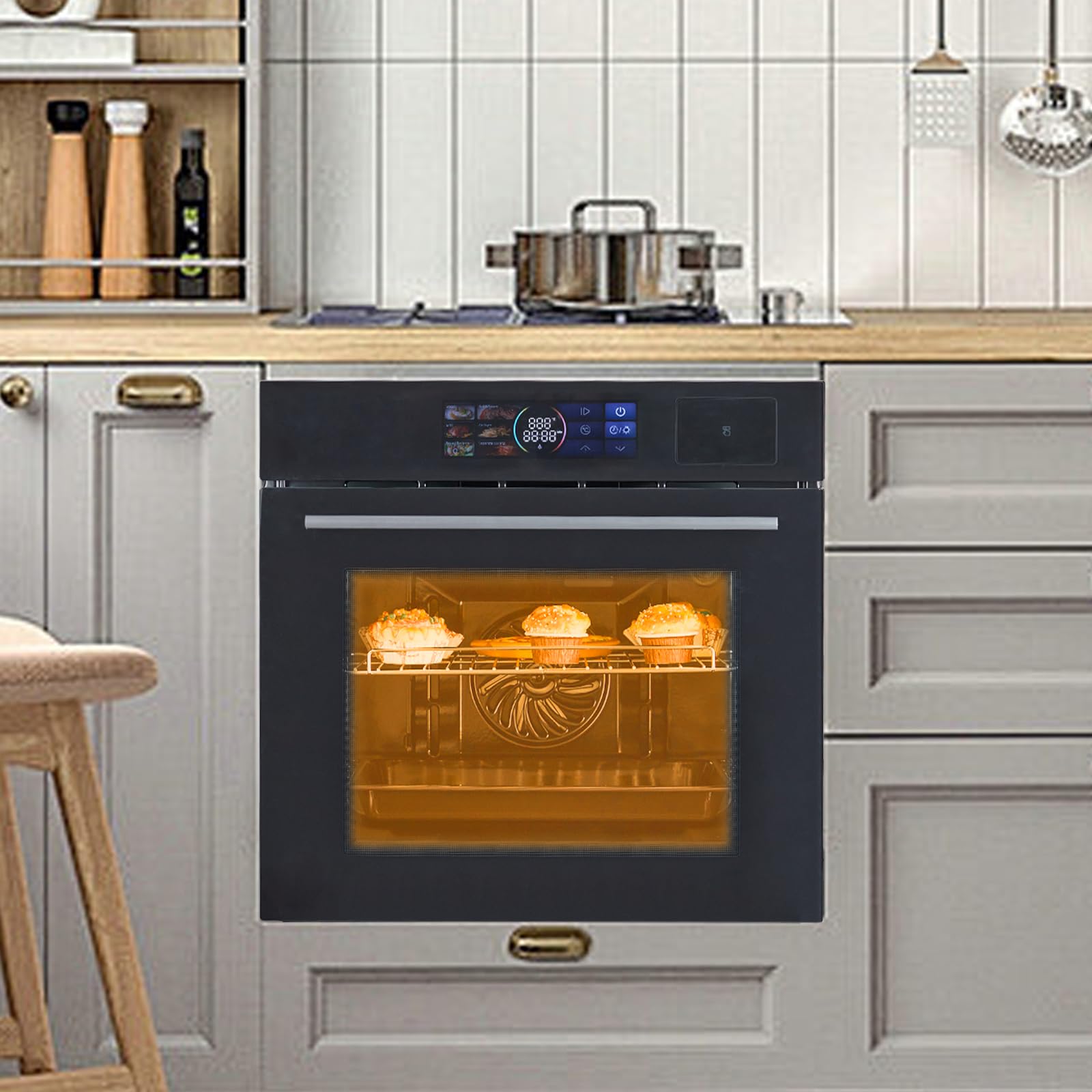 Spacious 2.5 Cu.ft Convection Oven: With a large 2.5 cubic feet capacity, this 24-inch built-in wall oven provides ample space for family meals. The powerful convection system circulates hot air evenly for faster preheating, uniform heat distribution, and perfectly baked or roasted results. 8 Smart Preset Cooking Modes: Easily choose from 8 automatic cooking functions including pizza, bread, cake, chicken leg, beef, toasting, warming, and insulation. Each mode has preset time and temperature, letting you cook a variety of dishes with just one touch. 360° Rotating Rotisserie Function: Enjoy restaurant-quality roasted meats at home with the built-in rotisserie feature. The 360° rotation ensures even browning and juicy tenderness, making it ideal for roasting chicken, turkey, or other meats. Smart Touch Screen & Timer Control: Full-color touch display provides intuitive operation with precise control over temperature, timer, and functions. A built-in timer with auto on/off setting and child safety lock offers both convenience and safety for your home. Easy to Clean & Sleek Design: Featuring an enamel interior and removable oven door, cleaning is quick and effortless. The stainless steel finish and tempered glass door give your kitchen a modern, polished look that stays clean and durable over time.