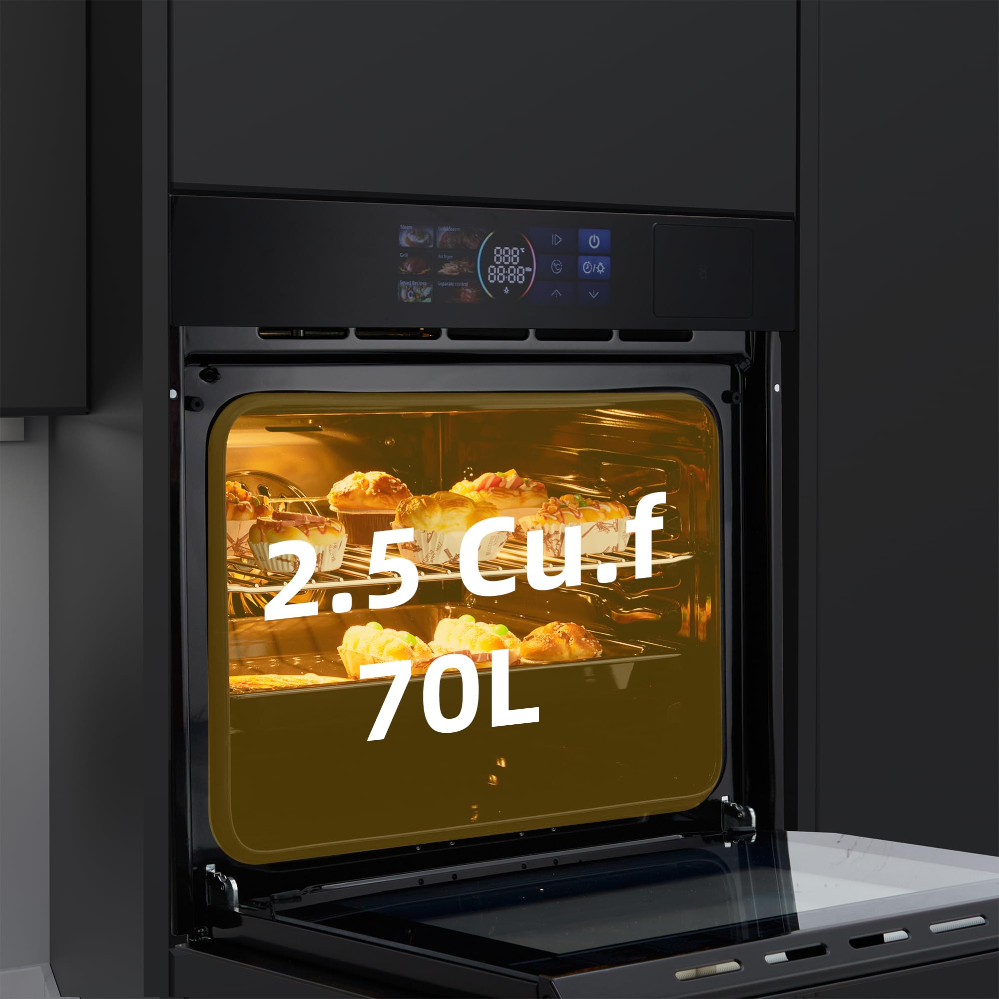 Spacious 2.5 Cu.ft Convection Oven: With a large 2.5 cubic feet capacity, this 24-inch built-in wall oven provides ample space for family meals. The powerful convection system circulates hot air evenly for faster preheating, uniform heat distribution, and perfectly baked or roasted results.