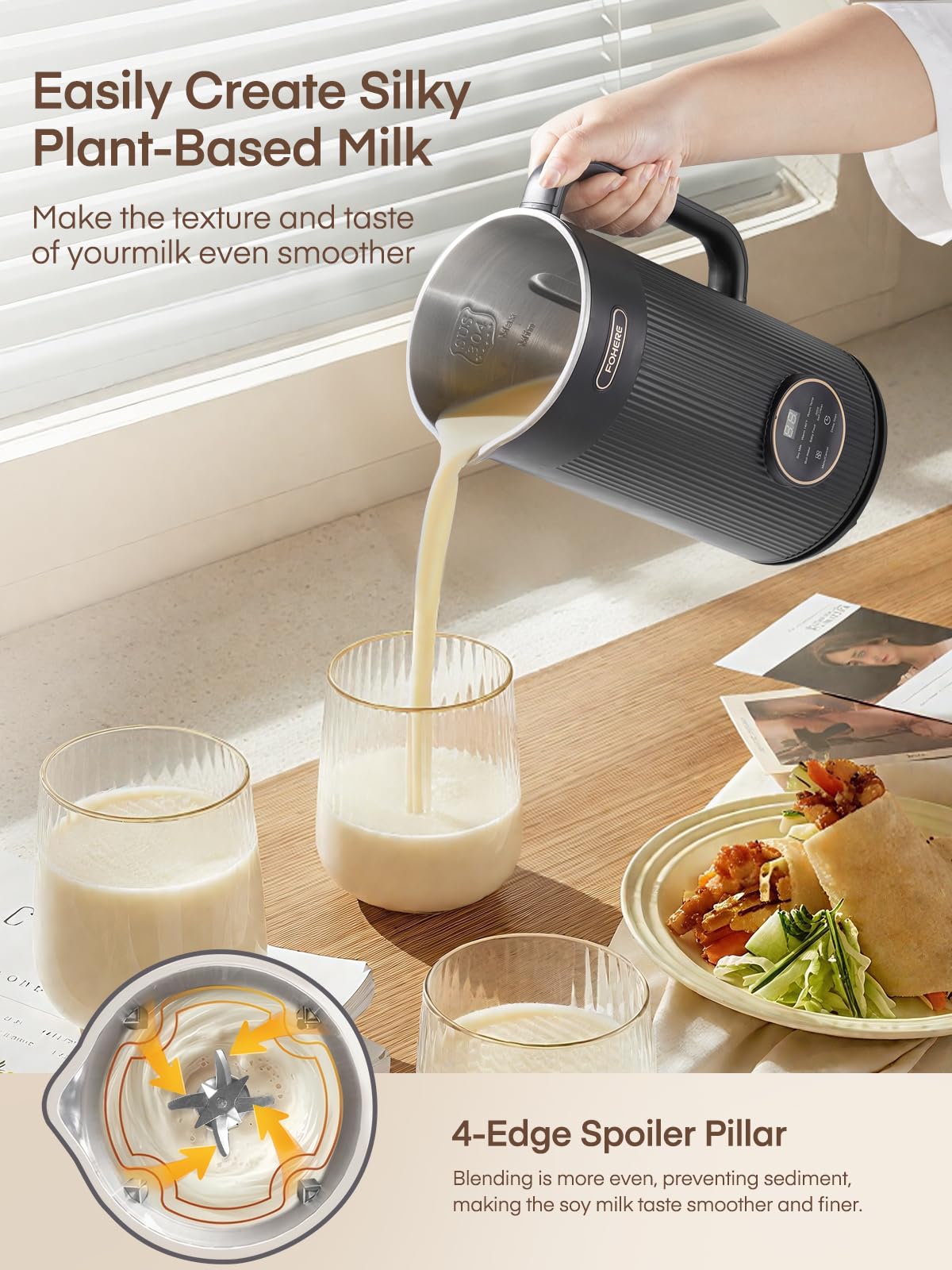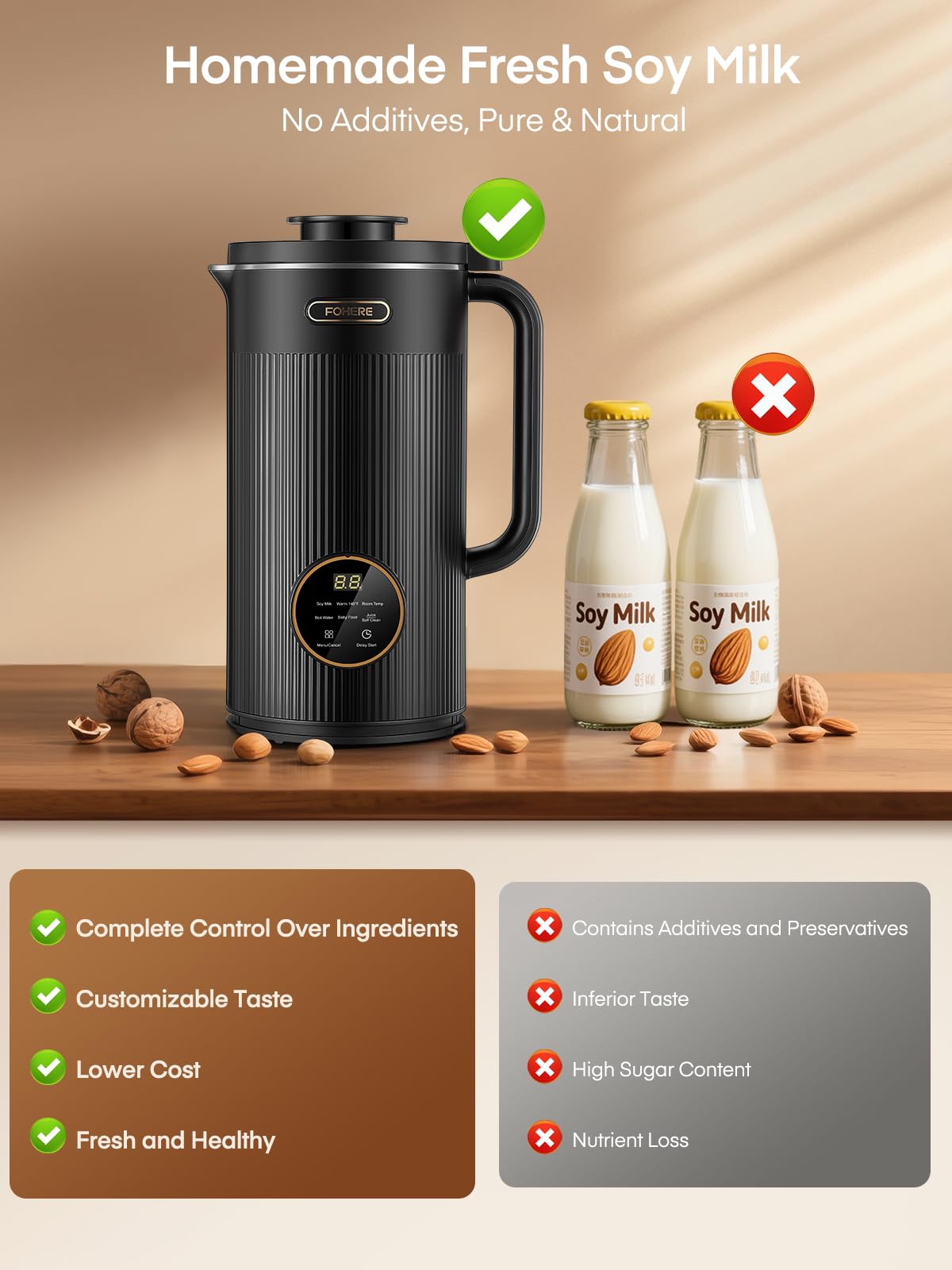 【12H Delay Start & 2H Keep Warm】: Enjoy fresh and smooth plant milk anytime! The soymilk machine can be freely set to delay start for 1-12 hours, so you can enjoy ready-to-drink almond milk, oat milk, soy milk or coconut milk when you wake up. In soymilk mode, it can keep warm for 2 hours. The machine will automatically shut down when it overheats to avoid unnecessary safety hazards.
