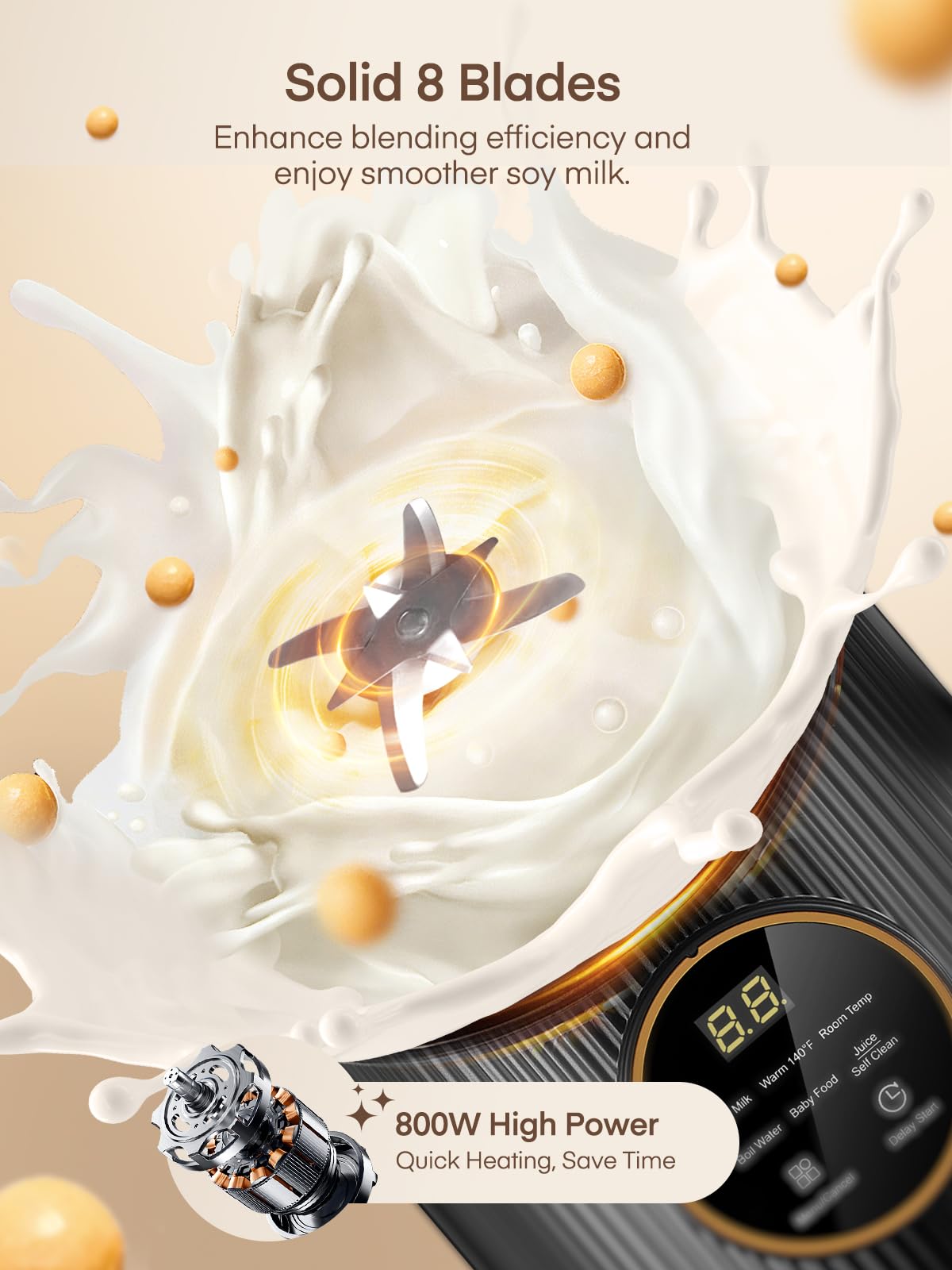 【Powerful Motor & 8-Blade Design】: The soy milk maker is equipped with 8 stainless steel X-shaped blades and a powerful 800W motor, which can quickly heat and grind nuts 360° in all directions to make silky and delicate milk. The included filter bag helps filter out the residue to ensure a smooth taste without grain residue; Expected time for hot nut milk is 0.5 hours, cold nut milk is 12 minutes, heating milk or chocolate is 8 minutes, and juicing is 2 minutes;