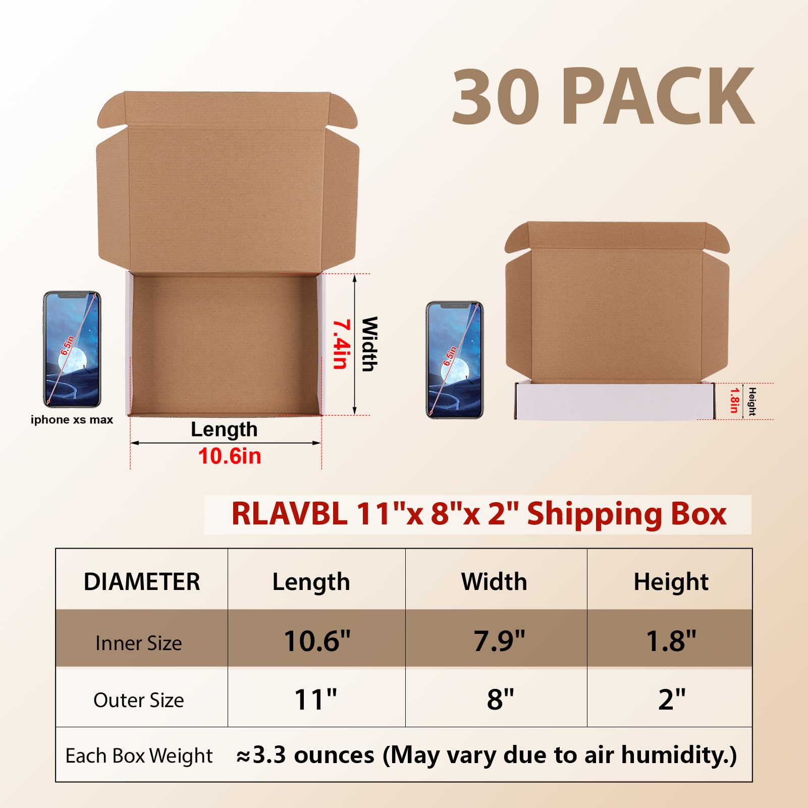DIMENSION: The shipping boxes set includes 30 packs of the cardboard box. The outer size of this small mailer box is 11” x 8” x 2”(L x W x H), the inner size is 10.6" x 7.9" x 1.8". Suitable for packing or mailing those small and lightweight items.