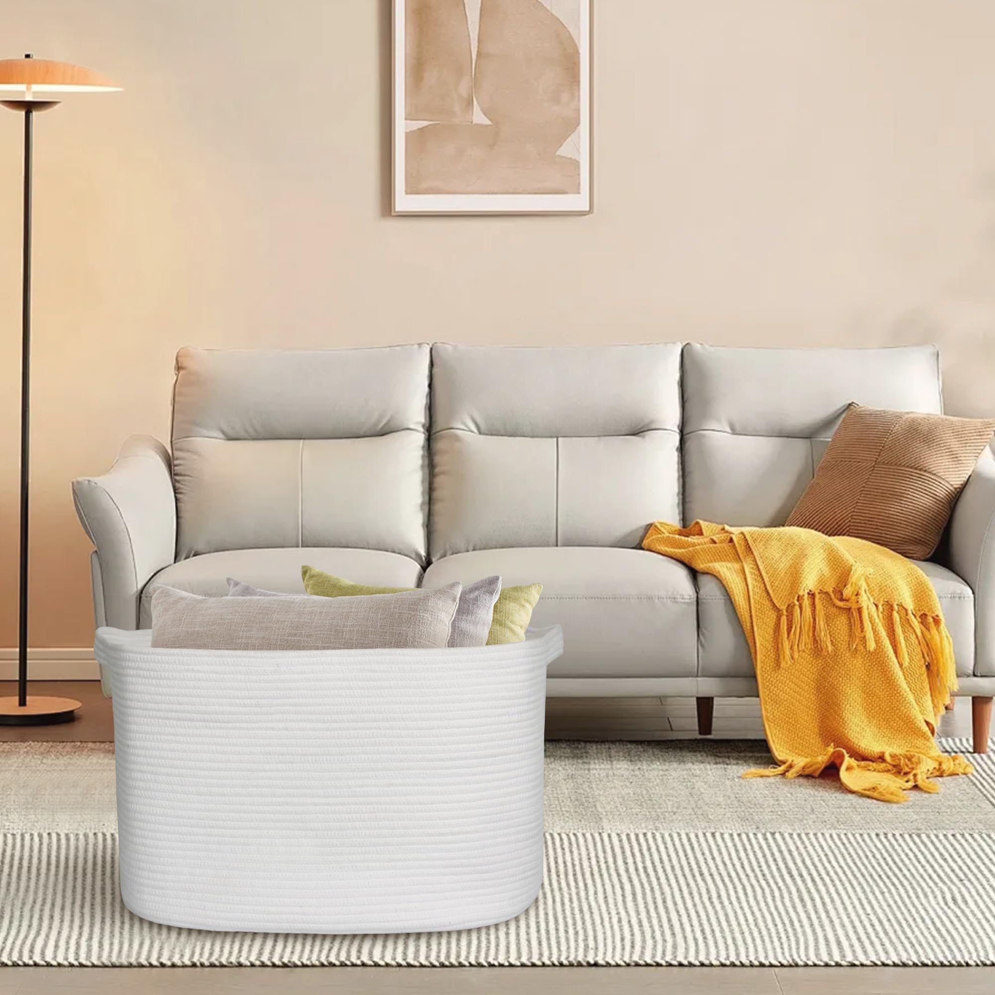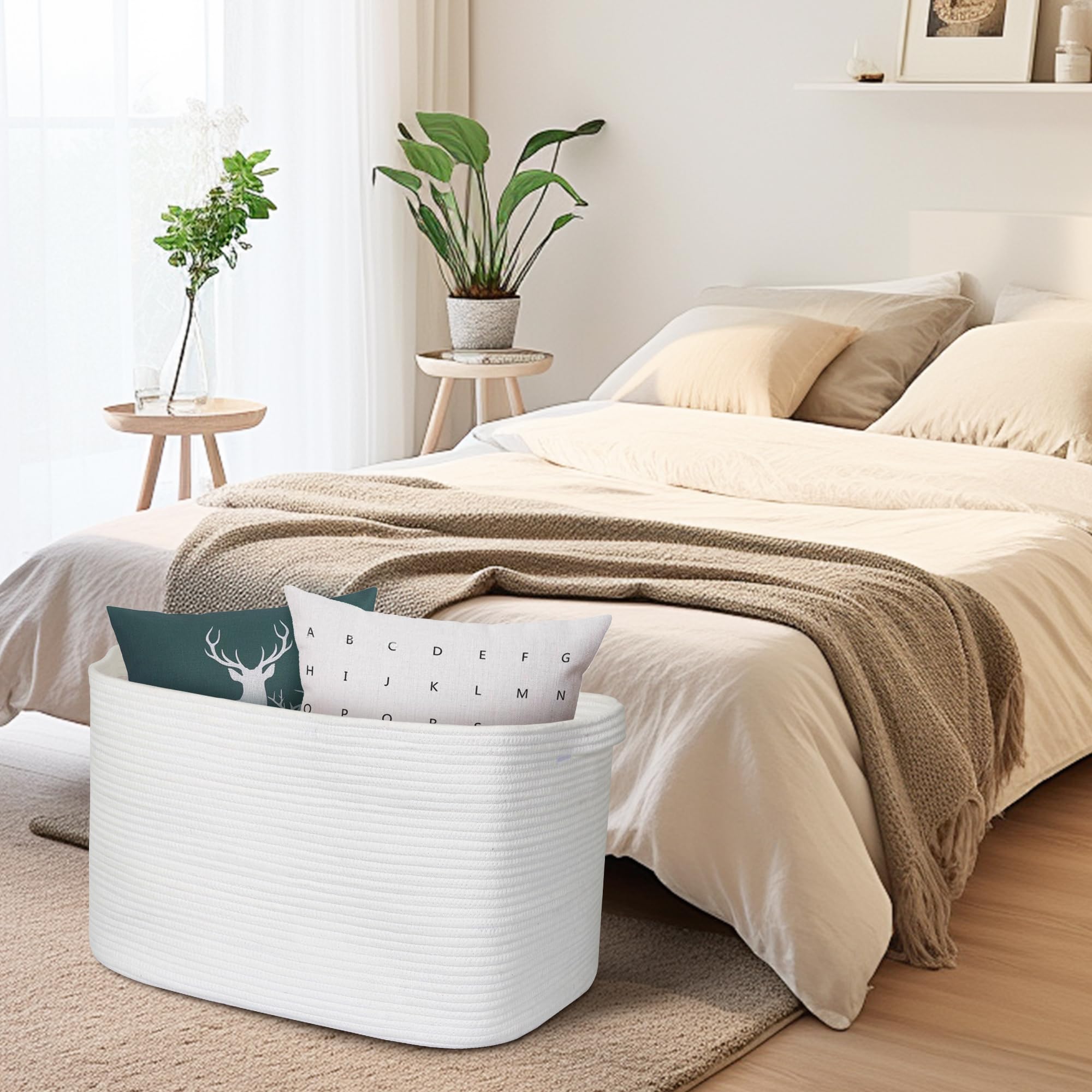 MULTI-FUNCTIONAL BASKETS FOR ORGANIZING: The woven decorative storage baskets with white neutral color scheme blends with your room decor perfectly. Due to its neutral color looking, it can be used to store your extra throw blankets in living room, pillows and comforters in bedroom, Kids stuffed animals toys in kids room, towels in bathroom, baby product in nursery and clothes in laundry room. It doubles not only as a rope storage bin, but also as an additional decoration to any room.