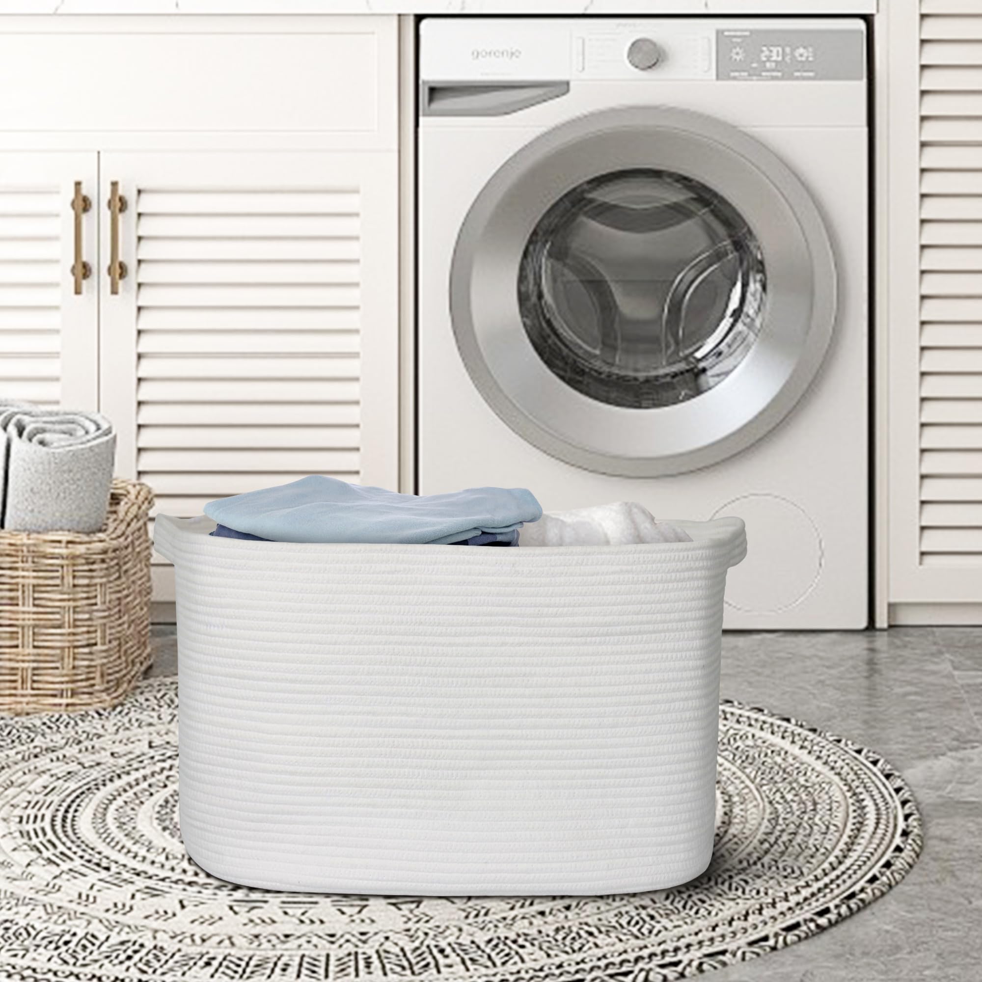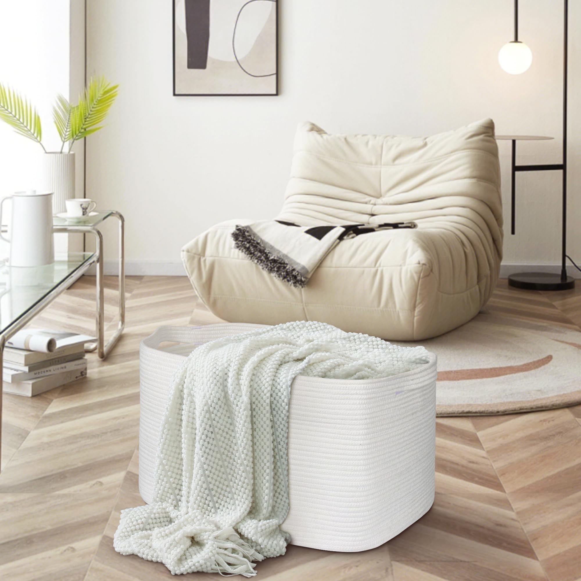 UNIQUE RECTANGLE DESIGN: Unlike usual cotton rope basket, This is a rectangular woven rope storage basket. The special structure enables this white bin not only can be placed on the floor, but also fitted on a shelf for shoes and closet for laundry. A giant wicker basket for shelves and closet.