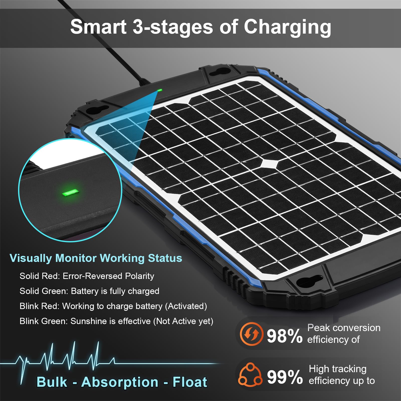 【Improved 3-stages Charging】The improved 3-Stages charging algorithm (Bulk, Absorption, Float) allows to charge 12-volt battery more effectively, ensures battery is safely recharged and increases battery life and performance