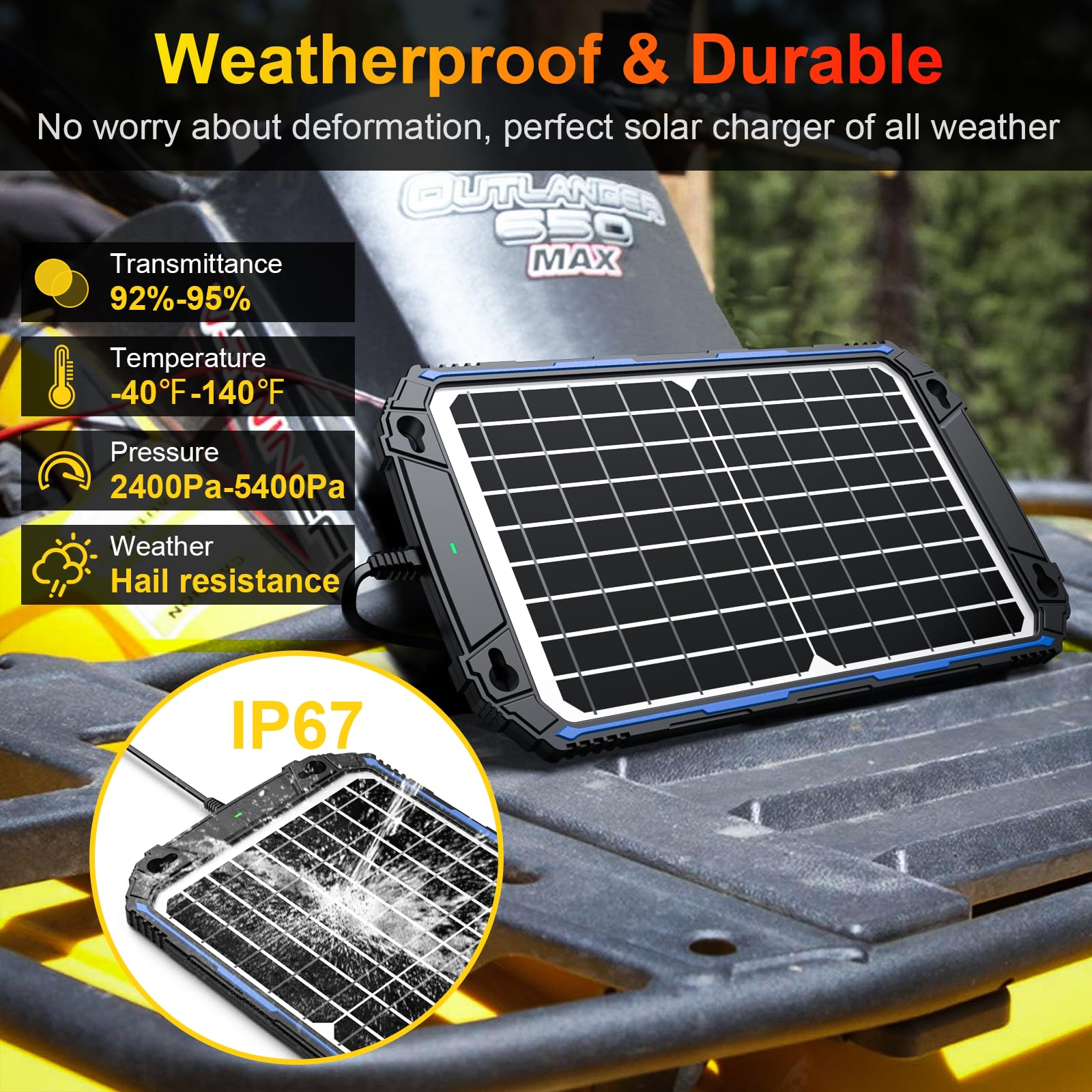 【Wide Compatibility】It's not just a solar powered battery charger, it's an advanced solar battery maintainer for 12-volt sealed lead-acid car, automotive, marine, RV, power sport, boat, dump trailer, motorcycle, trolling motor, tractor, ATV and deep-cycle batteries, including flooded, gel, AGM, SLA and maintenance-free, plus lifepo4 lithium batteries