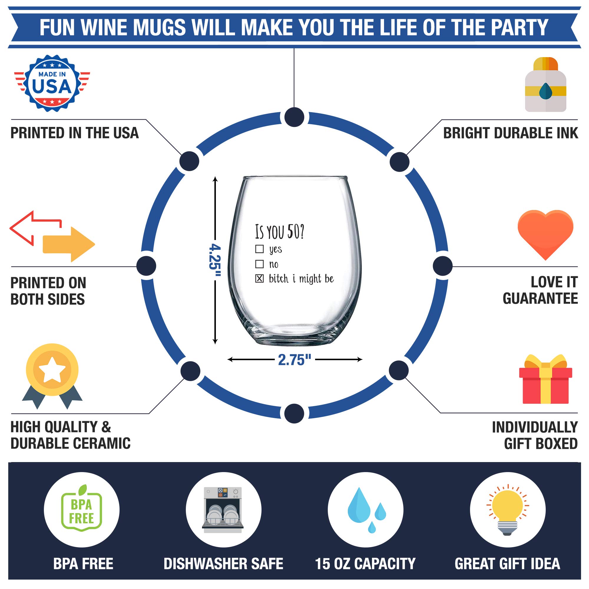UNIQUE GIFT FUN PARTY FAVORS AND DECORATIONS: This beautiful novelty wine glass is the perfect gift to WOW your guests and friends, whether it’s for a milestone 50th birthday party, class reunion or 50th wedding anniversary. Everyone will be thrilled to drink their favorite wine in this limited edition wine glass for years to come. Buy them in sets of 2, 4, 6, 12 or even more to make your next event truly memorable.