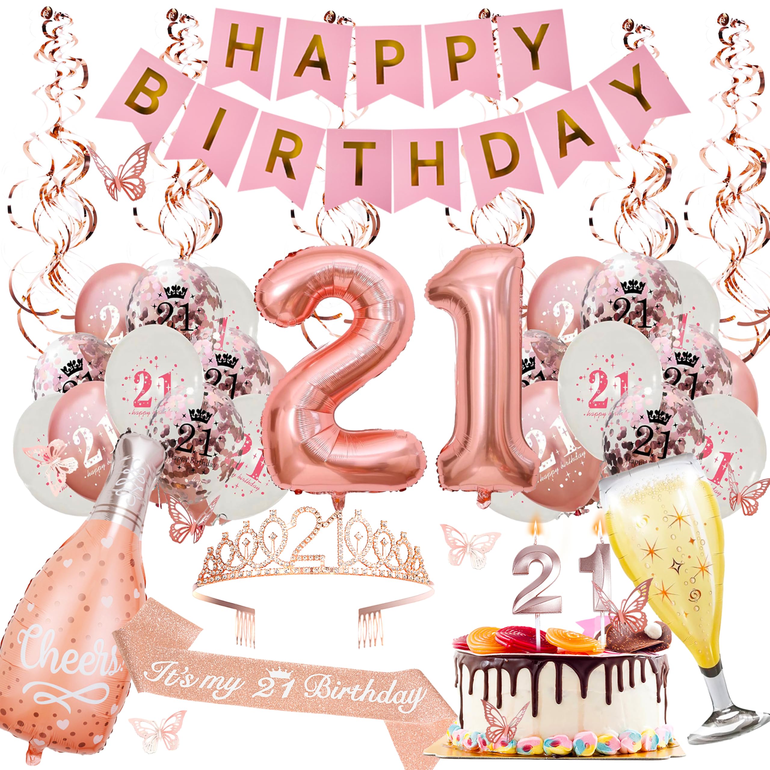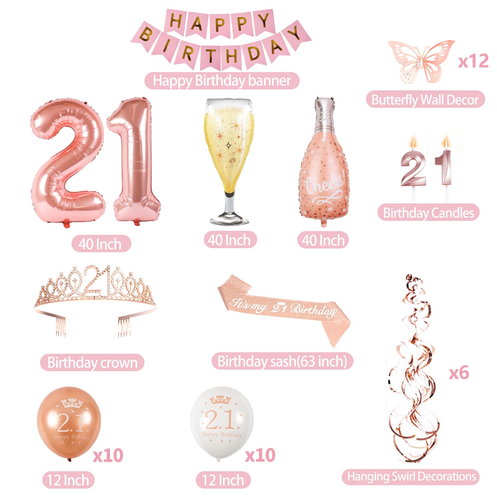 21st Birthday Decorations For Her:You will get: 1 x rose gold 21st birthday crown, 1 x 21st birthday sash, 1 x numeral candles with number 2 and 1, 1 x rose gold number balloon "21" (40 inch),1 x champagne bottle balloon (40 inch), 1 x wine glass balloon(40 inch), 1 x rose gold Happy Birthday banner, 15 x white balloons(12inch), 15 x rose gold balloons(12inch), 1 x ribbons (33ft), 12x butterfly wall decor, 6 x hanging swirl decorations, 1 x roll glue dot (100pcs dots in total).