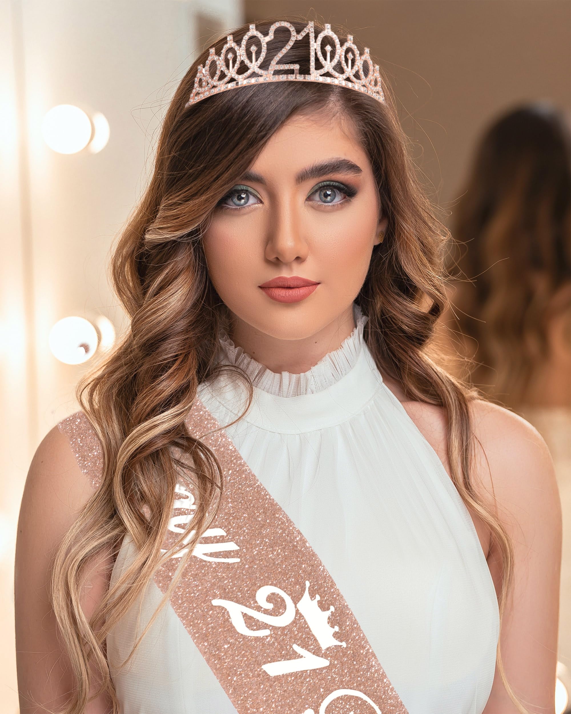 100% handmade 21st birthday tiaras for women. Made of quality alloy and shiny rhinestones . Crown With Combs that make sure it can grip the hair more tightly and fit for most women. Our tiaras for women fine workmanship, beautiful appearance, sturdy and practical, not easy to break or fade, have a metallic luster and gloss, which will make her look elegant and attractive, crown her a party queen. Birthday sashes are all rose gold of soft glitter satin with foil lettering. The sash for women is in 63 inch length and the safety pin can help you customize sashes size.