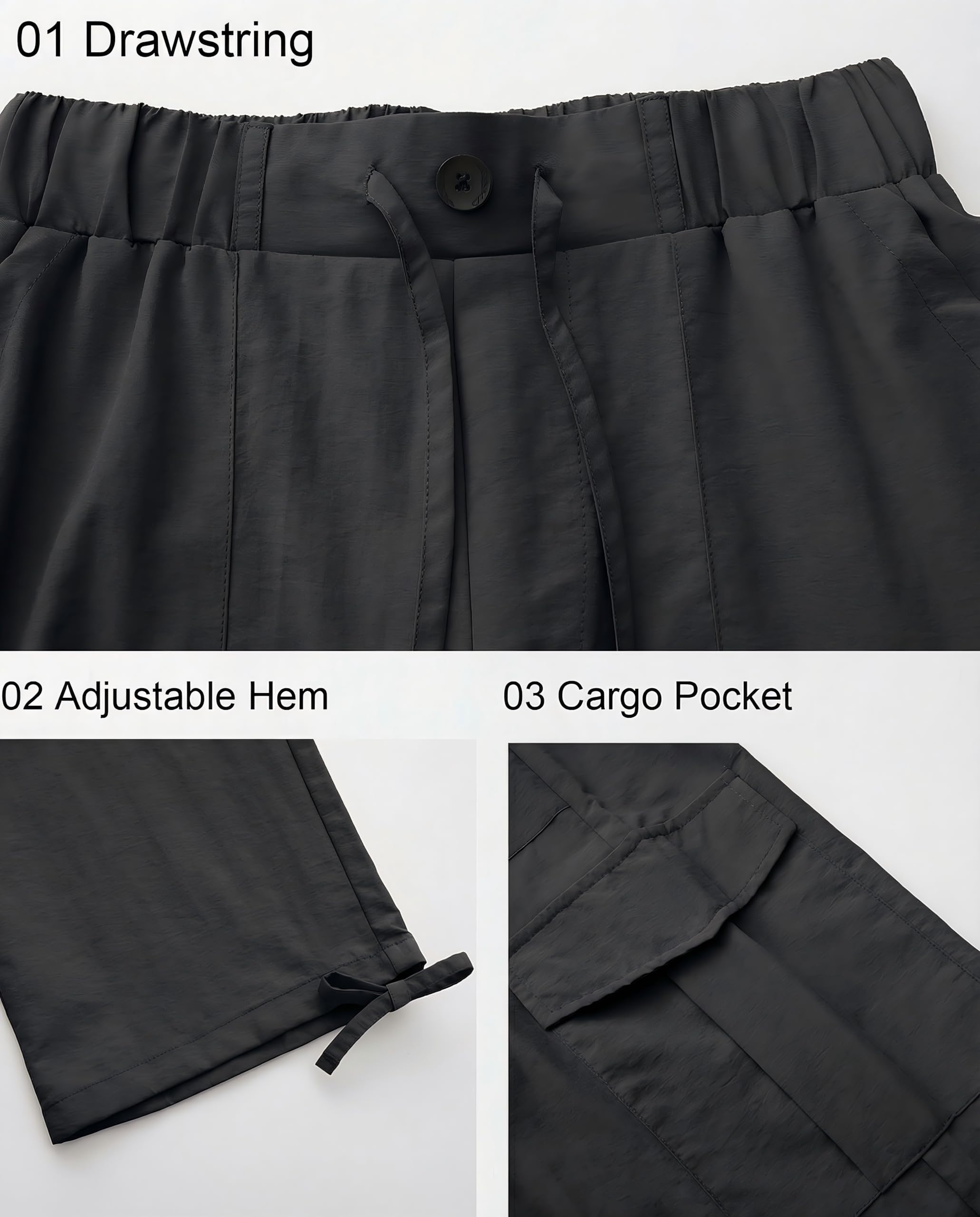 Y2k parachute pants with drawstring at waist and hem to adjust the fit and length