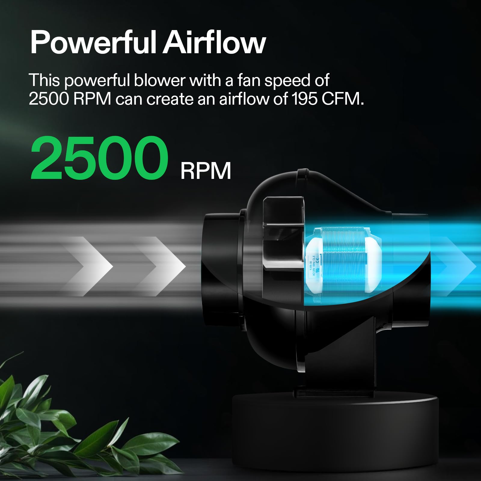 Powerful Airflow: This powerful blower with a fan speed of 2500 RPM can create an airflow of 195 CFM; It works efficiently in ventilating grow tents, transferring heat or cool rooms, circulating fresh air, as well as controlling proper humidity, temperature, and air quality for your grow area