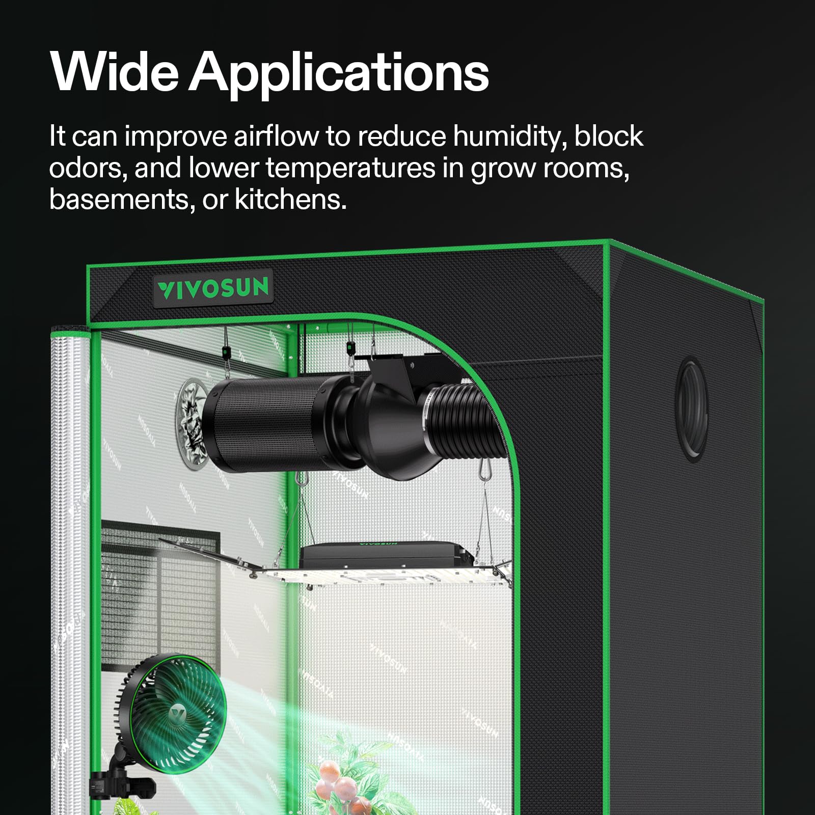 Wide Applications: It can improve airflow to reduce humidity, block odors, and lower temperatures in grow rooms, basements, or kitchens