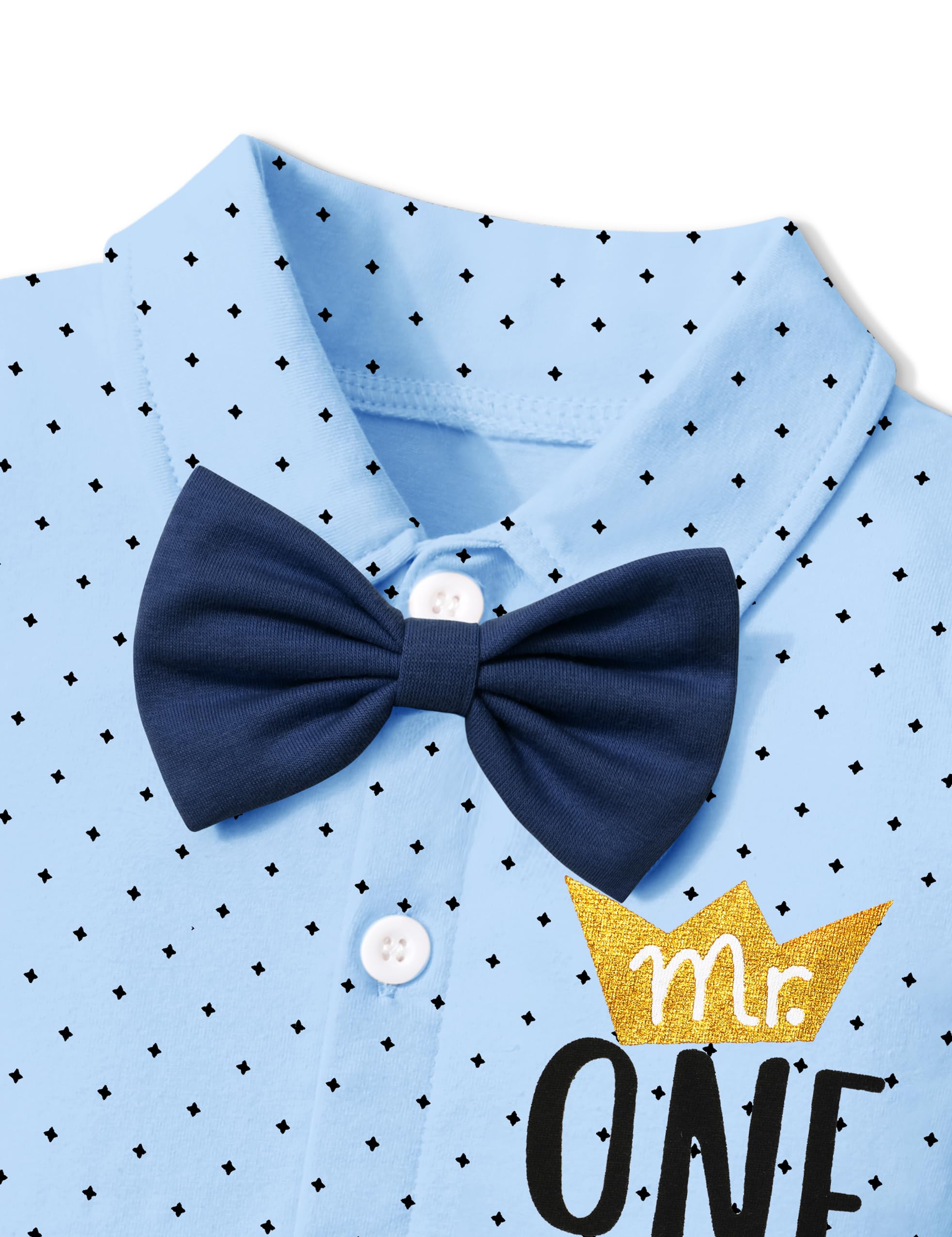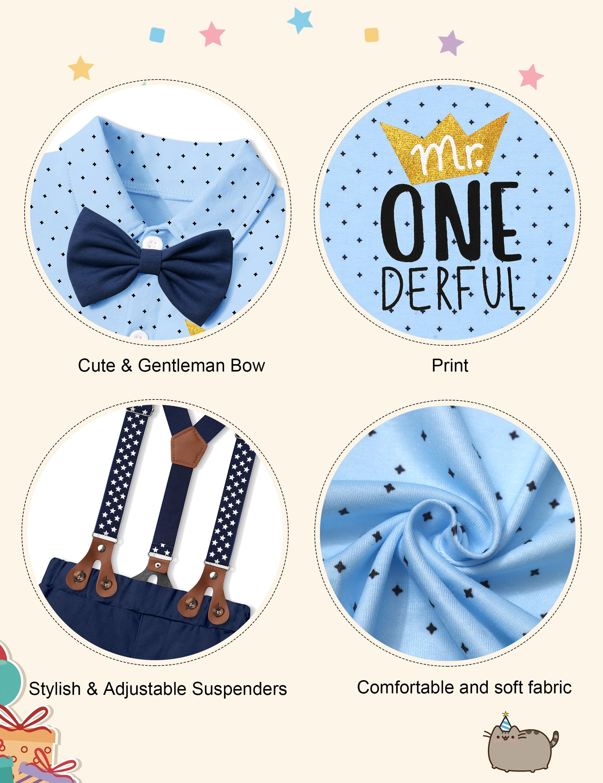 【Delicate Design】First birthday boy outfit come with a cute short sleeve romper tops , designed with MR ONEDERFUL letter print and delicate bow tie. The elastic waist shorts provide a comfortable wearing experience with 2 pockects. Adjustable Y-back suspenders designed, cute and fashionable. Matching birthday crown make your baby boy so adorable and gentlemen