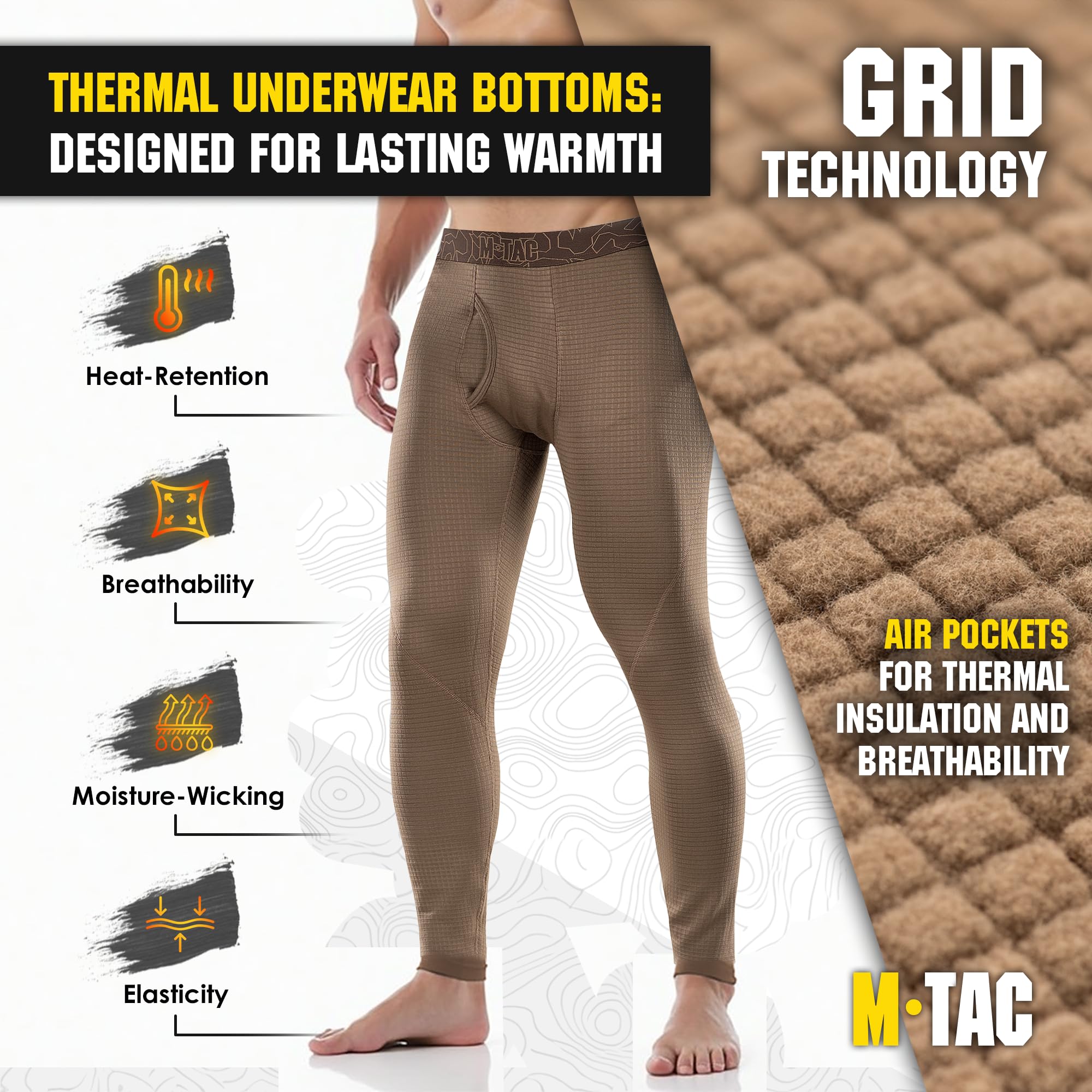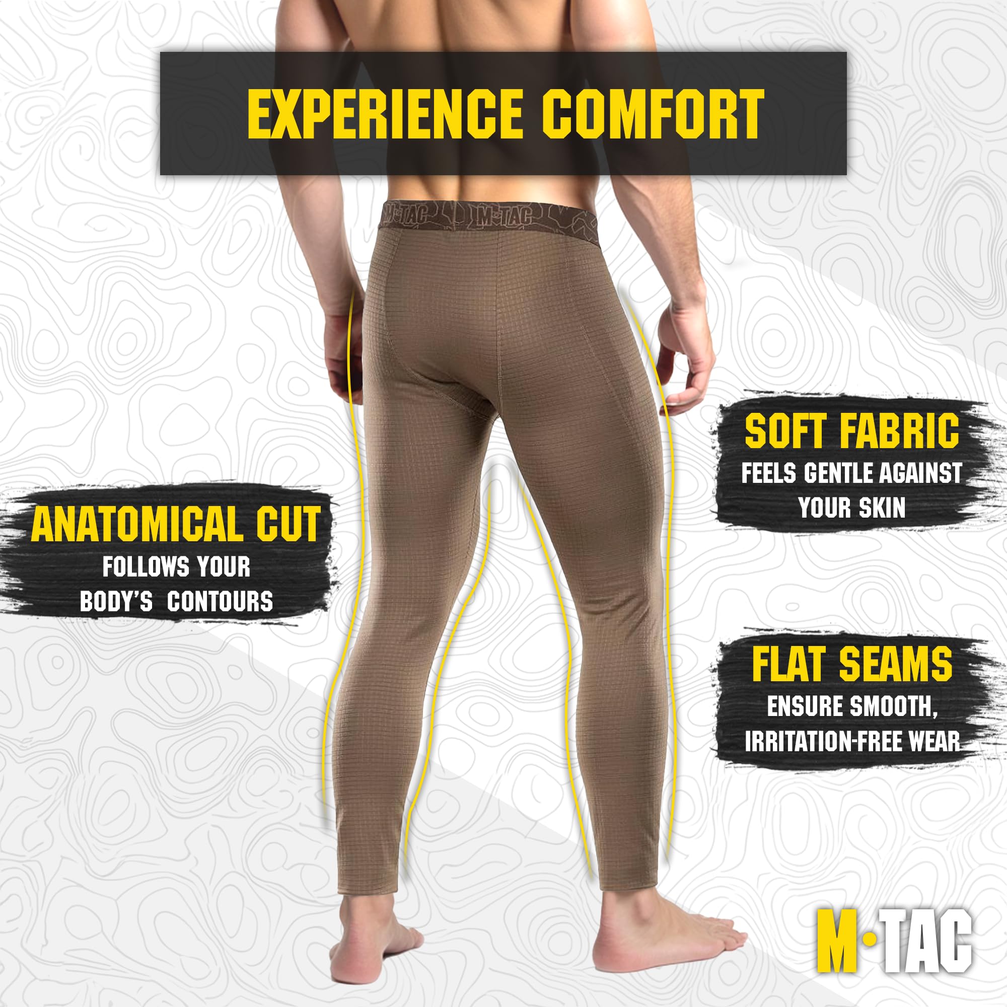 Versatile Second Layer for Cold Weather: M-Tac Delta Layer 2 Thermal Underwear create a warm layer of air next to the skin - ideal for winter; Loose waffle-knit structure of thermal underwear bottoms creates space to gather excess moisture keeping it away from skin