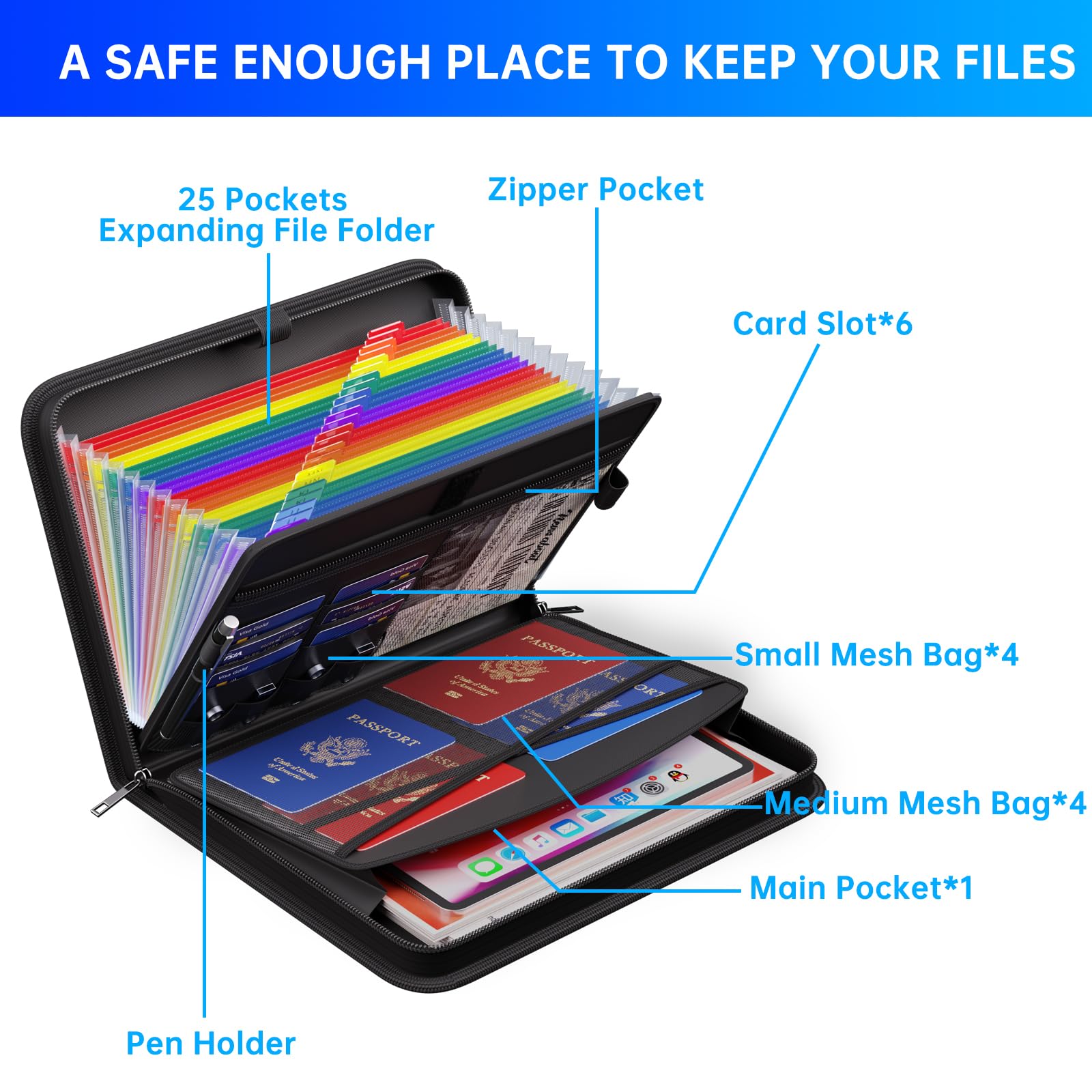 Spacious & Multi-Functional Design: With dimensions of 14.2" x 10.4" x 3", Compared with other folders, our fireproof File Organizer adopts a multi-layer design that can meet all your storage needs.These include 25 colorful accordion Pockets with labels(each expanding to 1.2 inches),1 zipper pocket,2 pen slot,6 card slots,4 small mesh bags,4 medium mesh bags,and 1 main pocket. Keep all your documents and essentials organized and easily accessible