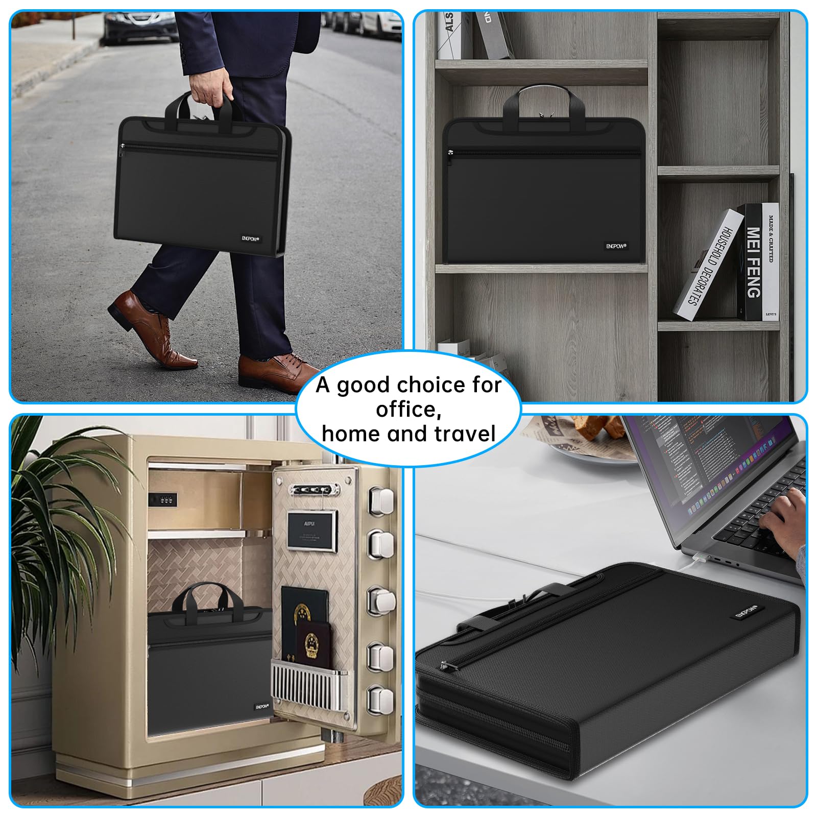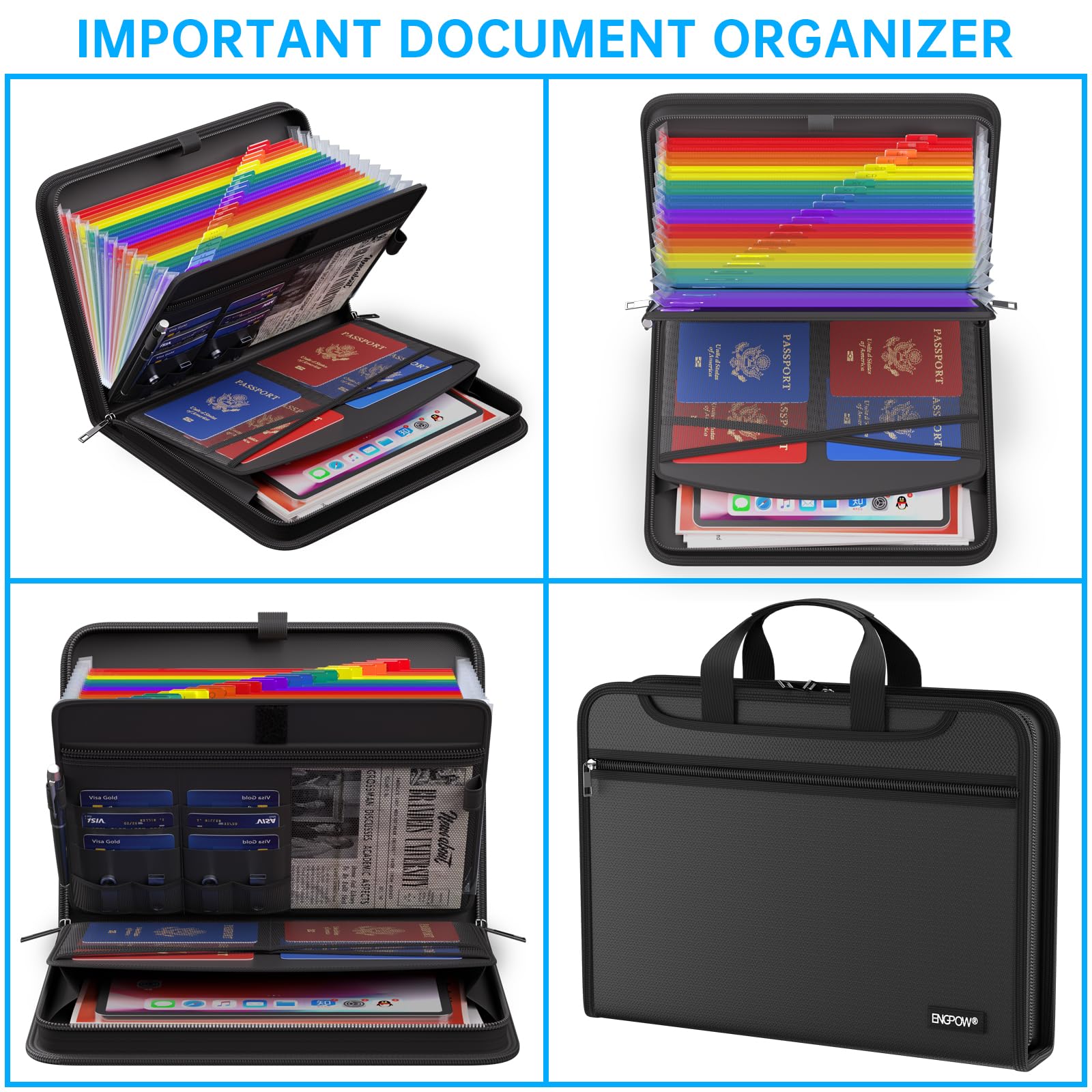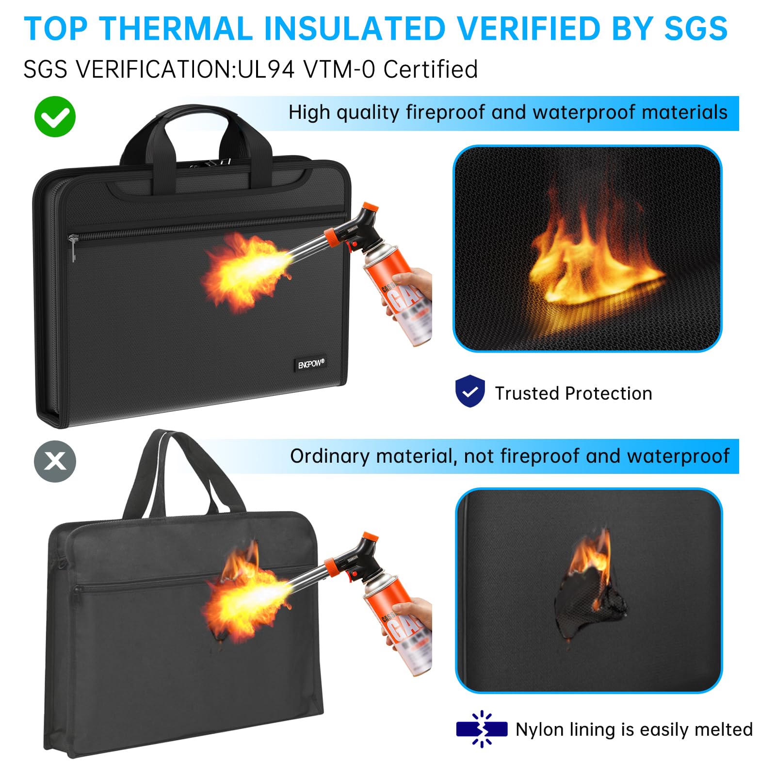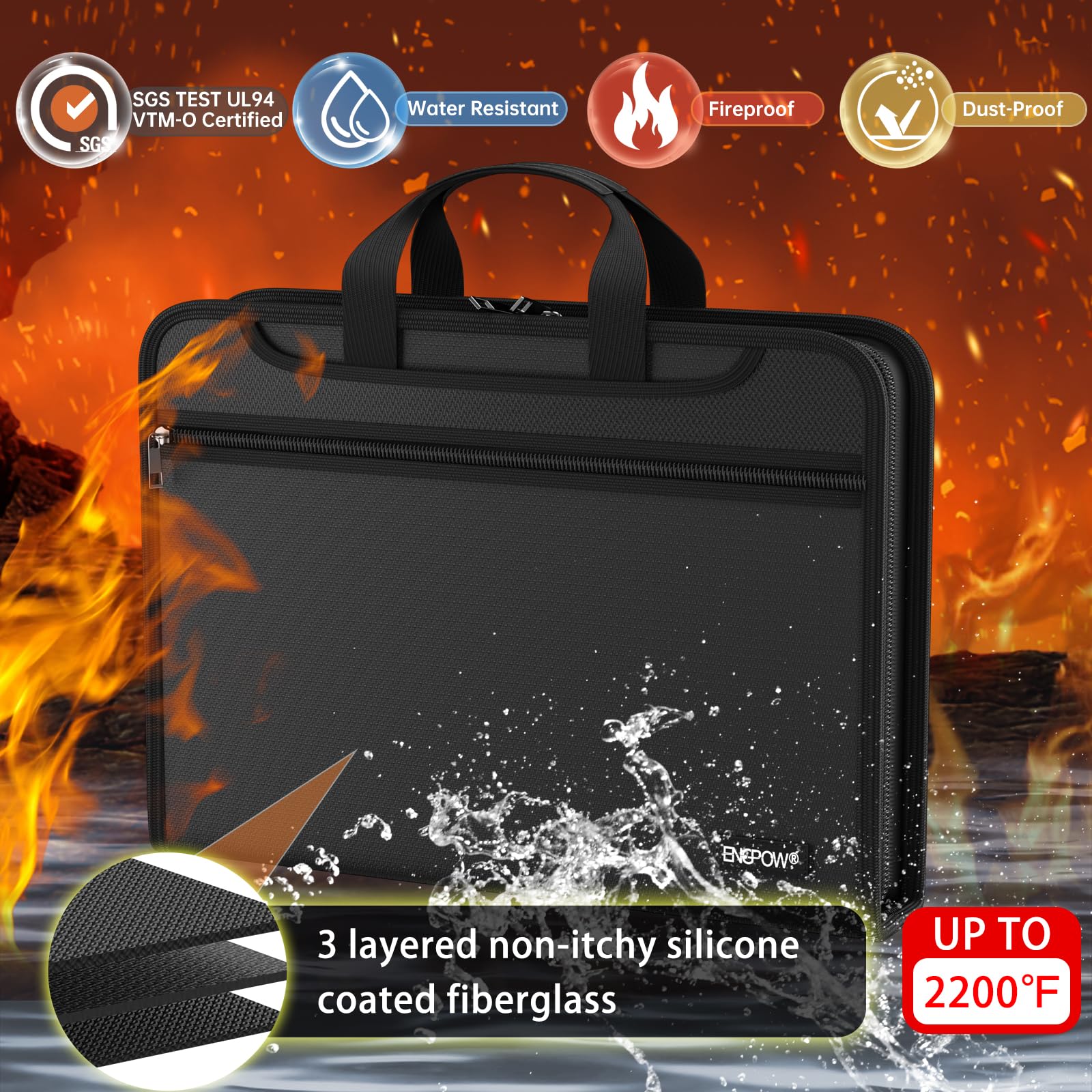 Premium Fireproof Protection: Protect your files with ENGPOW fireproof accordion file organizer.It is made of 3-layered non-itchy silicone-coated fiberglass which withstand the temperature up to 2200℉ and is UL94 VTM-0 certified by SGS. This fireproof and water-resistant folder ensures your files stay safe from fire, flood, and wet weather, giving you peace of mind during emergencies. Nothing is completely foolproof, but added protection is always a good idea