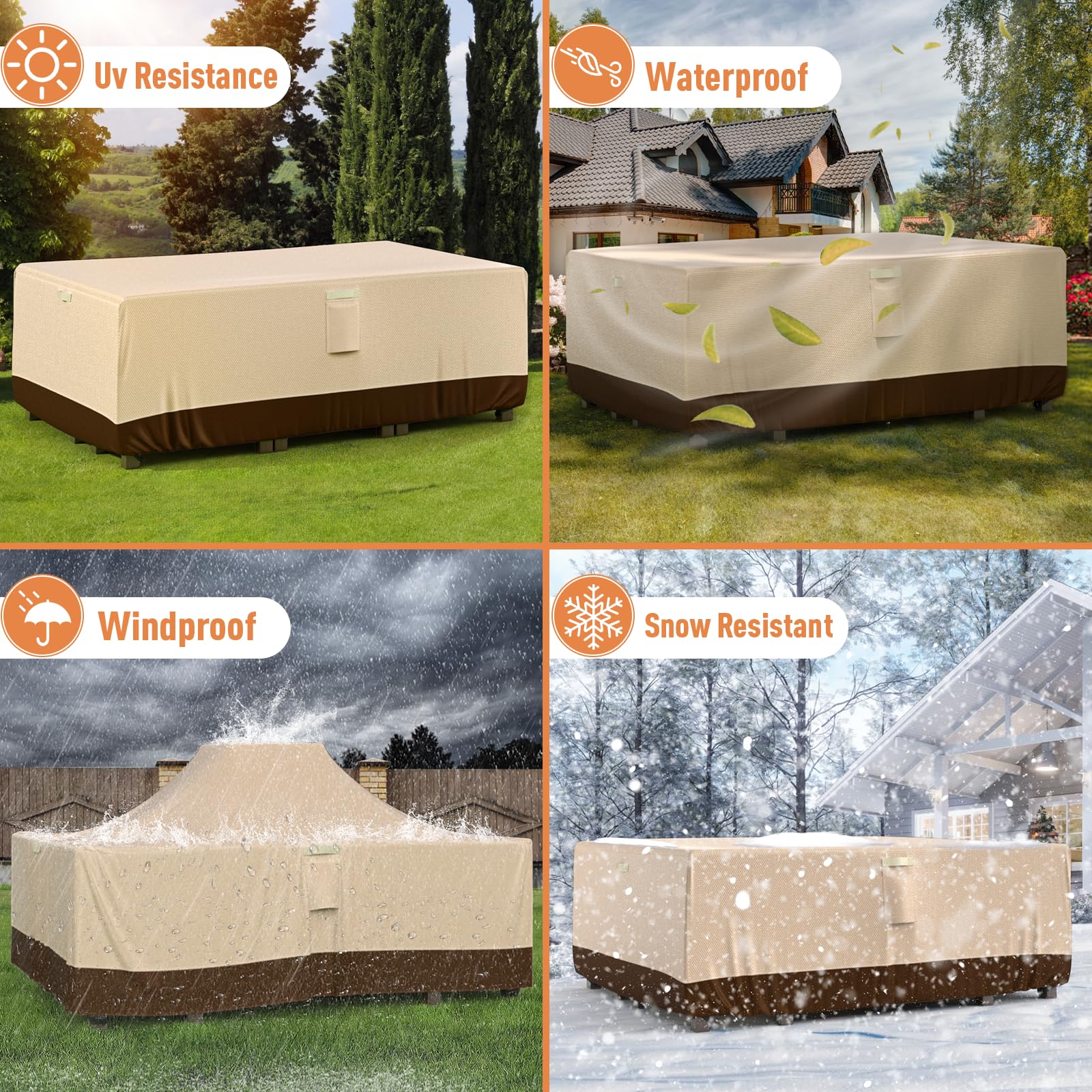 【Tear and UV Resistant】We developed a high quality patio furniture cover with 600D material strictly stitched and PU coated with waterproof tape at the seams. Keeps your furniture dry. It also protects your furniture from rain, snowstorm, dust, falling leaves, scratches.