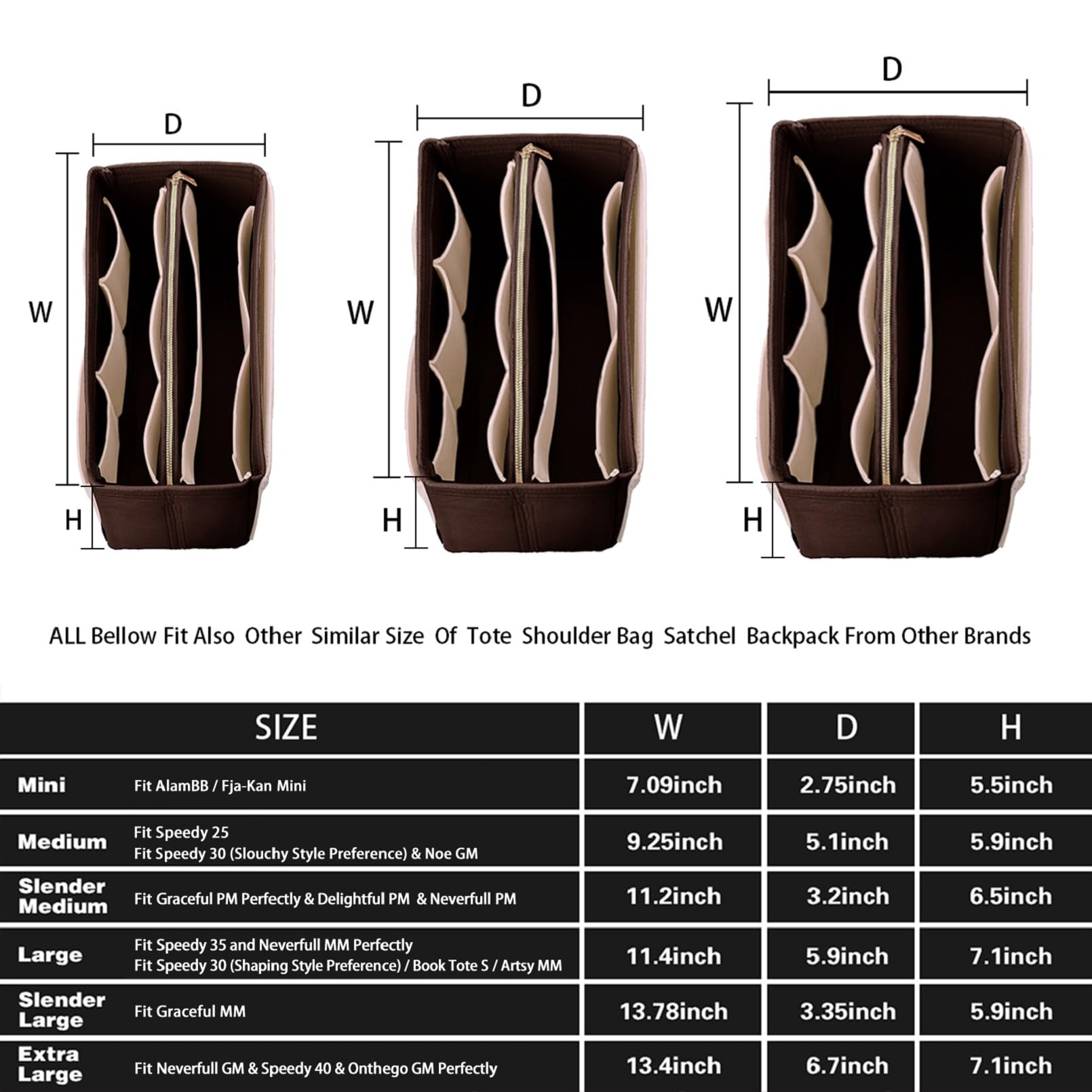 💗Large Purse Organizer: 11.4(W)*7.1(H) *5.9(D)inch Fit Speedy 35 and Neverfull MM Perfectly and Fits Speedy 30 (Shaping Style Preference). Slender Large Purse Organizer : 13.78(W)*5.9(H)*3.35(D)Fit Graceful MM Perfectly.X-Large Purse Organizer:13.4(W)*7.1(H)*6.7(D)inch fits Speedy 40 and Neverfull GM Perfectly. Portable and Compact Purse Perfectly For any Brand. Please kindly Measure the Interior Length, Width and Height of Your Handbag with a Measuring Tape