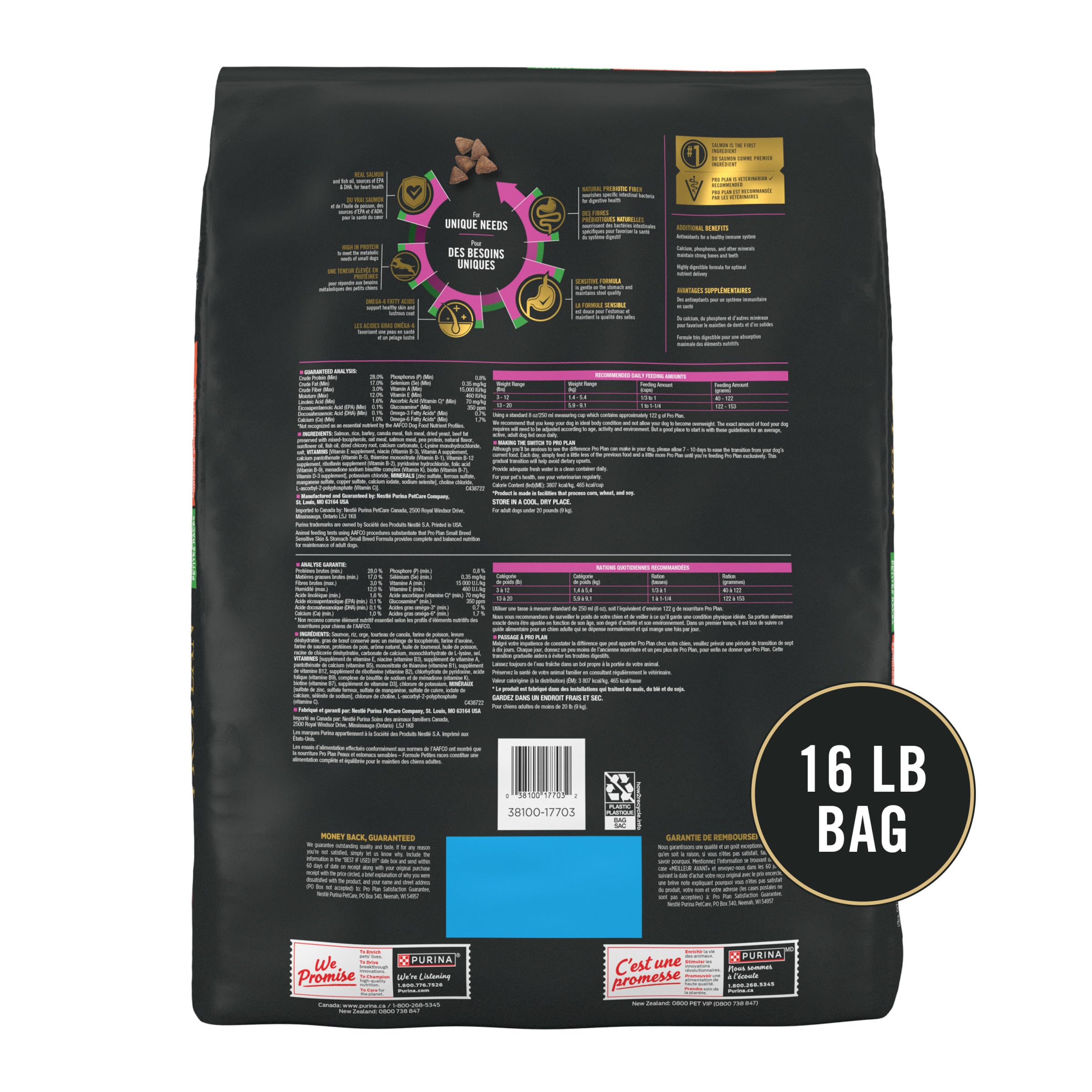 Help your small dog put his best foot forward with Purina Pro Plan Brand Sensitive Skin & Stomach Small Breed Formula adult dry dog food. This highly digestible dog food formula features salmon as the first ingredient, and every high-quality ingredient is carefully selected for a specific nutritional or functional purpose. Easily digestible oat meal in every serving of this sensitive skin and stomach dog food helps protect his digestive system, while natural prebiotic fiber nourishes specific intestinal bacteria for digestive health. Made without corn, wheat or soy, and without poultry by-product meal, this small dog food formula gives him wholesome goodness with every bite. Your dog gets the specialized nutrition he needs combined with 23 essential vitamins and minerals to help support his overall health and wellness. Give your canine companion a small breed dog food for sensitive stomachs formulated specifically for little dogs under 20 pounds, and enjoy his loving adoration.