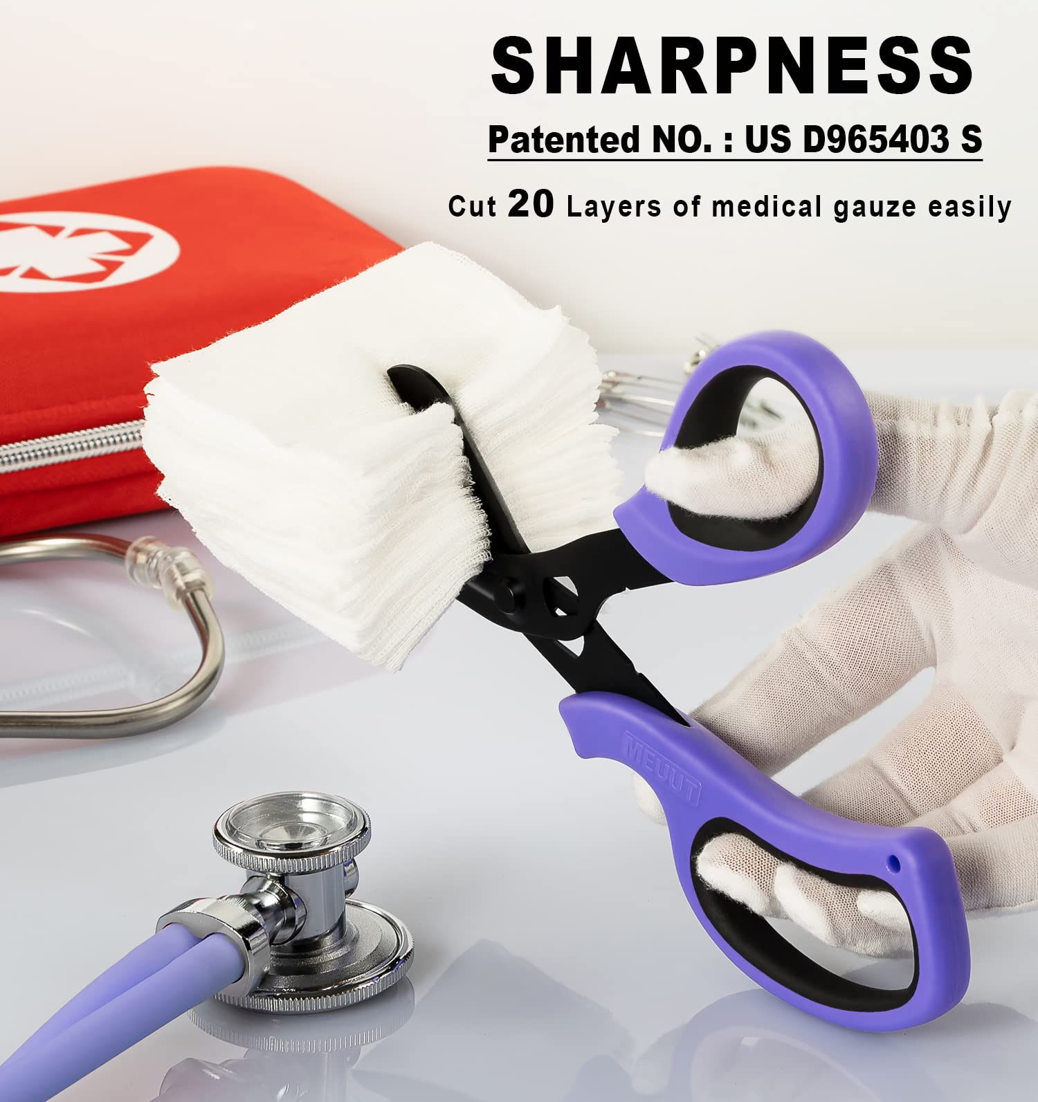 【PERFECT for FIRST AID】: 2 pack 8 inches patented medical scissors for left and right hand, Purple+Navy. Material: Stainless Steel 440, Polypropylene + TPE