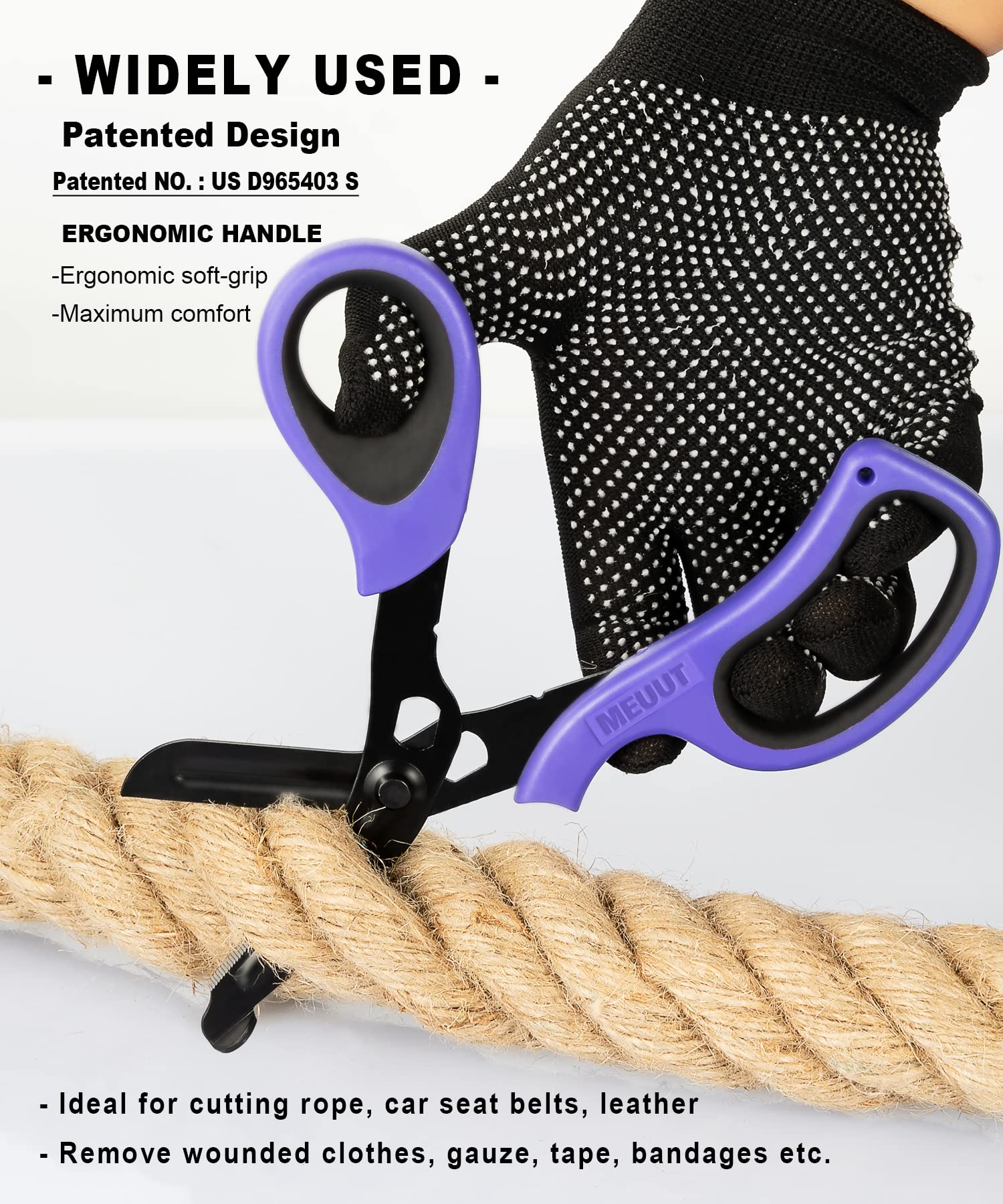【ALL-PURPOS】: Cut anything safely and efficiently with these sharp scissors. Ideal for cutting ribbon, burlap, rope, car seat belts, leather, remove wounded clothes, gauze, tape, bandages etc. Perfect for outdoors, first aid, nurse, doctor, firefighter, gardening, household.