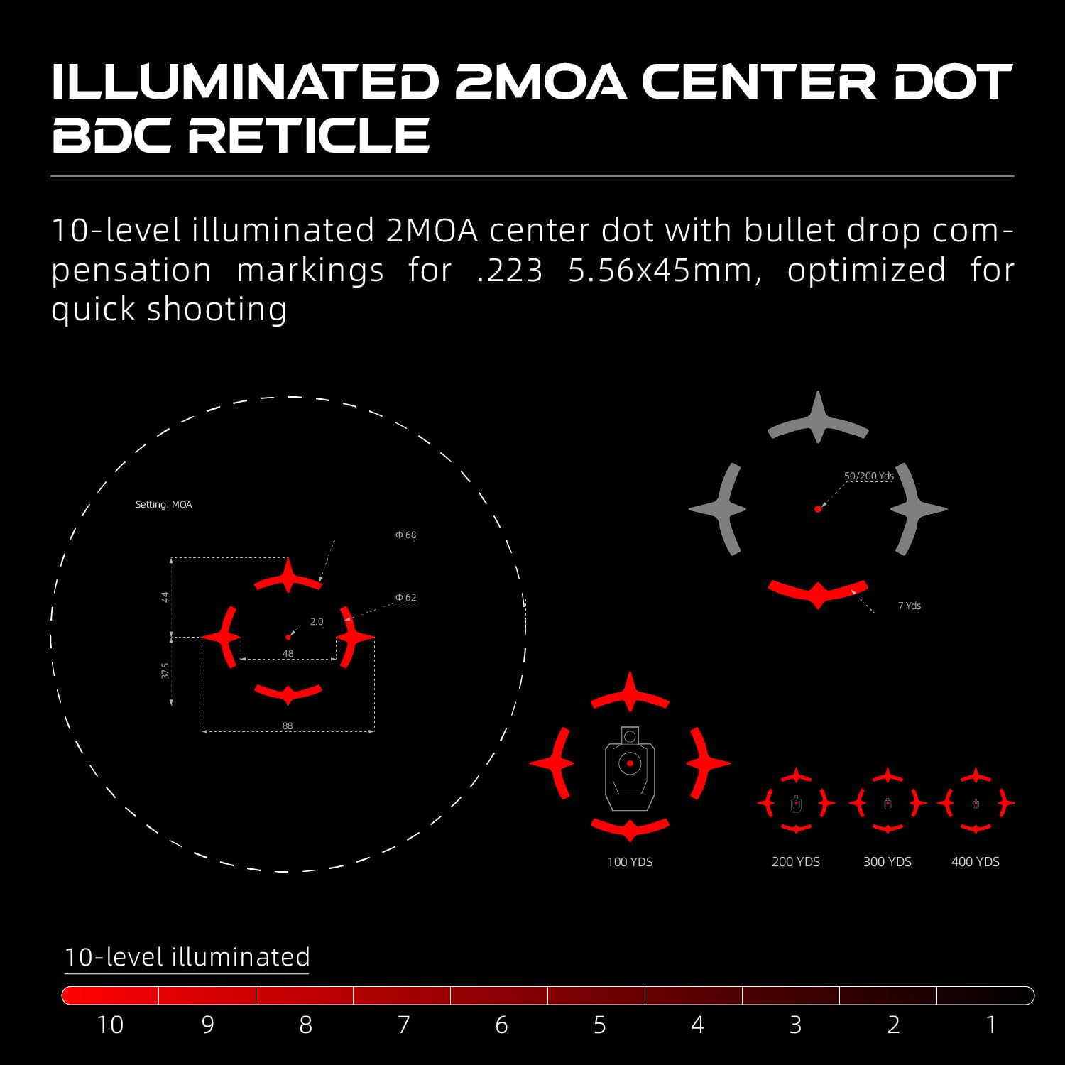 【Illumination & Precision Adjustments】: Customize your 2 MOA center dot with 10 brightness settings, and reduce opacity for compatibility with night vision devices. Achieve pinpoint accuracy with 1 MOA click adjustments for tighter shot groupings