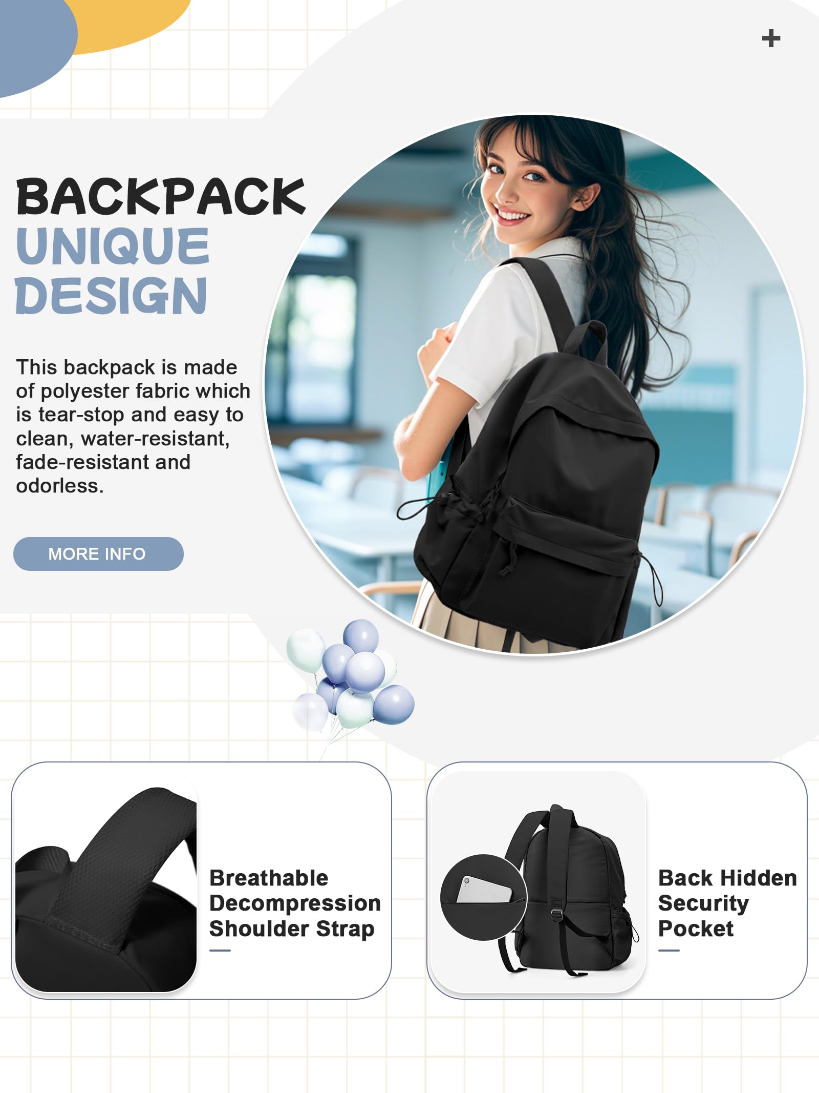 INTERNAL STRUCTURE : There is a main zipper compartment,a separate computer compartment,a zipper front pocket, ,two drawstring side pockets and one anti-theft zipper pocket. The spacious compartments and multiple pockets keep your belongings organized and more Easy to find.