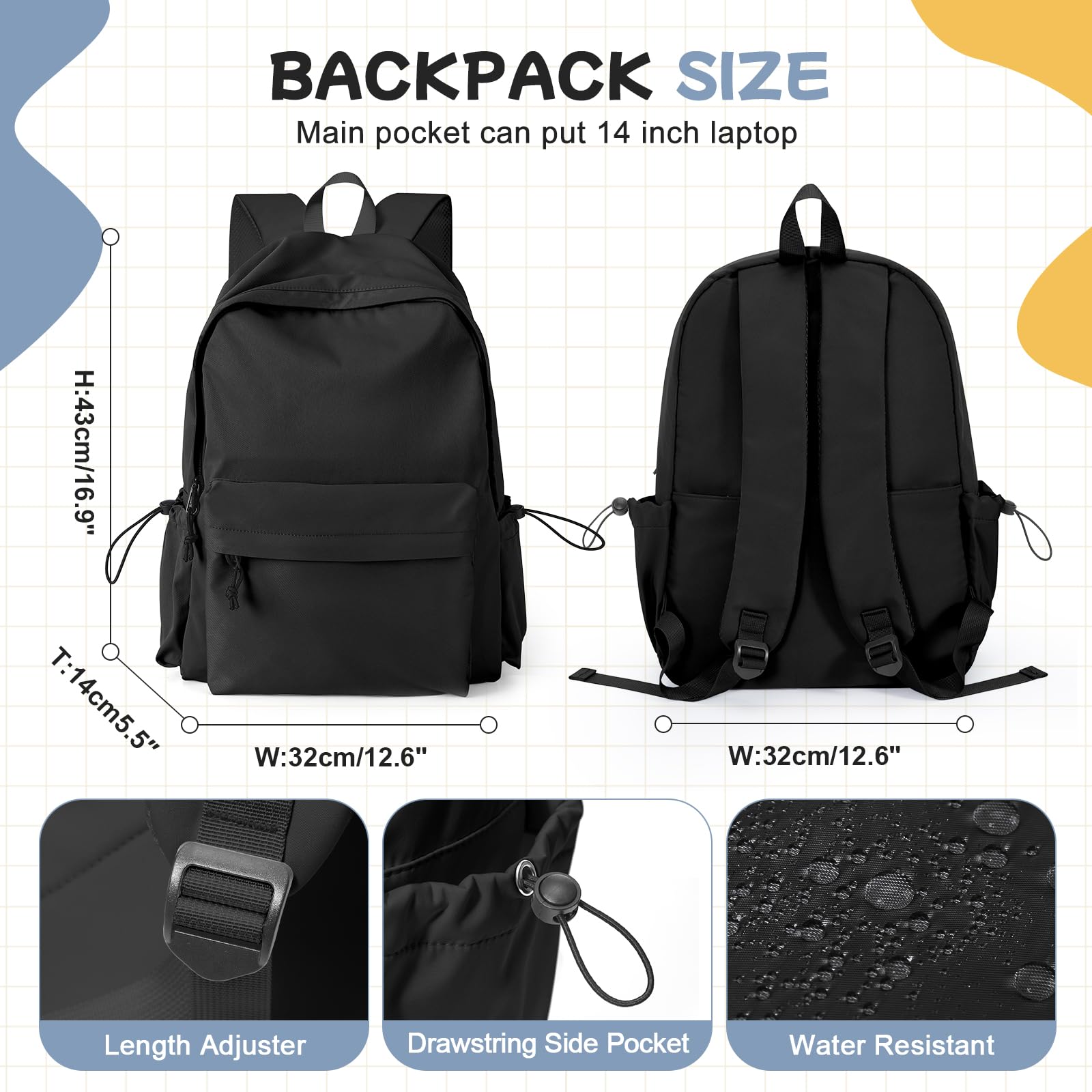 DIMENSION & CAPACITY : Dimension: 43*32*14cm / 16.9*12.6*5.5 inch; Capacity:24L; Weight:0.5KG. Main compartment laptop sleeve can fit for 14 inches laptop.
