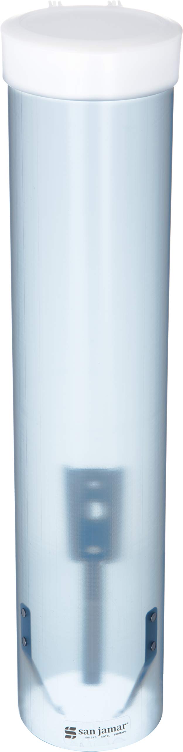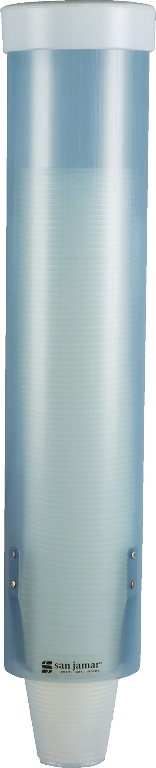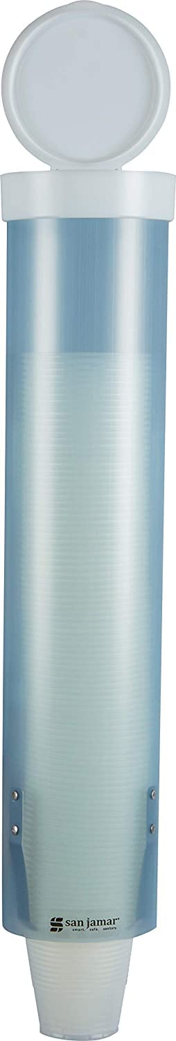 Our Medium Pull Type Water Cup Dispenser features a flip cap that keeps cups clean and enables simple cup refilling. Other features include self-adjusting prongs to accommodate various cup types and sizes, dependable one-at-a-time dispensing of cups to reduce waste, and mounting brackets (included) that let you mount the dispenser on coolers, walls, or any flat surface. This dispenser can accommodate 4 to 10 ounce flat bottom and cone-shaped paper, plastic, or foam cups (accommodates approximately 1 standard sleeve of cups). The transparent frosted blue tint makes it simple to check the level of cups stocked.