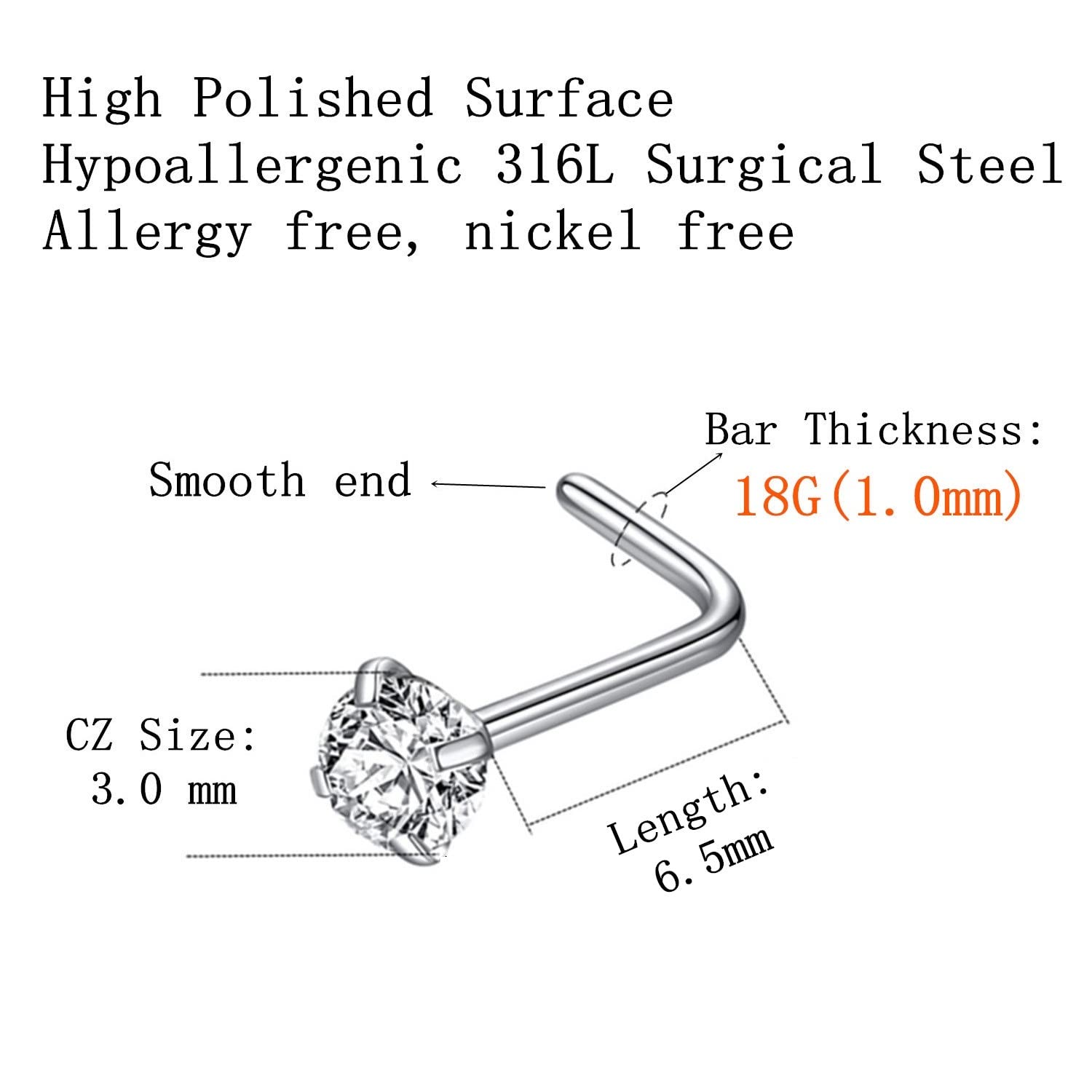 Quantity: 6pcs 3.0mm CZ nose stud. This L shaped nose studs for women size: Bar thickness: 18 gauge (1.0mm), Pin Length:6.5mm, Prong set cubic zirconia: 3.0mm, These stones a very bright and prong set by hand for accuracy.