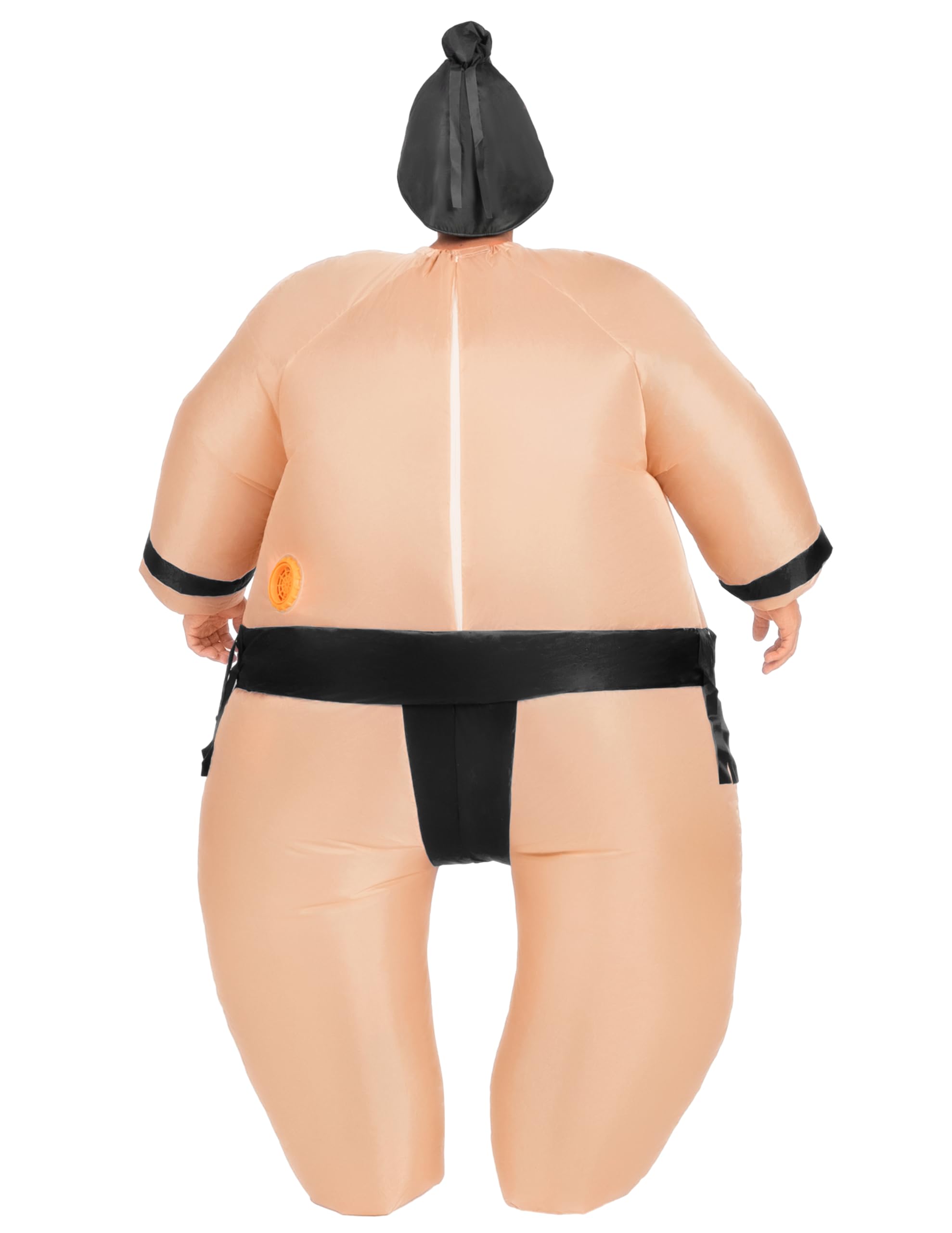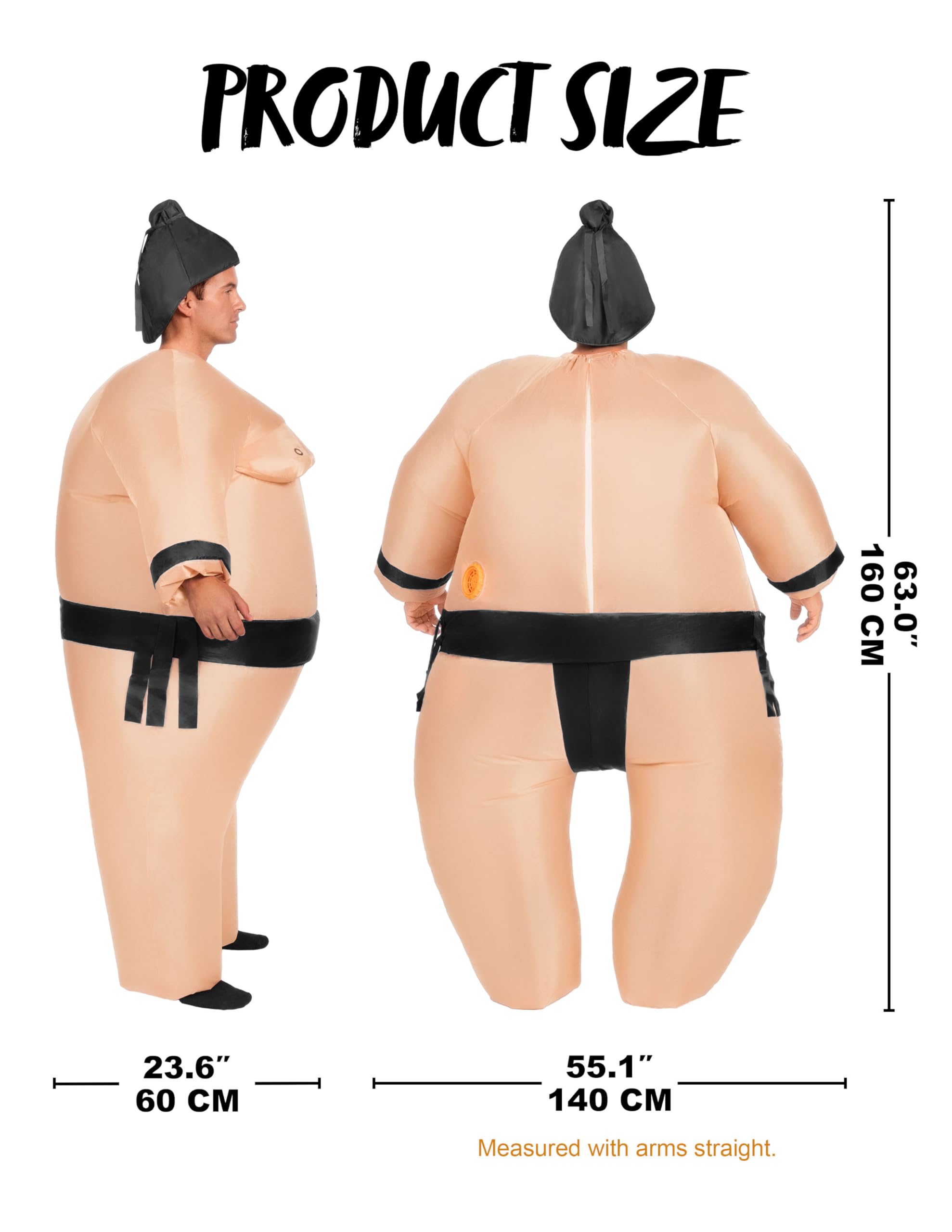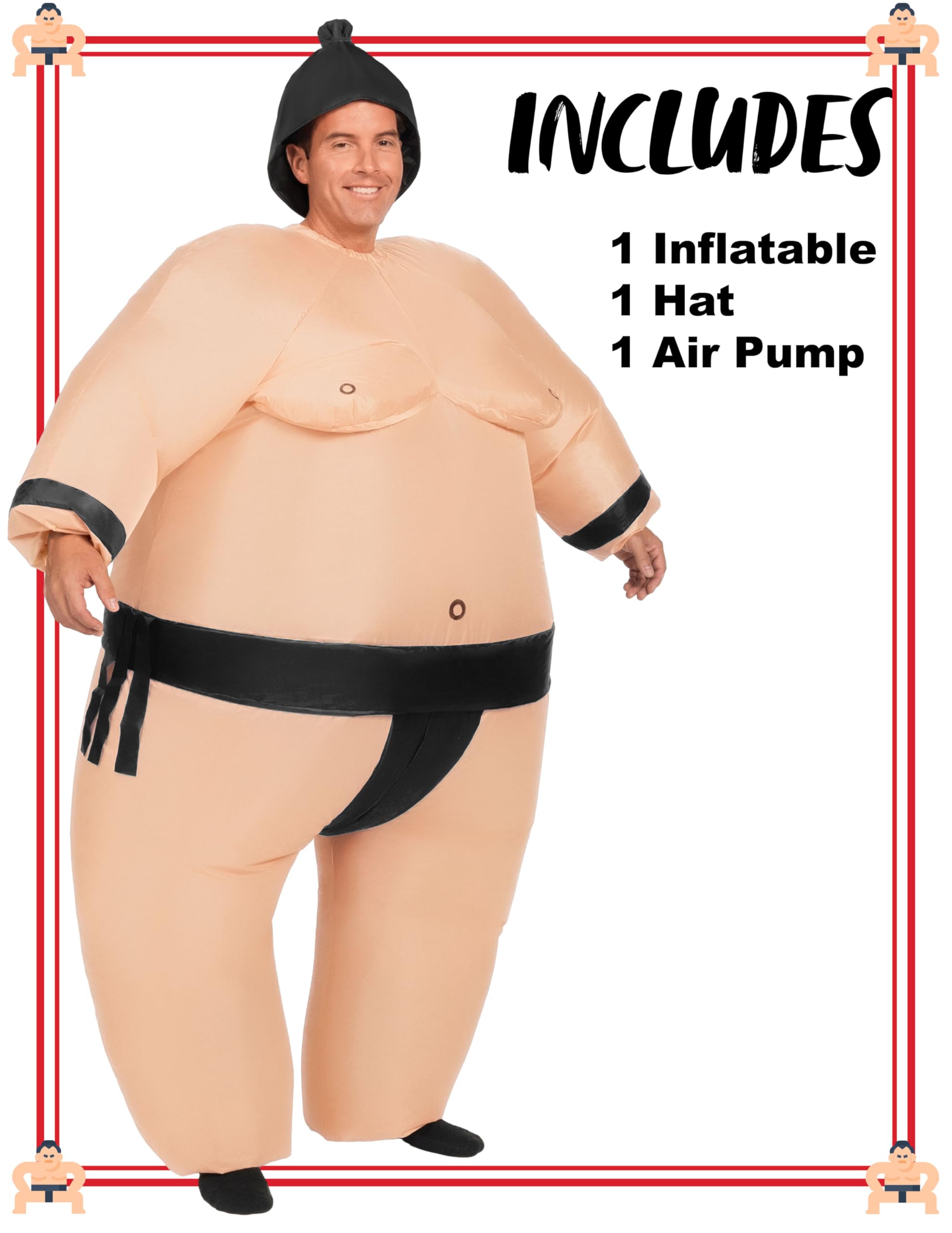 Complete Pack: This inflatable sumo wrestler costume set includes 1 inflatable suit, 1 hat, 1 Inflating tool, 1 instruction sheet, and 1 Power box (4AA batteries required, but not included). The suit is designed to look like a sumo wrestler, with a bold black loincloth mawashi belt.