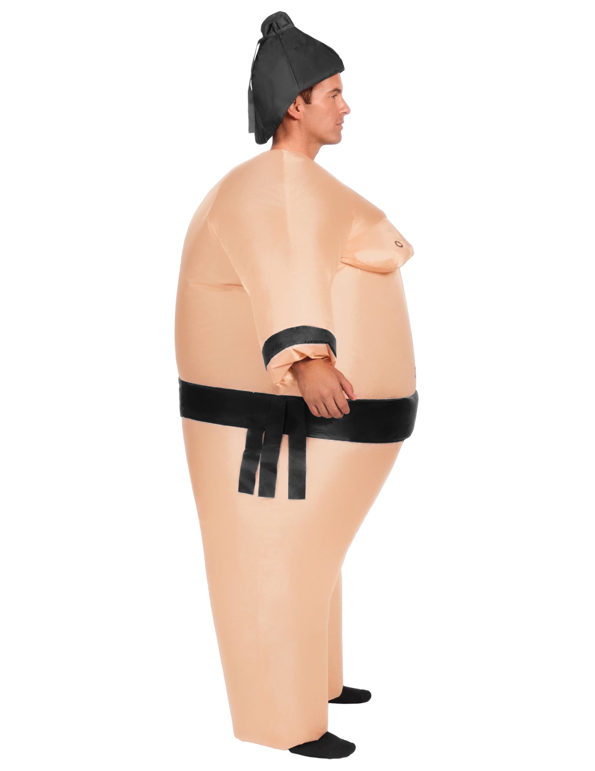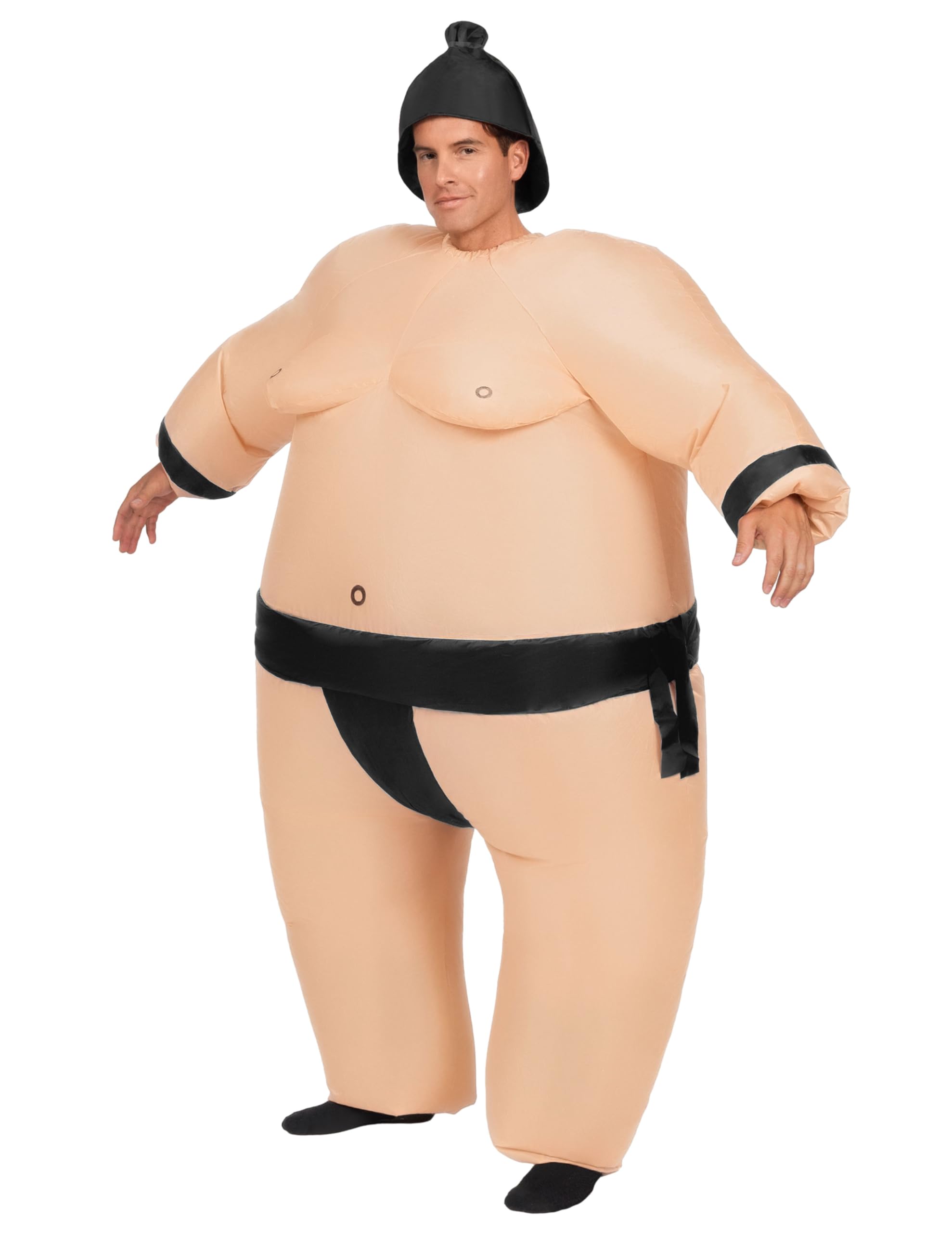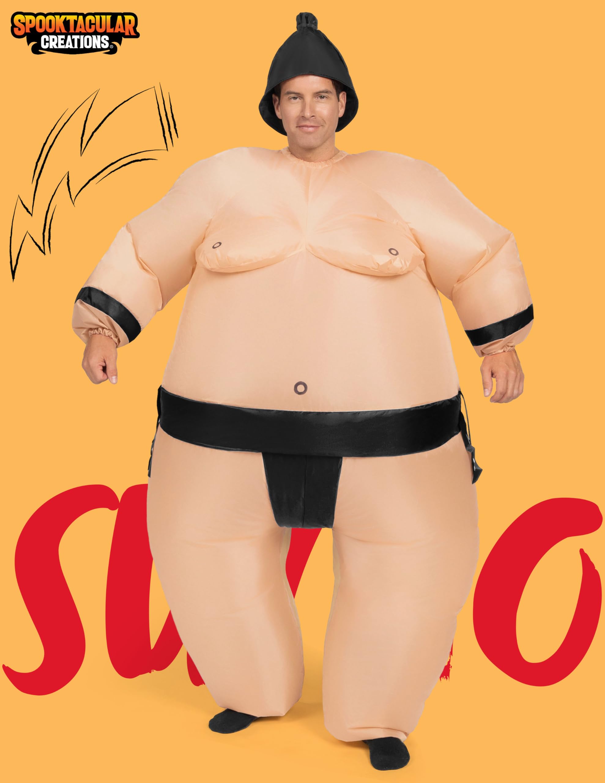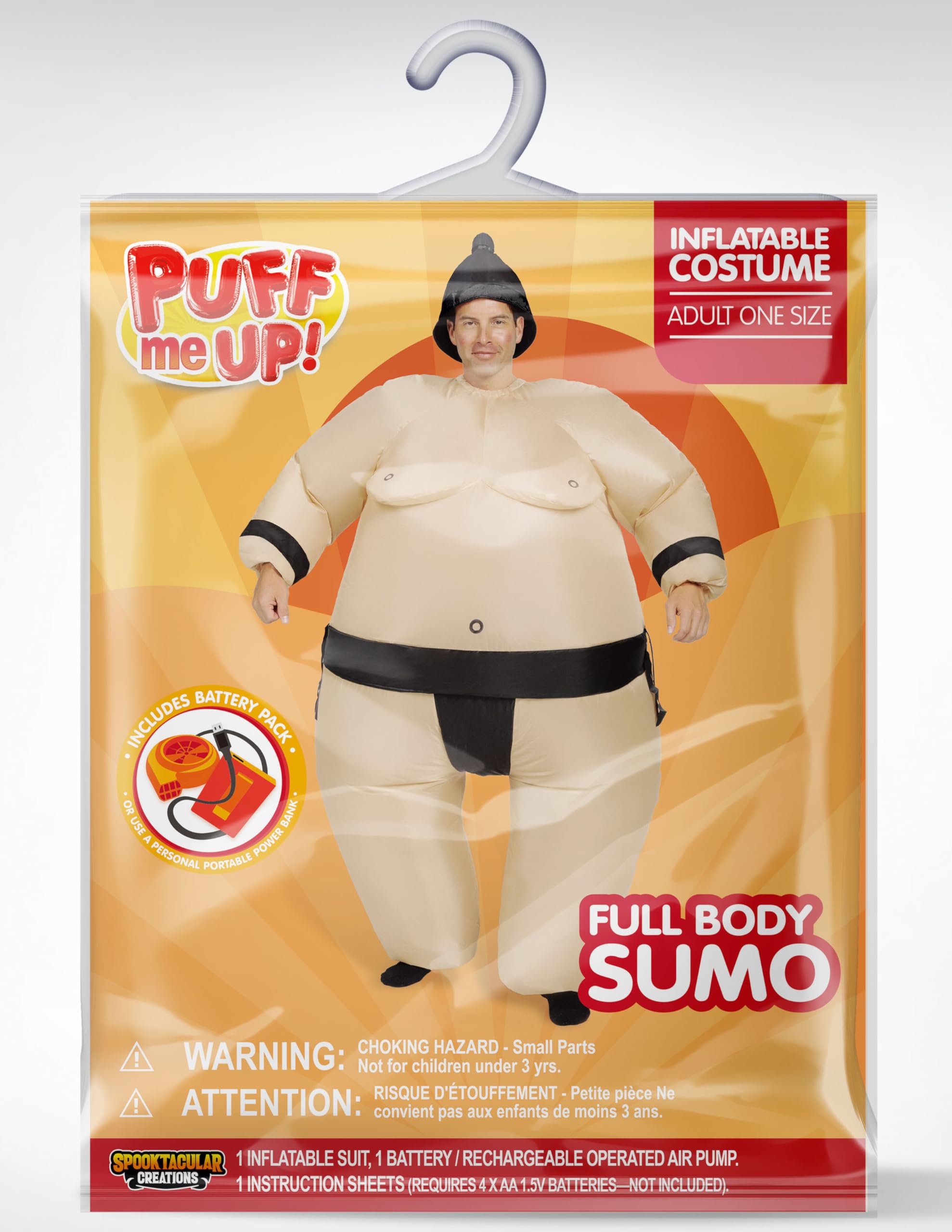 Complete Pack: This inflatable sumo wrestler costume set includes 1 inflatable suit, 1 hat, 1 Inflating tool, 1 instruction sheet, and 1 Power box (4AA batteries required, but not included). The suit is designed to look like a sumo wrestler, with a bold black loincloth mawashi belt.