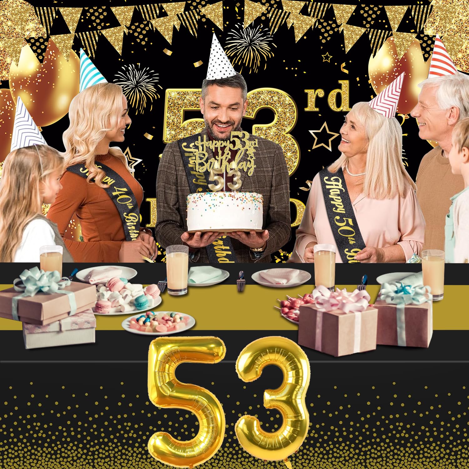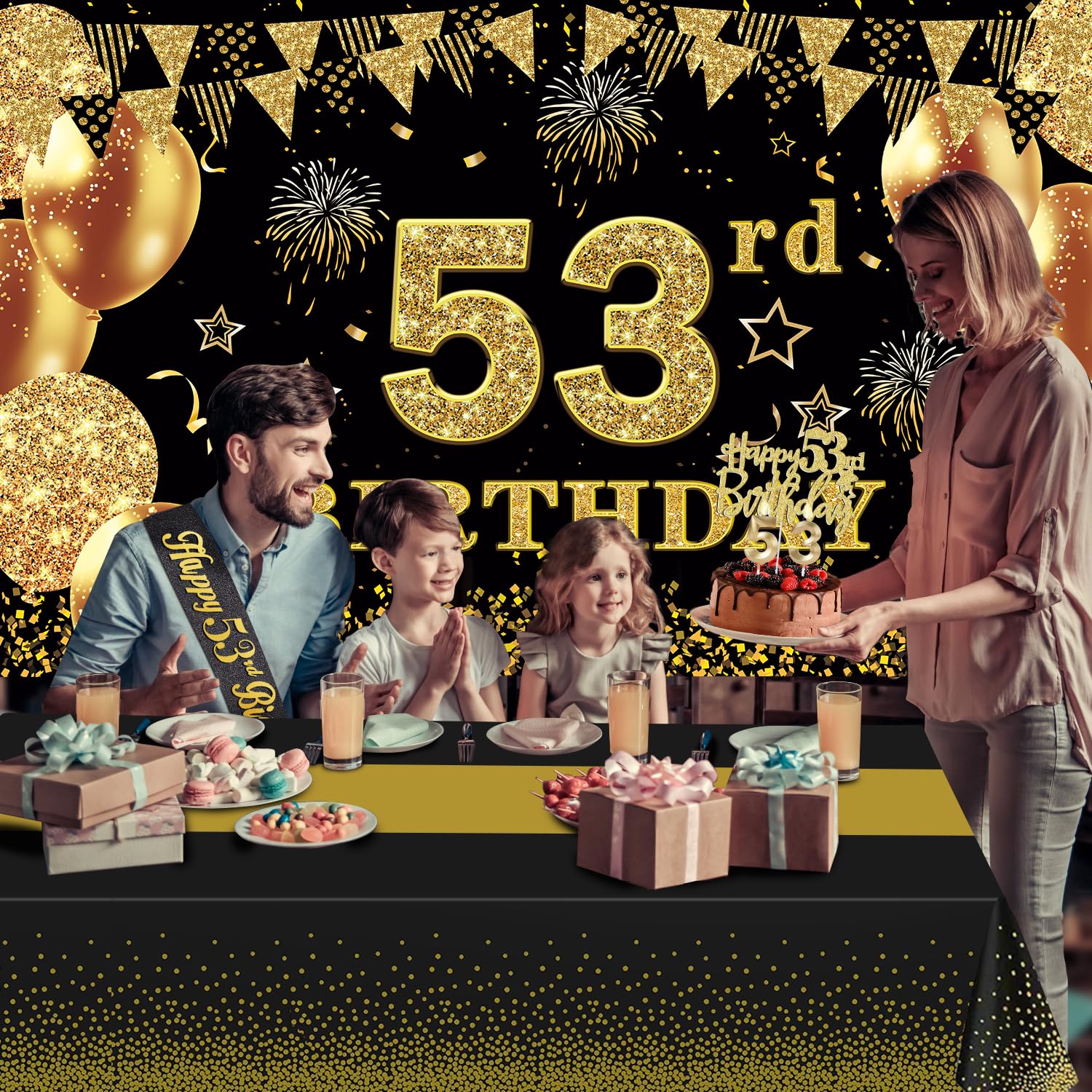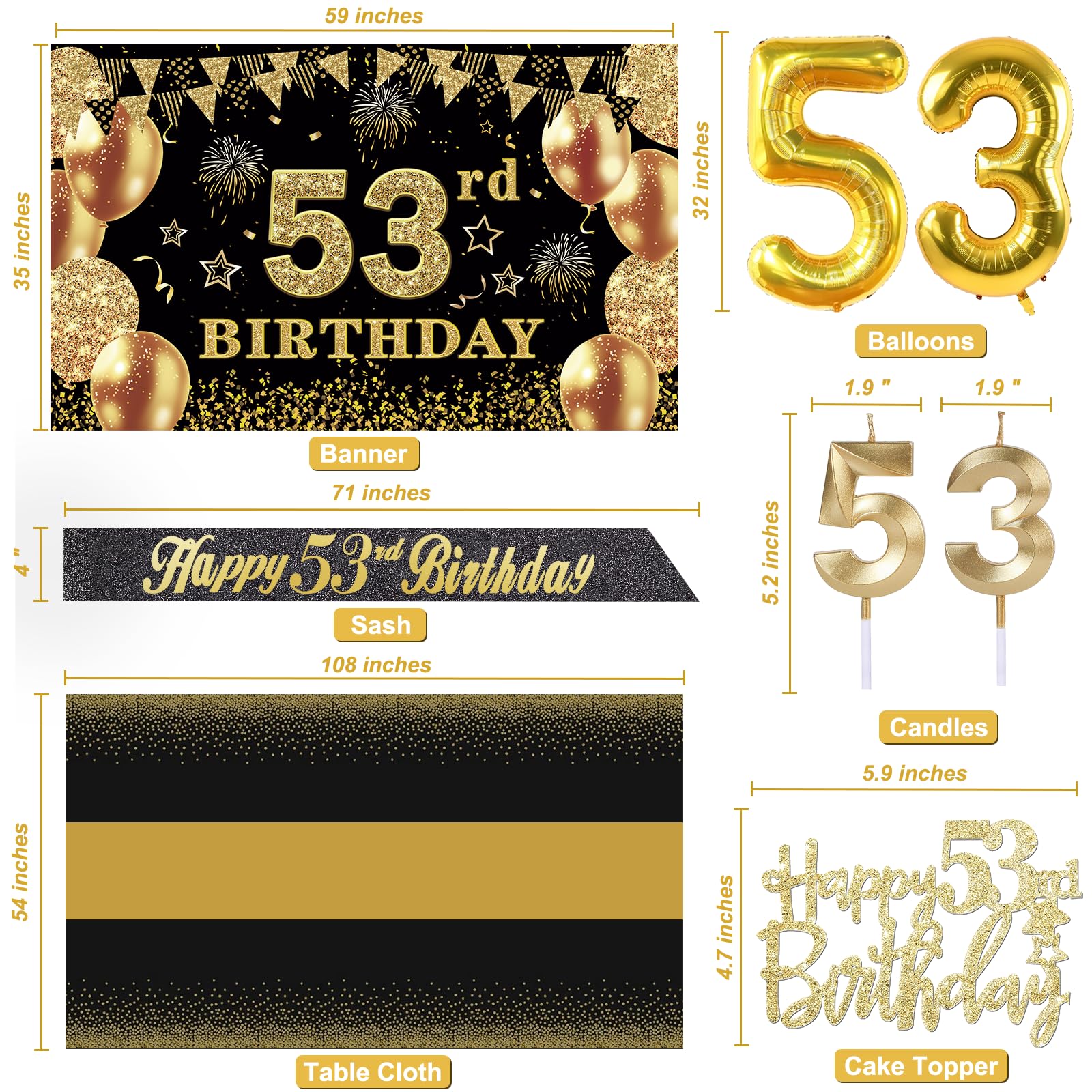 53rd Birthday Decorations Kit: Packing coming with Large 53rd Birthday Banner x 1pc, Big Gold 53rd Birthday Balloons x 1set, Black and Gold Table Cloth x 1pc, Black Glittery with Gold Foil Words Happy 53rd Birthday Sash x 1pc, Happy 53rd Birthday Cake Topper x 1pc, Gold Number 53 Candles x 1set. This Value Black and Gold Party Decorations Set Meet Your Every Needs and Expects in 53rd Birthday Milestone