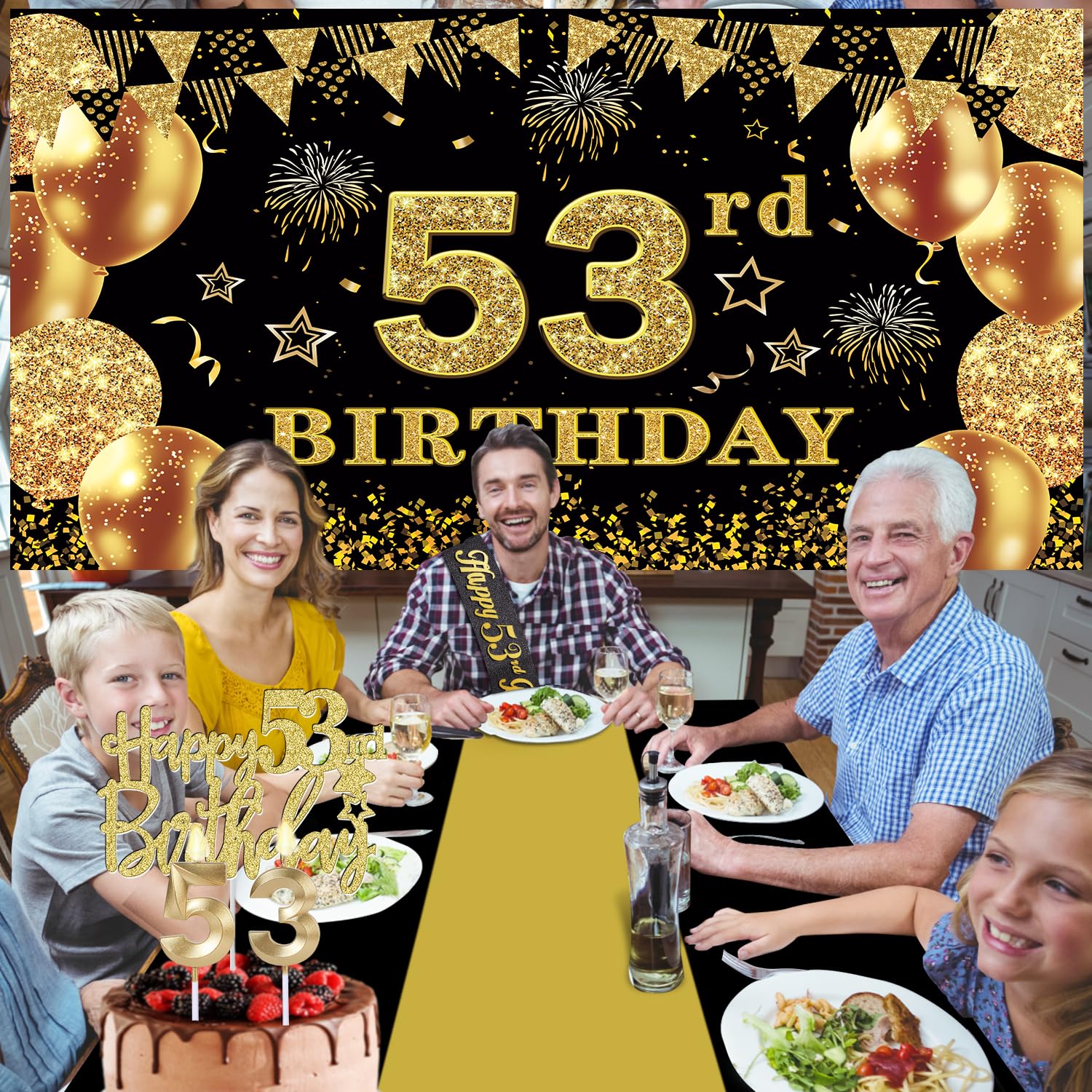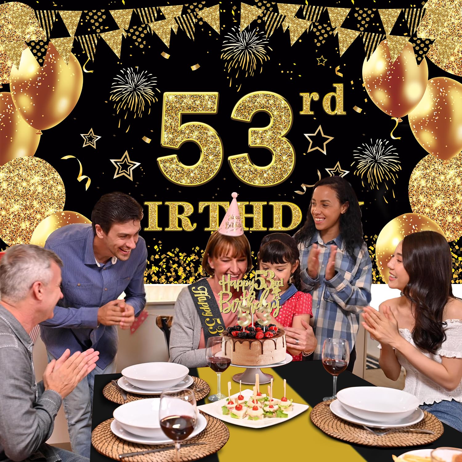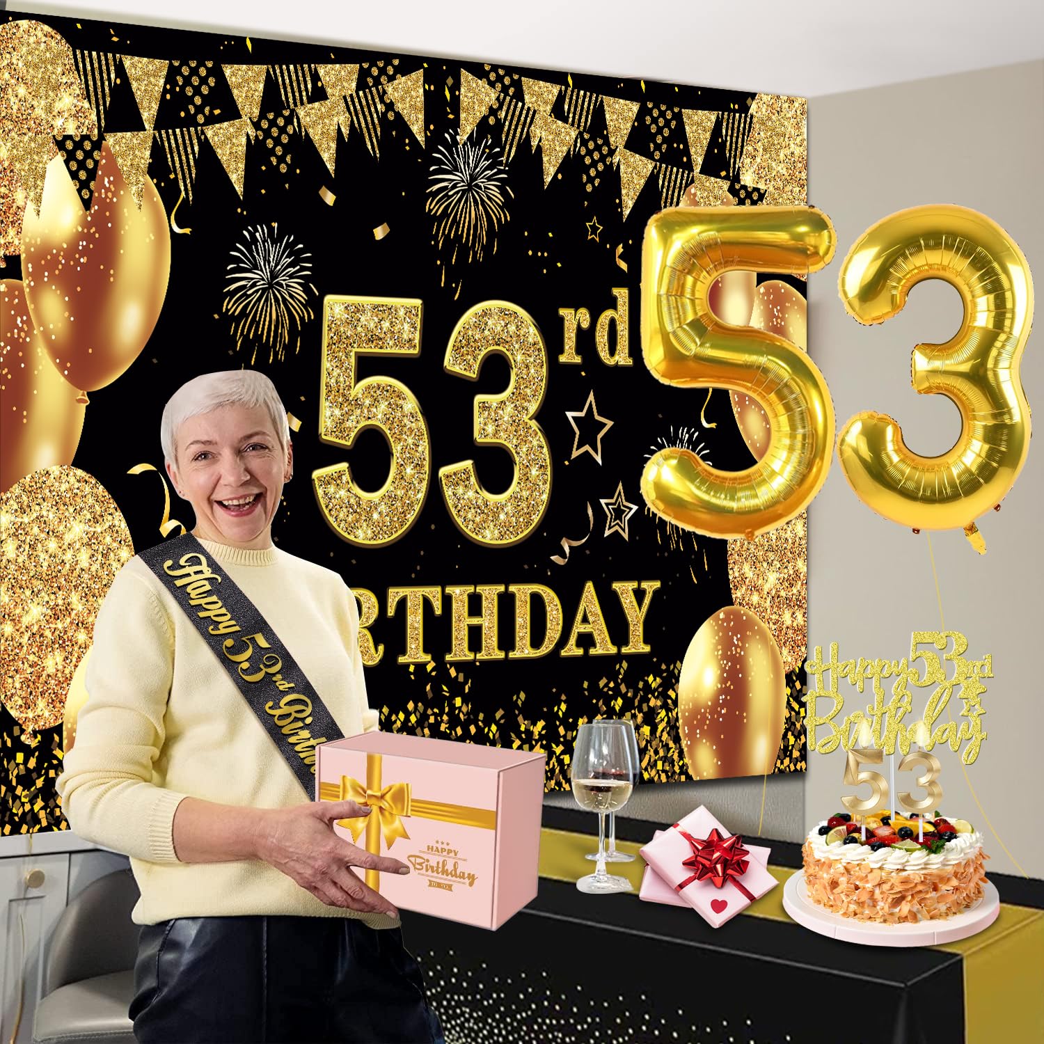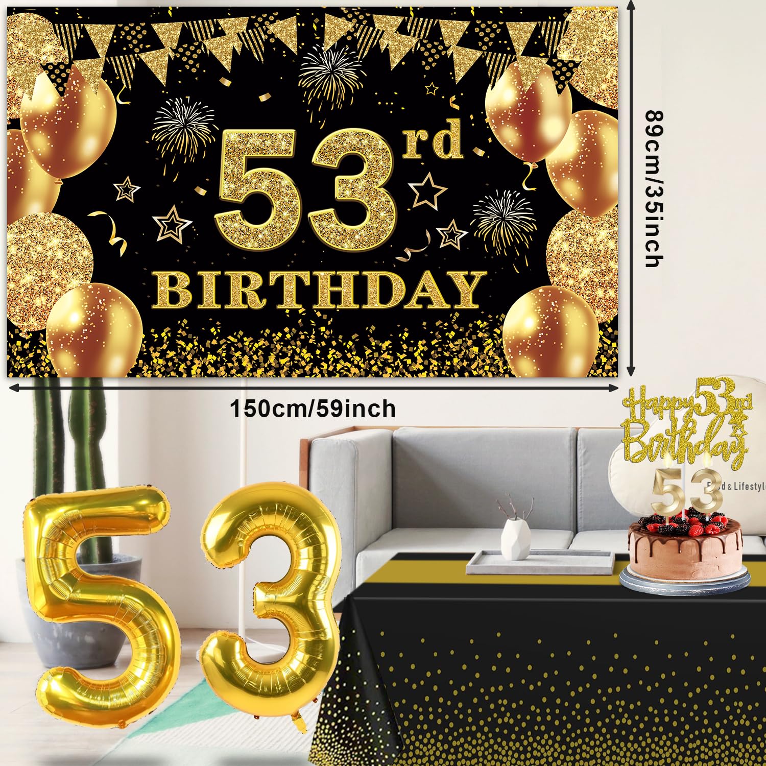 53rd Birthday Decorations Kit: Packing coming with Large 53rd Birthday Banner x 1pc, Big Gold 53rd Birthday Balloons x 1set, Black and Gold Table Cloth x 1pc, Black Glittery with Gold Foil Words Happy 53rd Birthday Sash x 1pc, Happy 53rd Birthday Cake Topper x 1pc, Gold Number 53 Candles x 1set. This Value Black and Gold Party Decorations Set Meet Your Every Needs and Expects in 53rd Birthday Milestone