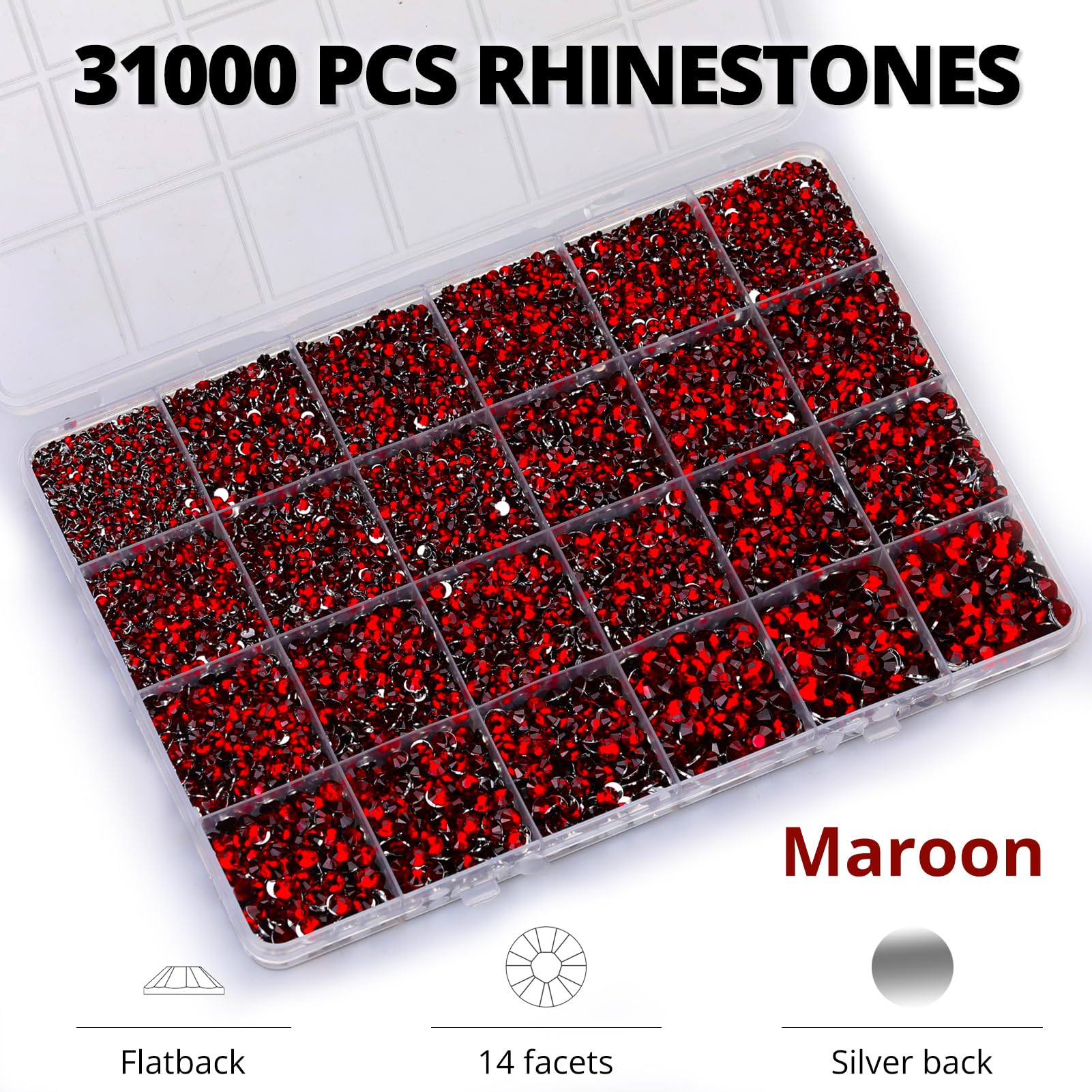 Package Content with Tool (pickup pen and manual) -- The bedazzler kit Package includes 1 maroon rinestones set with 24 grids, approx 31000 pcs of 2-6mm bling-out resin rhinestones